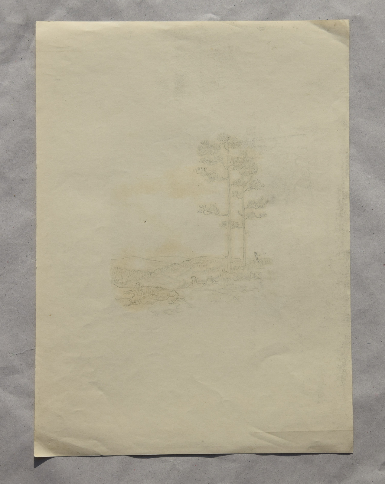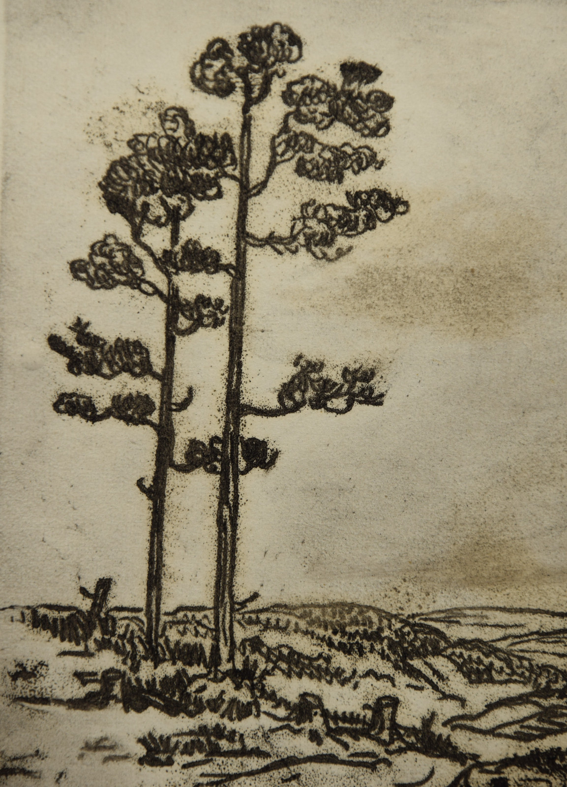 ohne Titel [weite, hügelige (Wald-)Landschaft, im Vordergrund zwei Kiefern]