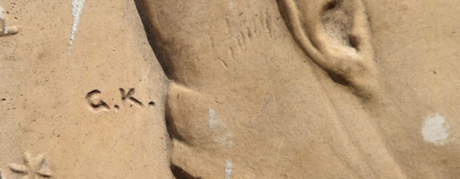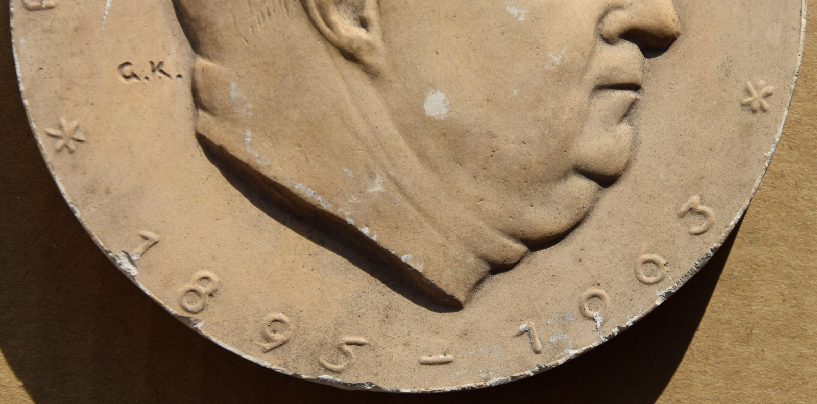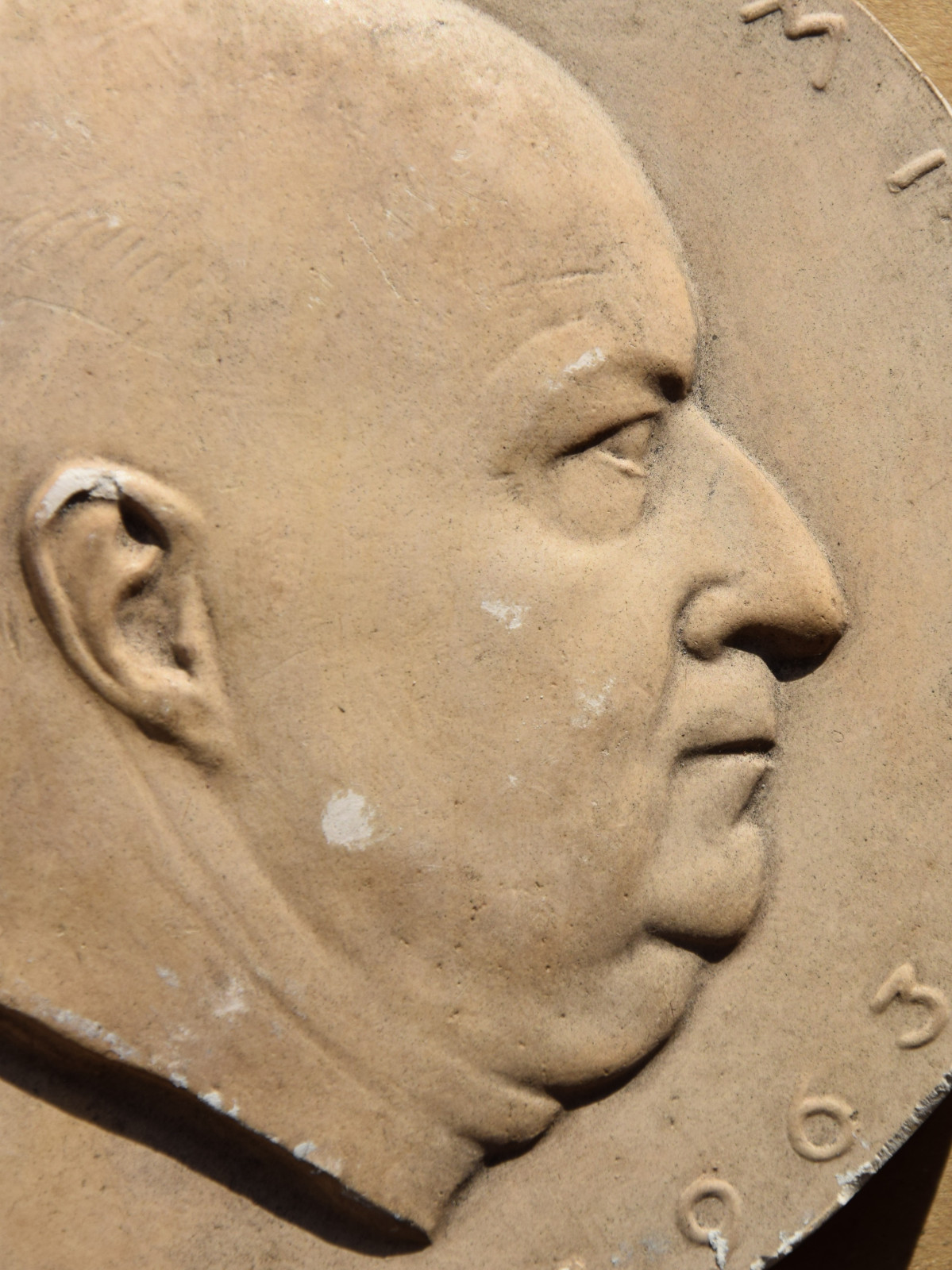 eine Gipsplakette (gespiegelt) datiert „[19]65“