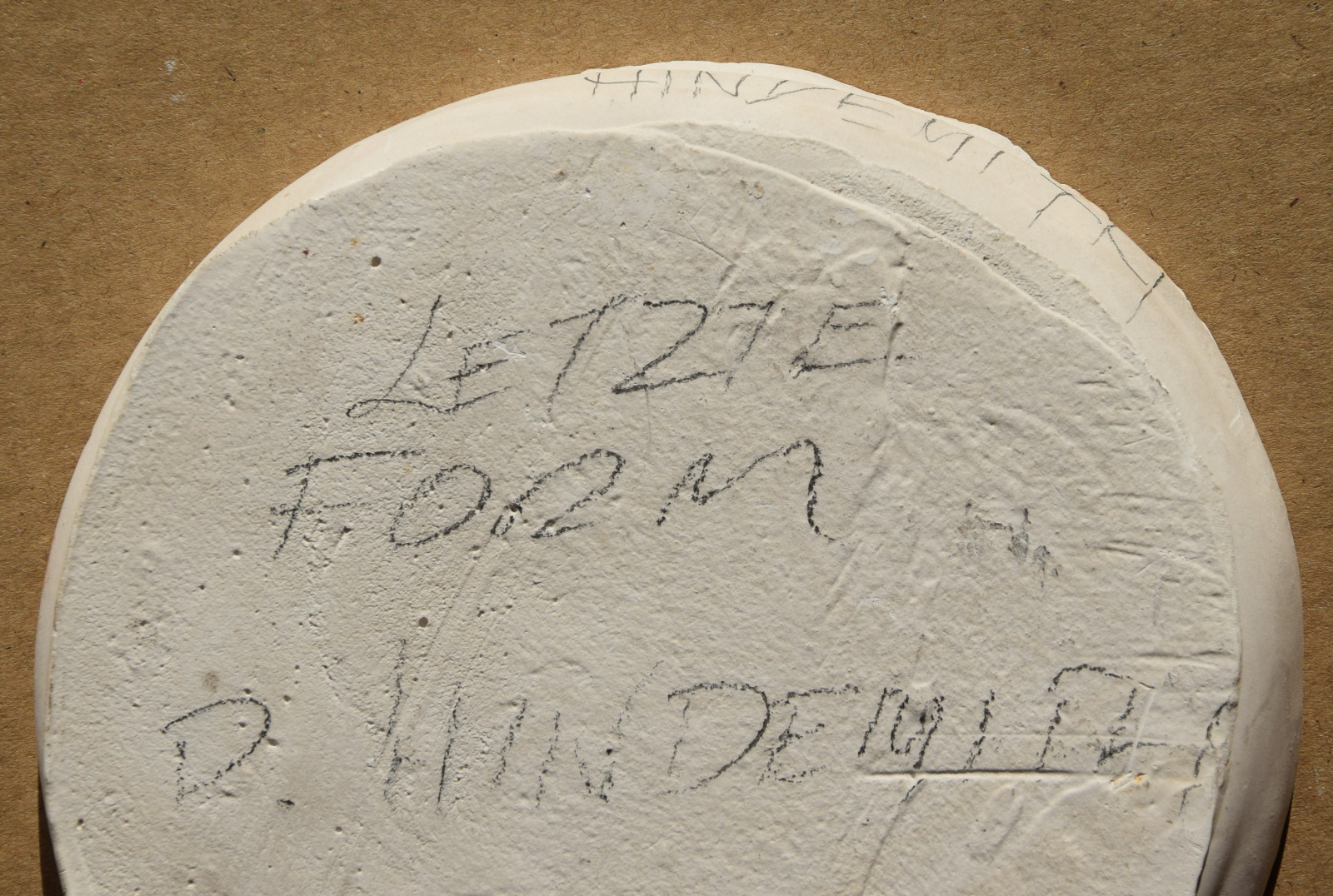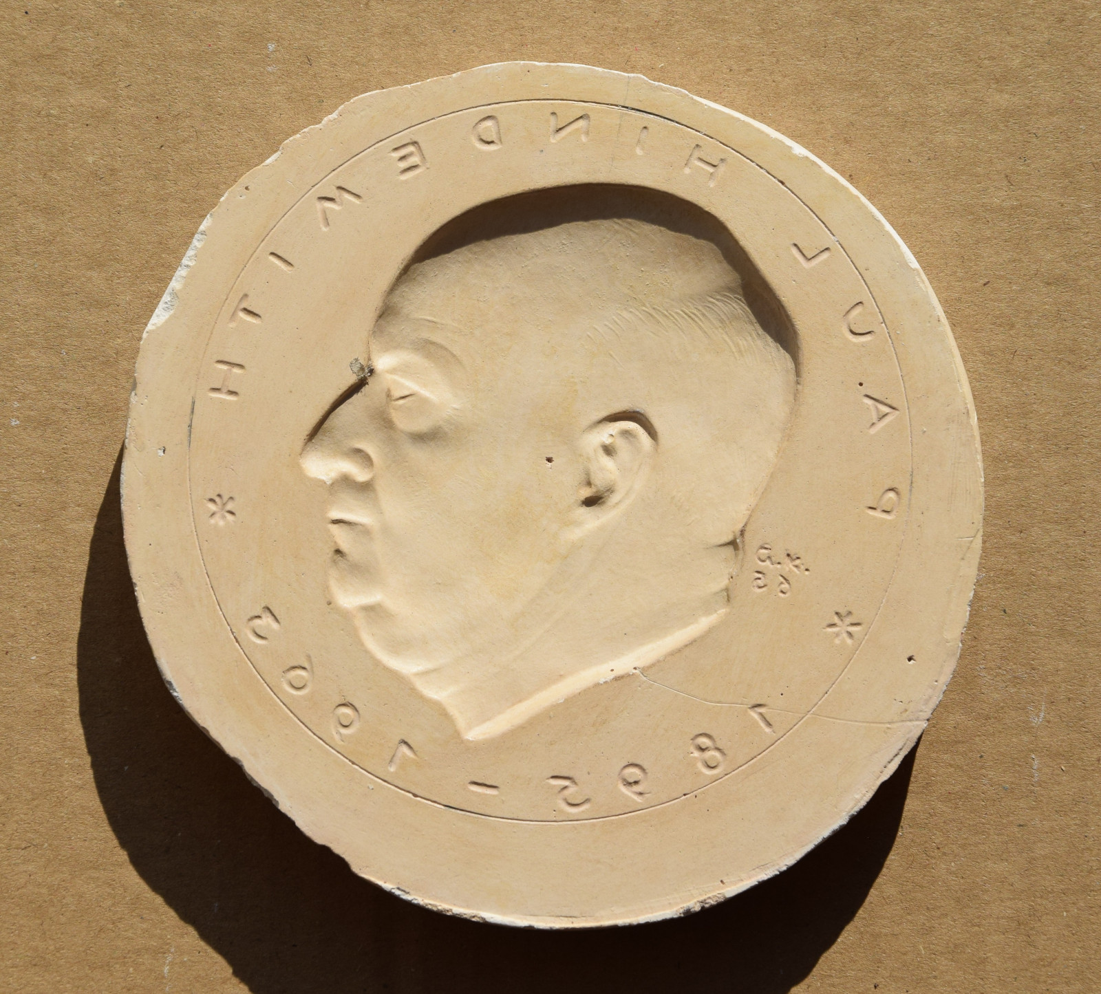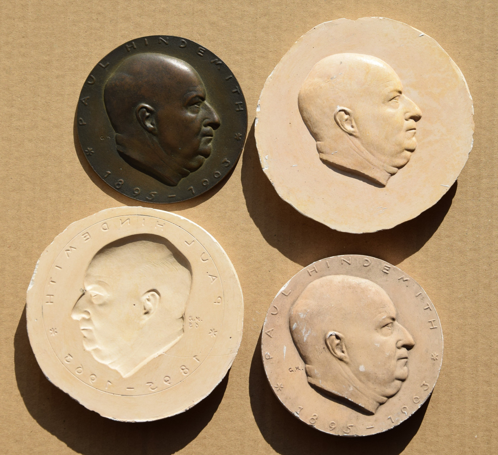 4 Plaketten in verschiedenen Zuständen, 1 x im Endzustand (Bronze) und 3 x Arbeitszustände (Gips, einmal davon verso bezeichnet „Letzte Form P. Hindemith“)