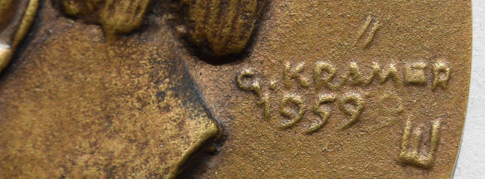 Georg Krämer schuf u. a. im Auftrag der Stadt Frankfurt Porträttafeln und -plaketten von u. a. Max Beckmann, Johann Friedrich Böhmer, Leo Frobenius, Paul Hindemith, Engelbert Humperdinck, Ottmar Mergenthaler, Wolfgang Amadeus Mozart, Friedrich Stoltze, Bruno Stürmer. Daneben gestaltete er bundesweit zahlreiche Brunnen im öffentlichen Raum, darunter u. a. in Sachsenhausen den “Affenbrunnen” (1958), den “Frau-Rauscher-Brunnen” (1961) und den “(Schwarze-)Ritter-Brunnen” (1964). Weiterhin gestaltete Krämer die “Römerplakette”, welche die Stadt Frankfurt a. M. an ehrenamtlich tätige Bürger verleiht. 1947 gestaltete er die “Goethemedaille”, welche die Stadt Frankfurt a. M. an “Dichter, Schriftsteller, Künstler und Wissenschaftler und andere Persönlichkeiten des kulturellen Lebens verleiht, die durch ihr schöpferisches Wirken einer dem Andenken Goethes gewidmeten Ehrung würdig sind”.
