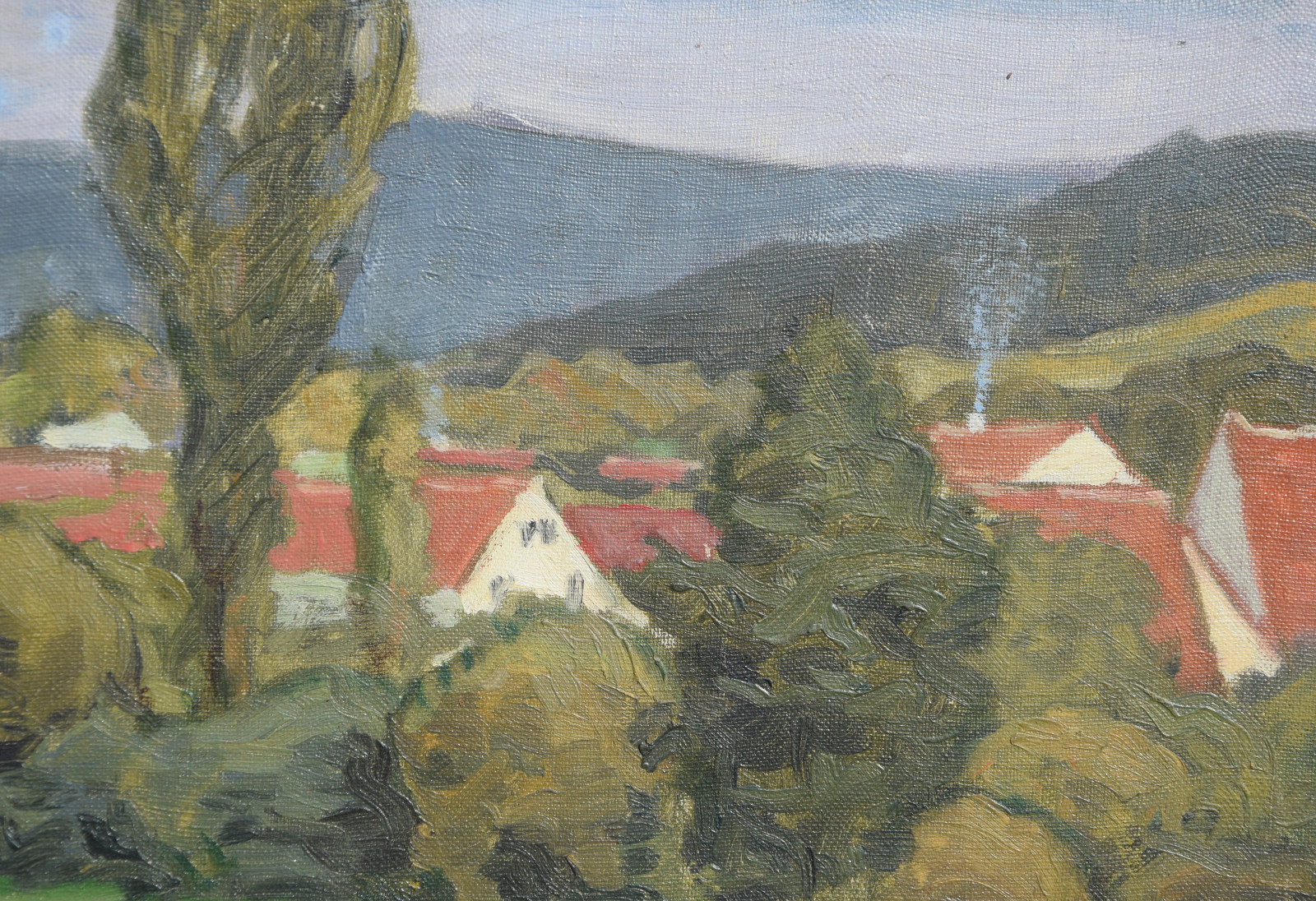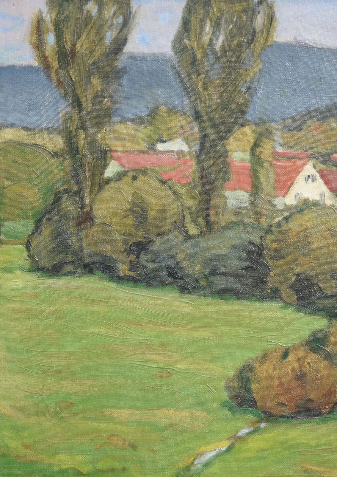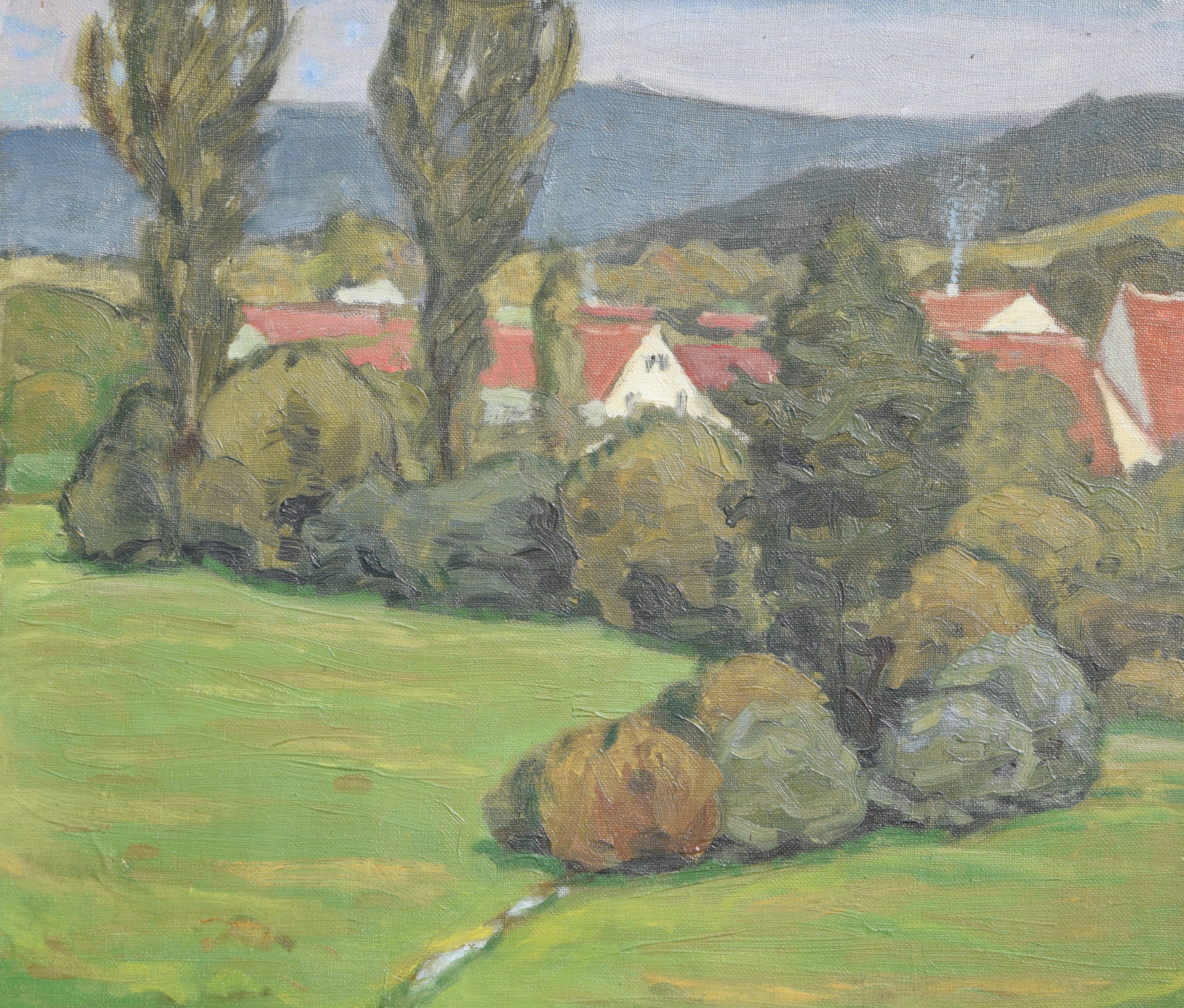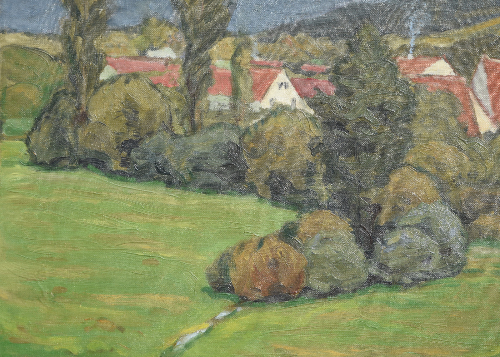 Ein kleines Bächlein schlängelt sich aus dem Vordergrund in Richtung des Ortes, doch bereits nach kurzer Strecke verschwindet er hinter dem dichten, satten Grün der Bäume und Büsche. Dahinter liegt der Ortsrand, wobei farblich gesehen sich besonders die rötlichen Dächer abheben. Mitunter kommt zarter Rauch aus den Schornsteinen, was dem Ganzen eine angenehm heimelige Stimmung verleiht. Weit hinter dem Dorf liegen dunkelgrüne und dunkelblaue Hügelzüge.