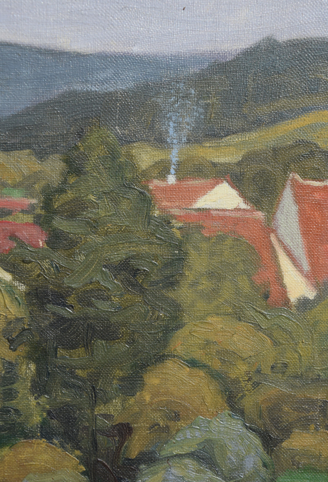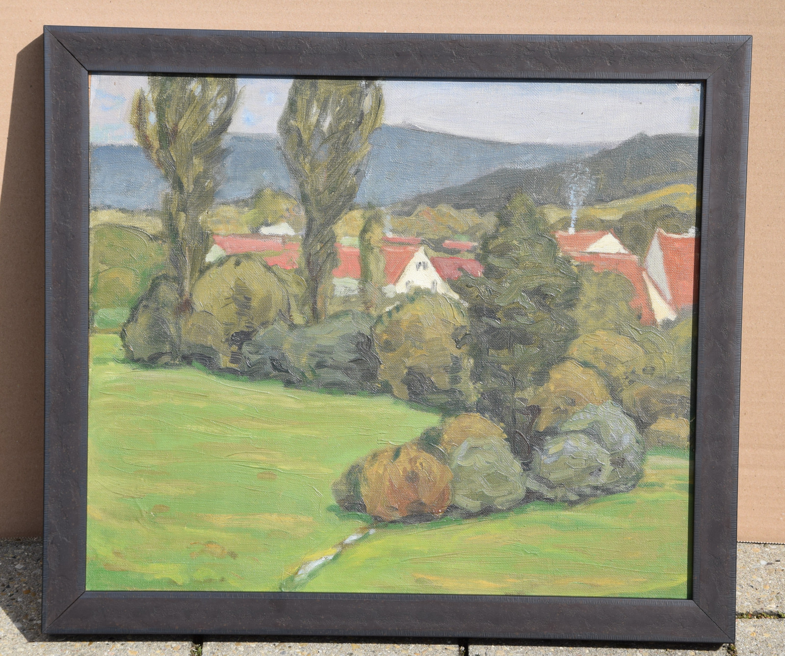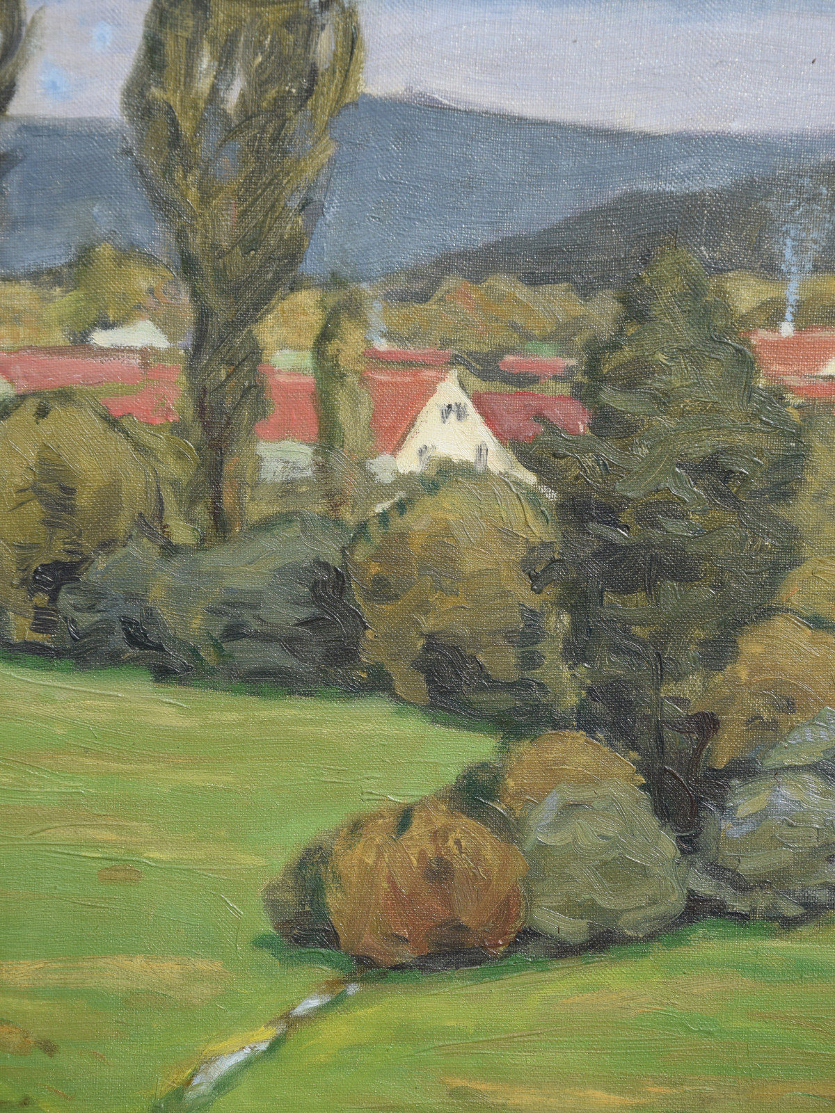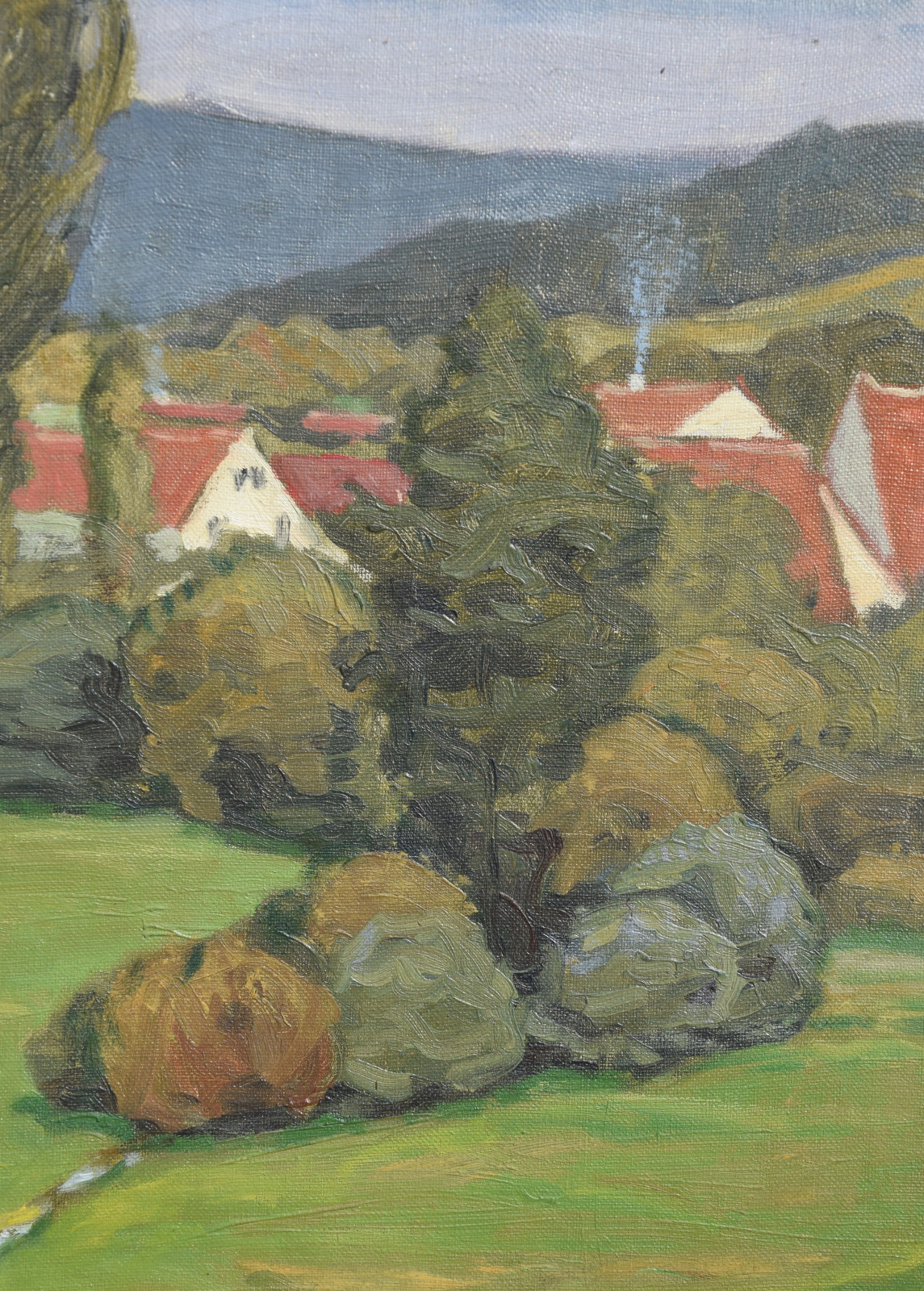 Ein kleines Bächlein schlängelt sich aus dem Vordergrund in Richtung des Ortes, doch bereits nach kurzer Strecke verschwindet er hinter dem dichten, satten Grün der Bäume und Büsche. Dahinter liegt der Ortsrand, wobei farblich gesehen sich besonders die rötlichen Dächer abheben. Mitunter kommt zarter Rauch aus den Schornsteinen, was dem Ganzen eine angenehm heimelige Stimmung verleiht. Weit hinter dem Dorf liegen dunkelgrüne und dunkelblaue Hügelzüge.
