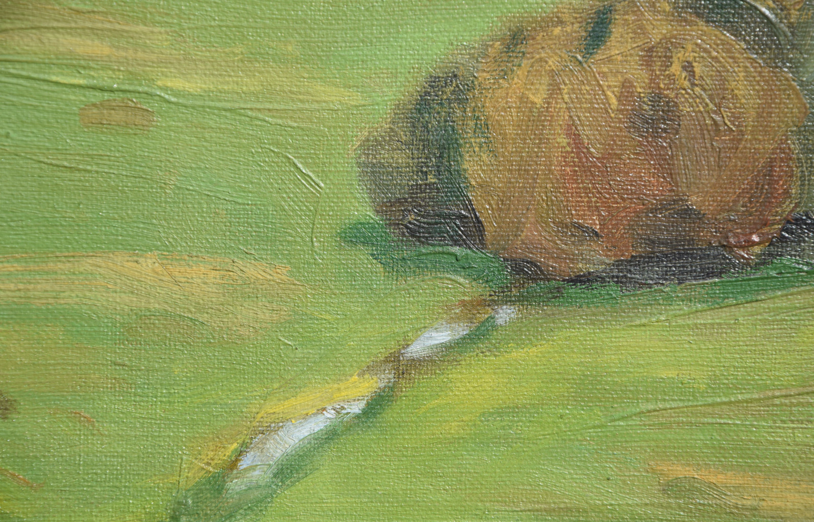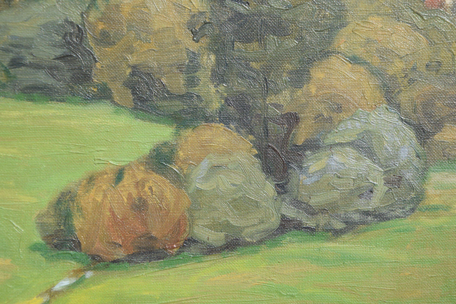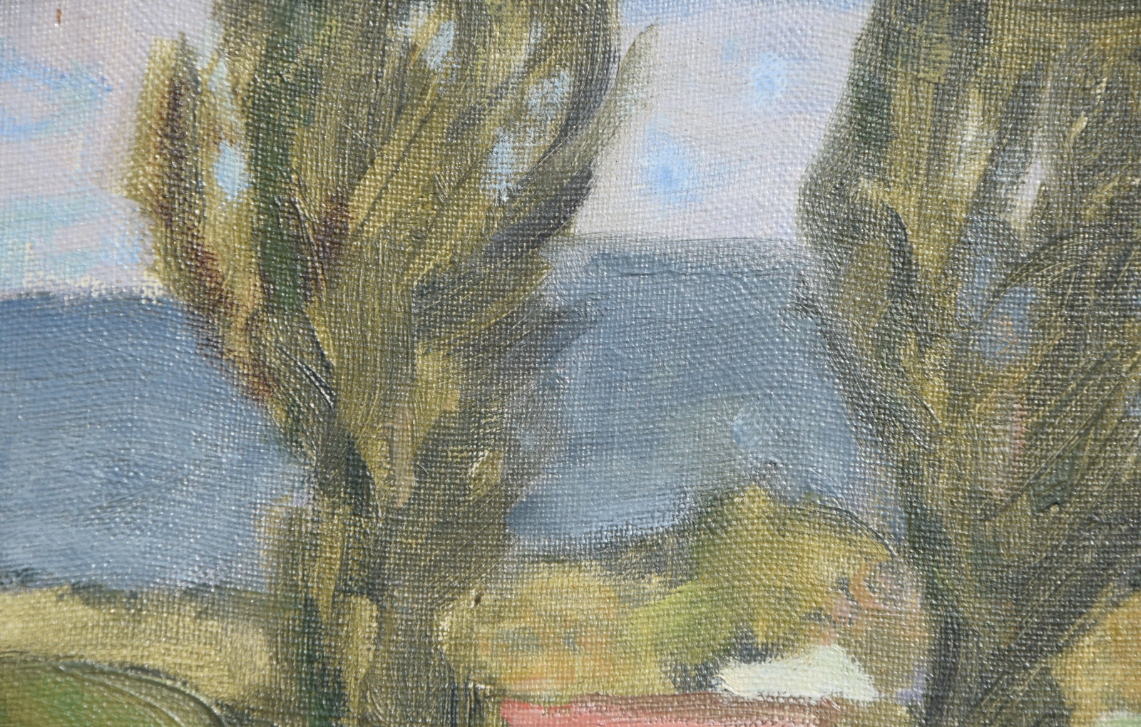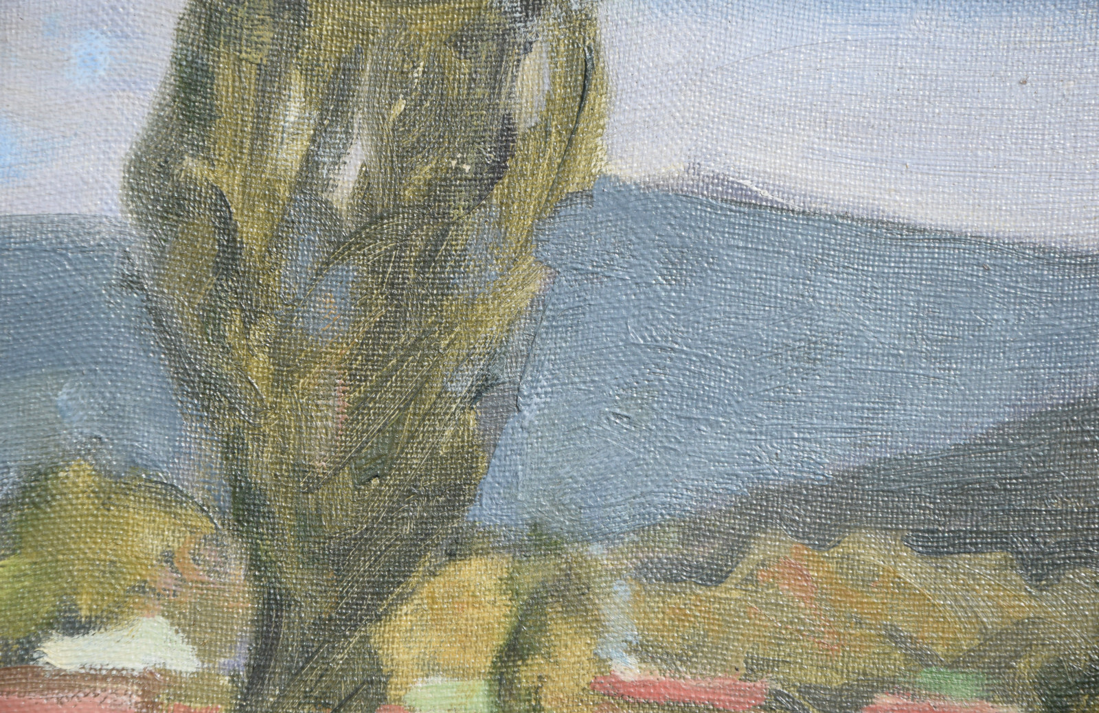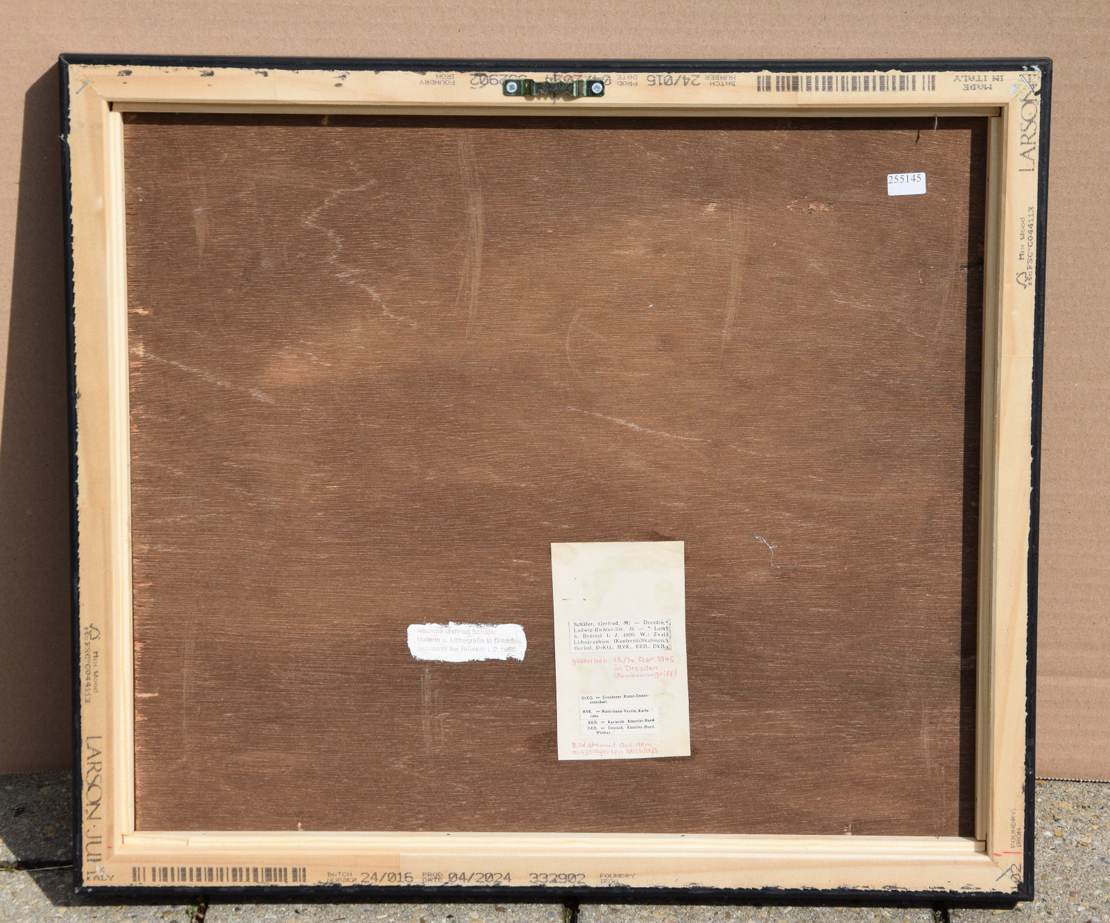 Leinwand aufgezogen auf Platte; partiell sehr leicht fleckig; Leinwand in Ecke oben rechts kleines Einstichlöchlein; linker Rand der Leinwand sehr leicht uneben zugeschnitten