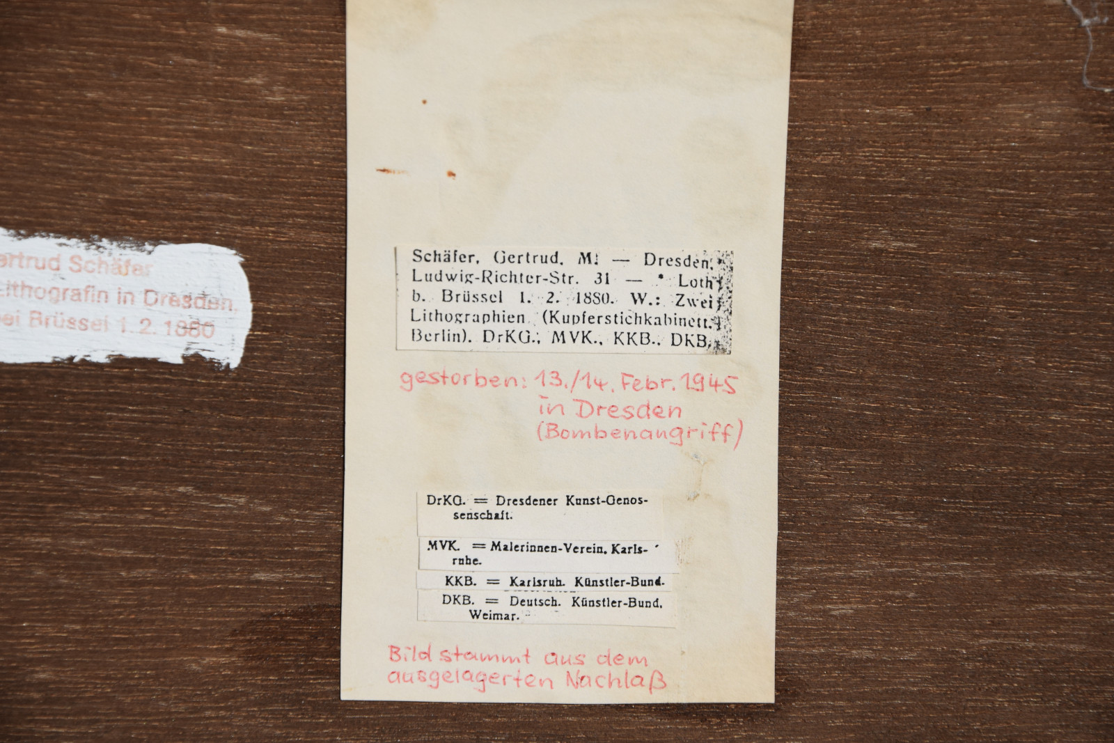 Gerade in der Zeit um 1910-20 war Gertrud Schäfer eine deutschlandweit bekannt Künstlerin, die sich auch zu vernetzen verstand. So war sie u. a. Mitglied im Malerinnen-Verein Karlsruhe, im Künstlerbund Weimar und im Deutschen Künstlerbund.