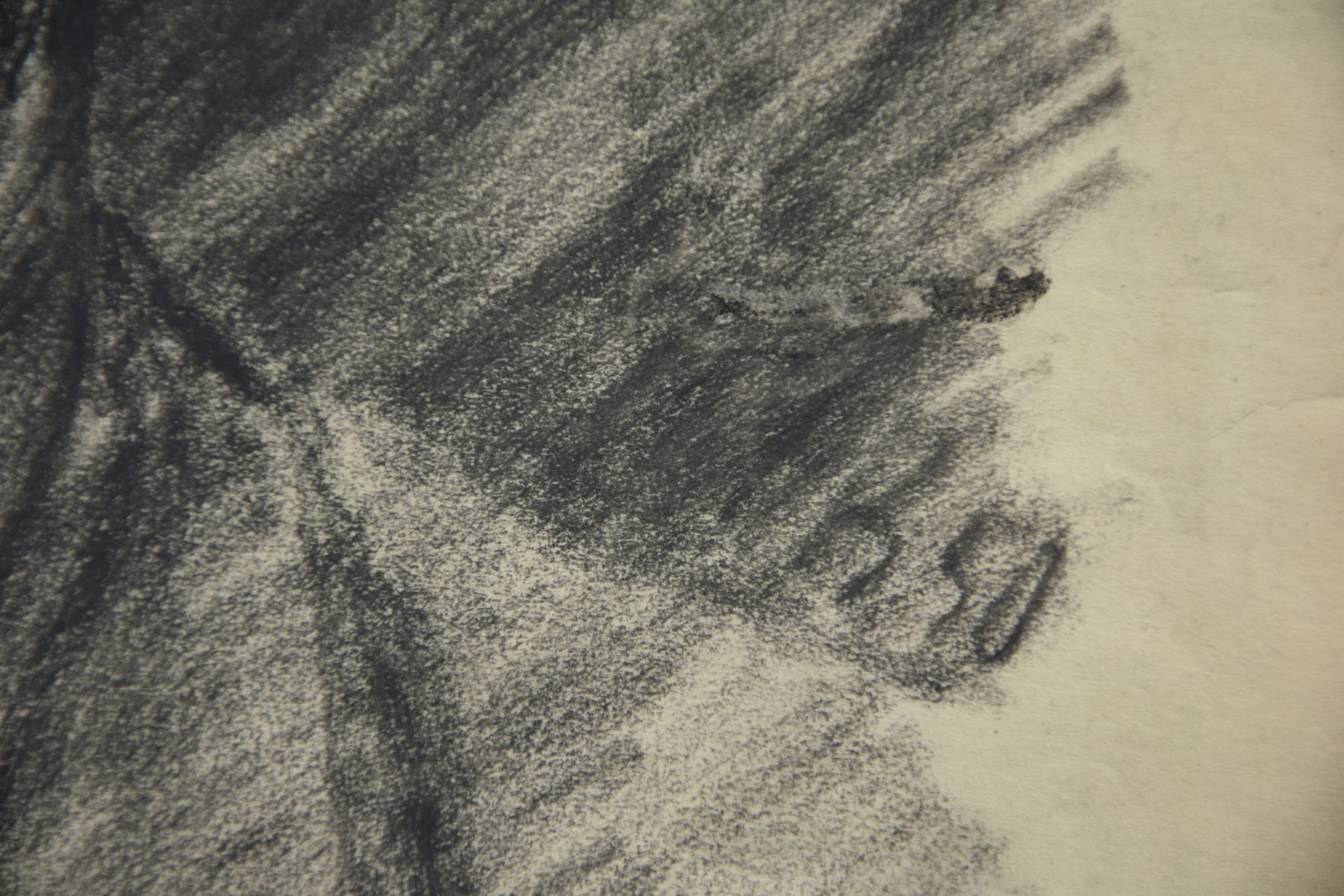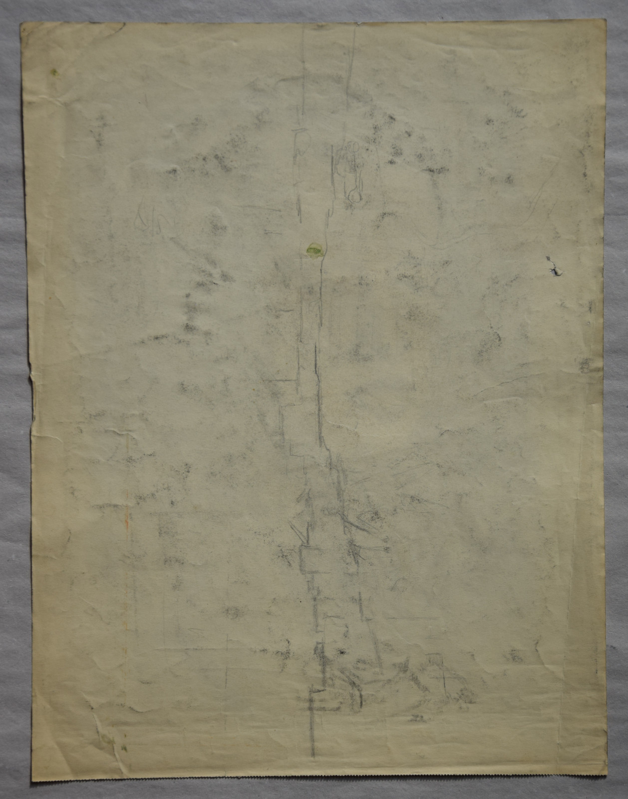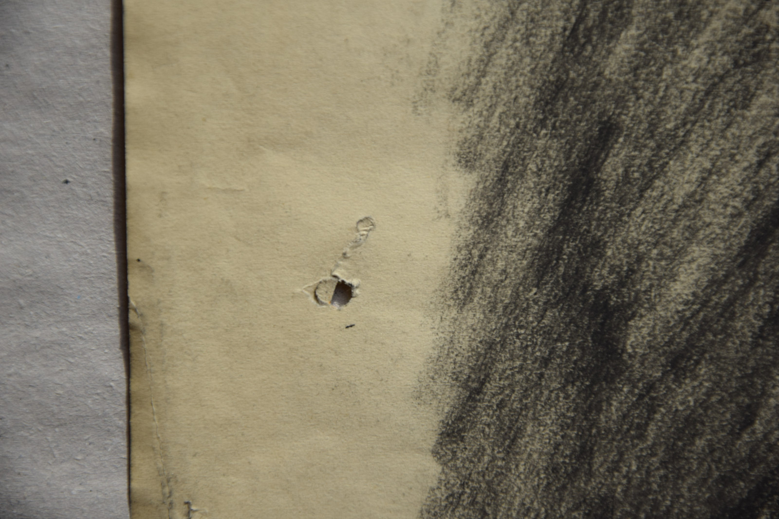 durchgehend Druckstellen im Blatt; Ecken etwas bestoßen; im linken Blattbereich unten mit diagonaler Knickspur (nicht im Bildteil); oberer Rand rechts mit Einriss (nicht im Bildteil, etwa 2cm); am linken Rand oben kleines Löchlein (etwa 3x3mm); leicht fleckig; verso fleckig und Lagerspuren