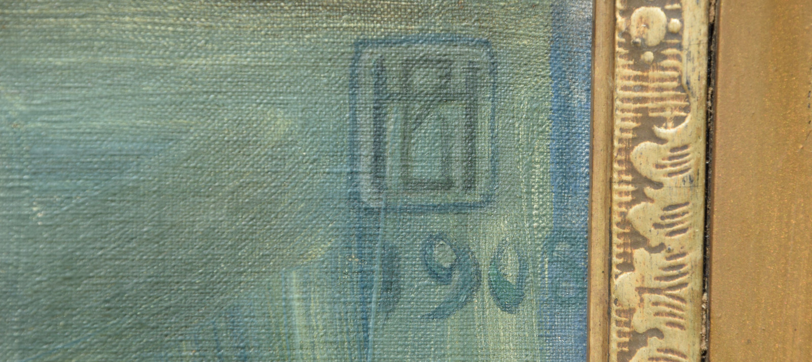 oben rechts blau umrandet monogrammiert „HB“, sowie verso auf dem Keilrahmen nachträglich von fremder Hand (Sohn/Tochter der Dargestellten) in Blei mit irrigem Vornamen bezeichnet „Helene[sic!] Brinckmann“