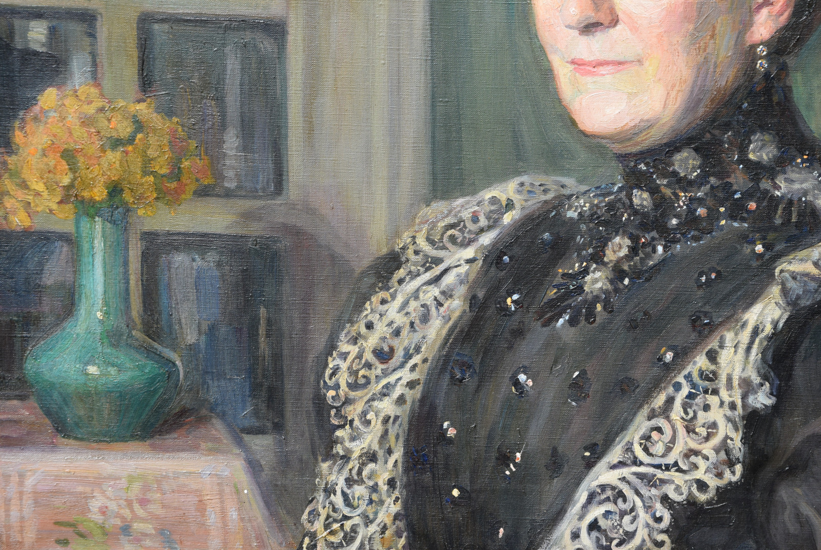 Als Betrachter sehen wir eine ältere, elegante Dame in einem Zimmer. Links im Hintergrund ein Fenster und davor ein mit einer hellroten Decke bedeckter Tisch samt reizvoll wirkender bauchiger Blumenvase. Die Dargestellte zeigt sich in Dreiviertelansicht, in aufrechter Sitzhaltung, den Betrachter anblickend. Man darf wohl die überaus elegante, dunkle Kleidung als Trauerkleidung verstehen, was darauf hindeuten könnte, dass die Porträtierte vor kurzer Zeit ihren Mann verlor.