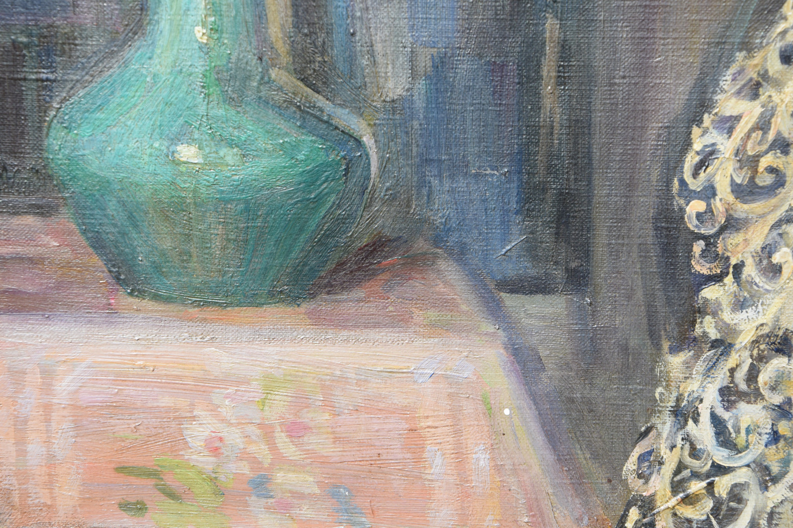 Arbeiten der Künstlerin tauchen nur seltenst auf und wenn dies einmal der Fall ist, dann handelt es sich dabei in aller Regel um Druckgrafiken. Dieses Portrait stellt auch vor diesem Hintergrund sicherlich ein Rarissimum dar.