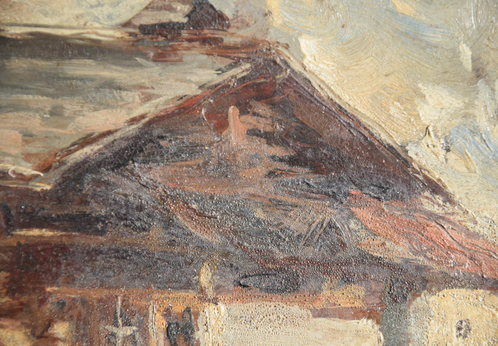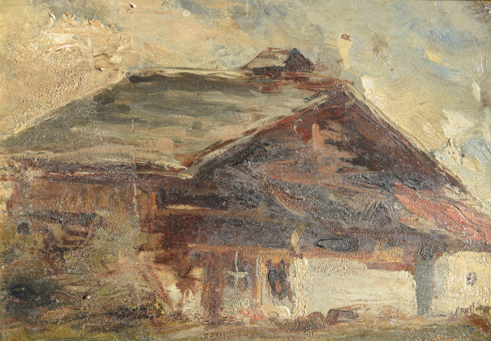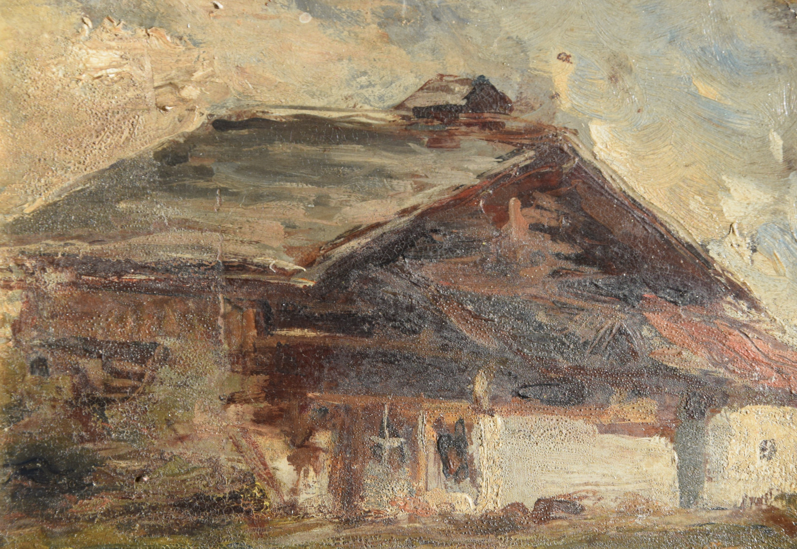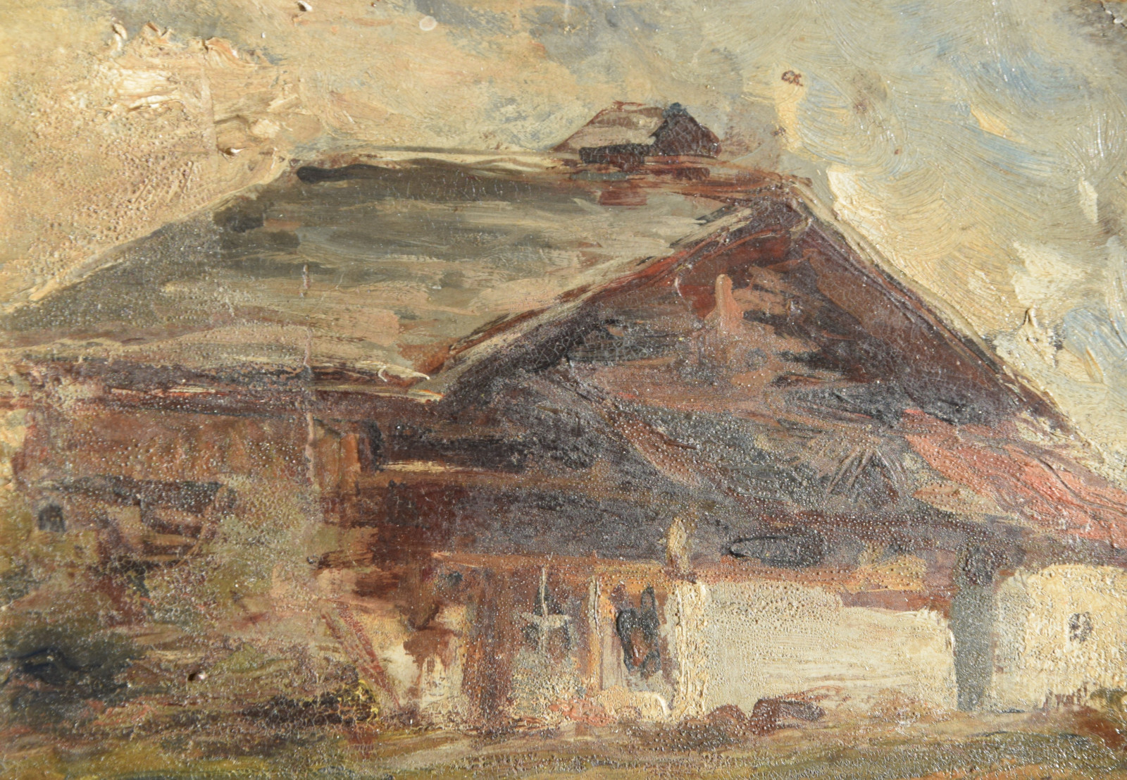 Der Künstler zeigt hier einen dunkel gehaltenen, dichten Blick auf ein Haus bzw. eine Berghütte, die man sicherlich in die alpine Gegend lokalisieren darf. Im Hintergrund zeigen sich diffuse Gebirgsandeutungen von Grau und Weiß.