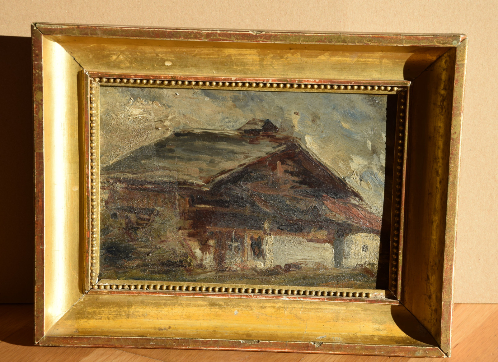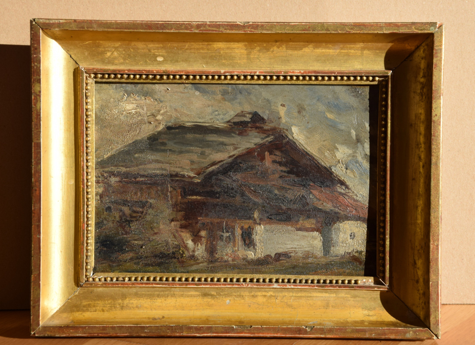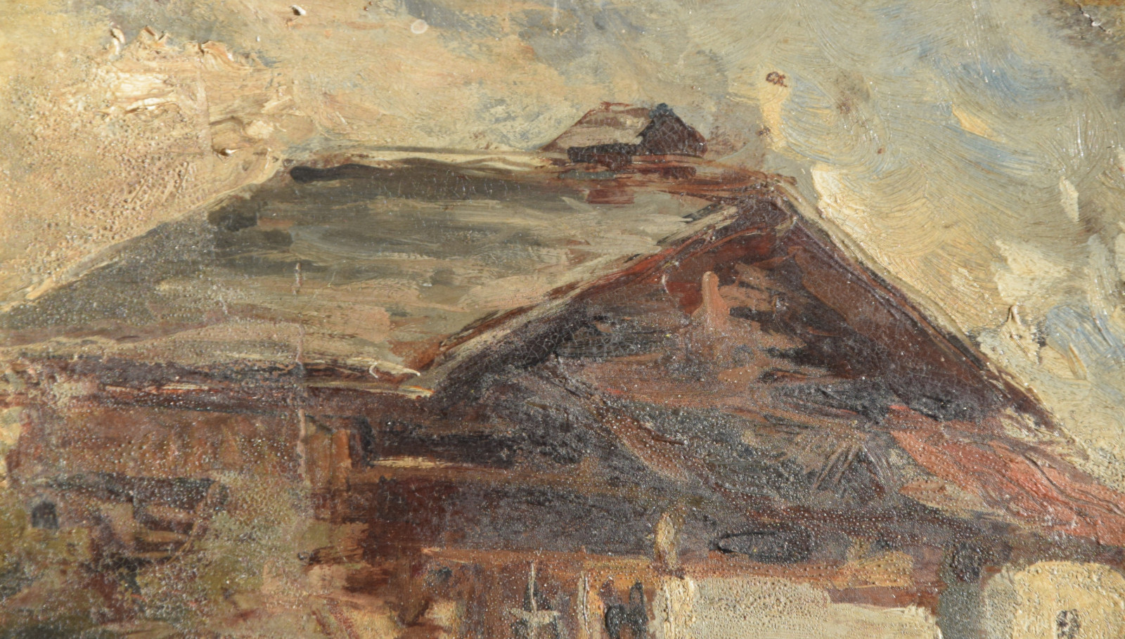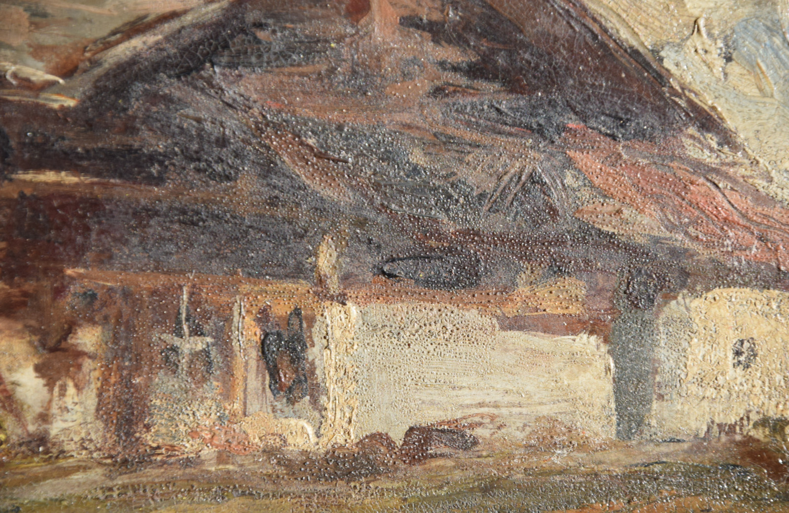 Der Künstler zeigt hier einen dunkel gehaltenen, dichten Blick auf ein Haus bzw. eine Berghütte, die man sicherlich in die alpine Gegend lokalisieren darf. Im Hintergrund zeigen sich diffuse Gebirgsandeutungen von Grau und Weiß.