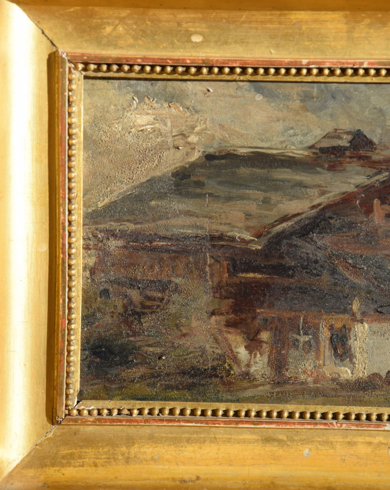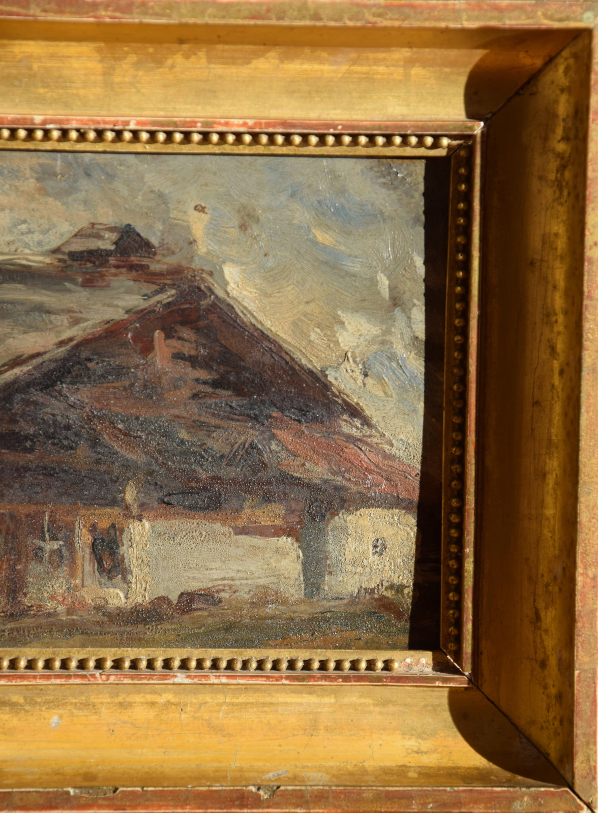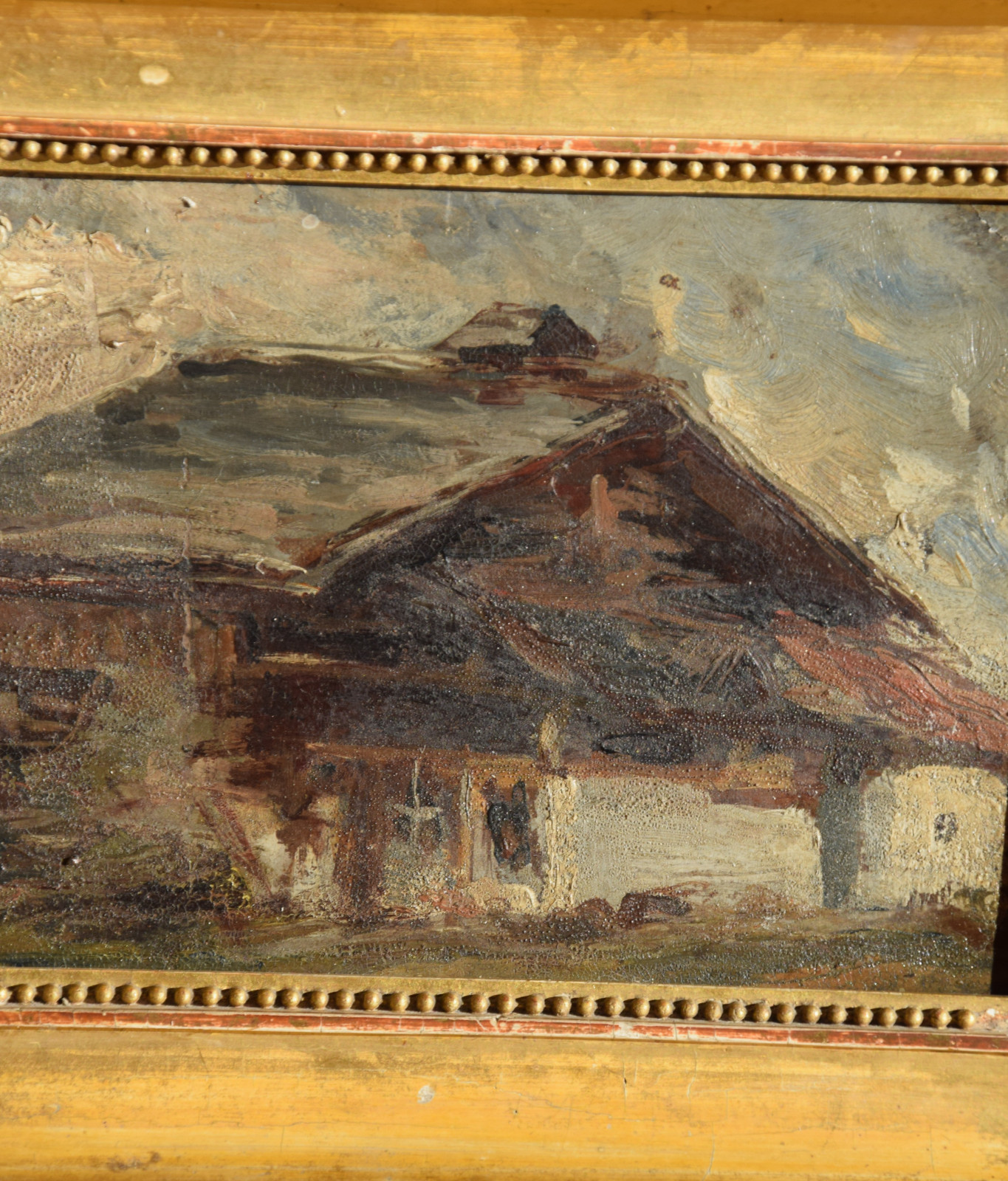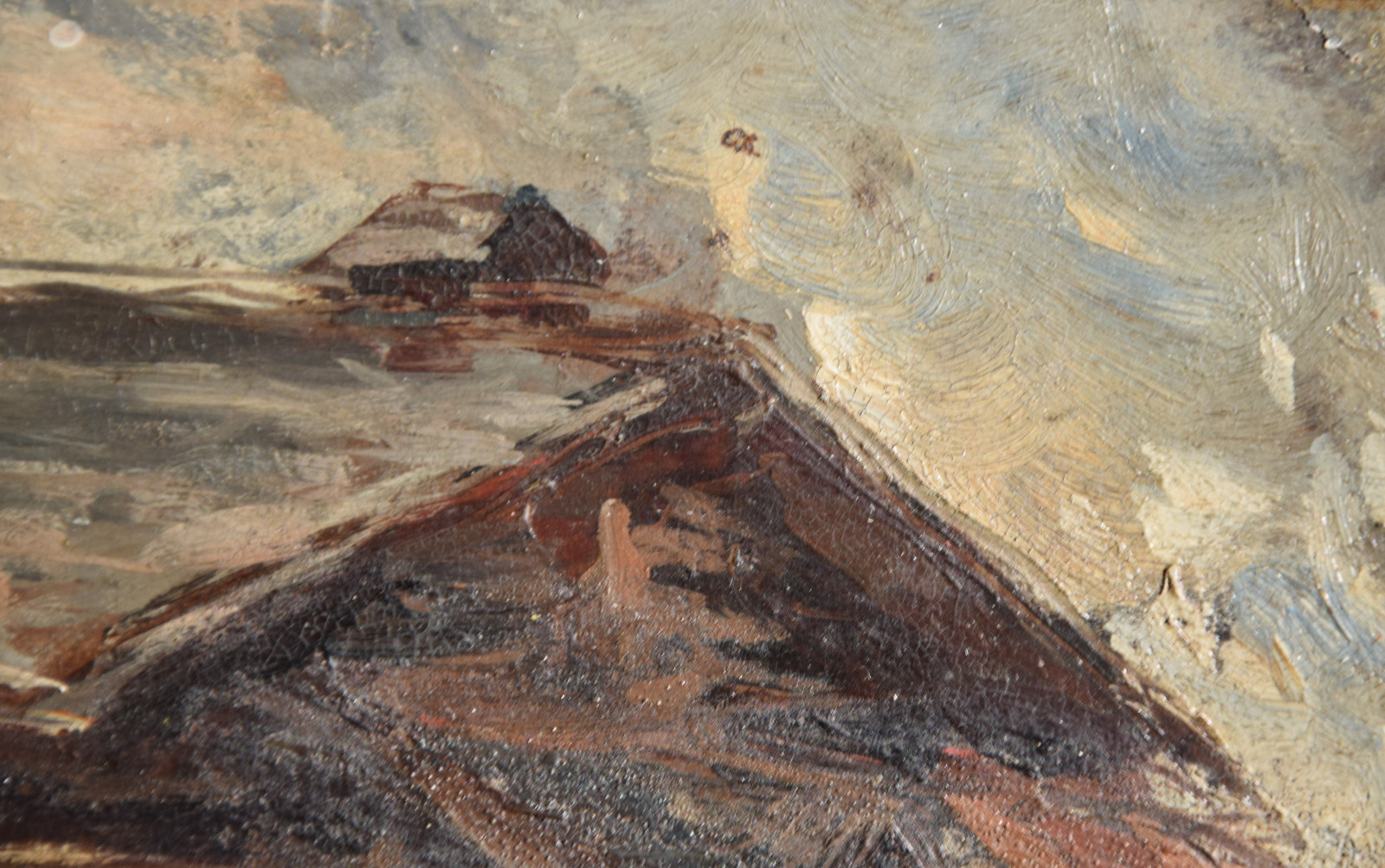 Der Künstler zeigt hier einen dunkel gehaltenen, dichten Blick auf ein Haus bzw. eine Berghütte, die man sicherlich in die alpine Gegend lokalisieren darf. Im Hintergrund zeigen sich diffuse Gebirgsandeutungen von Grau und Weiß.