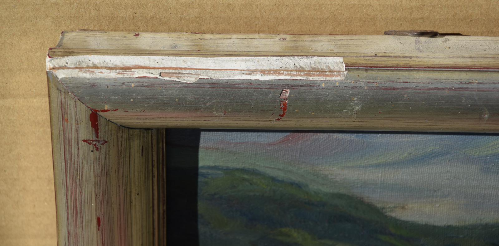 Rahmen mit Gebrauchsspuren und leichten Beschädigungen (an Ecken / Kanten etwas bestoßen und berieben, mehrere Abplatzer am Rahmen)