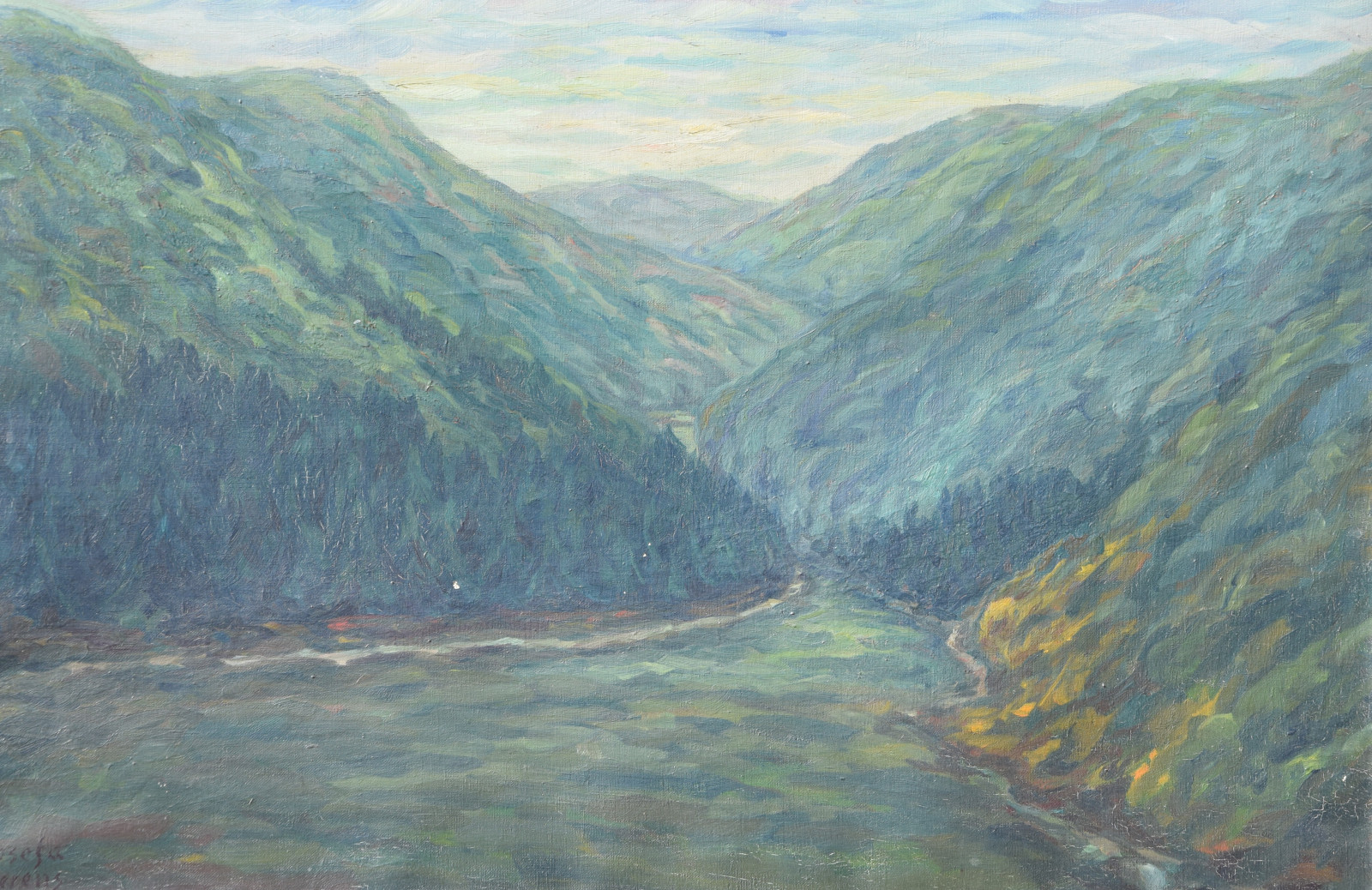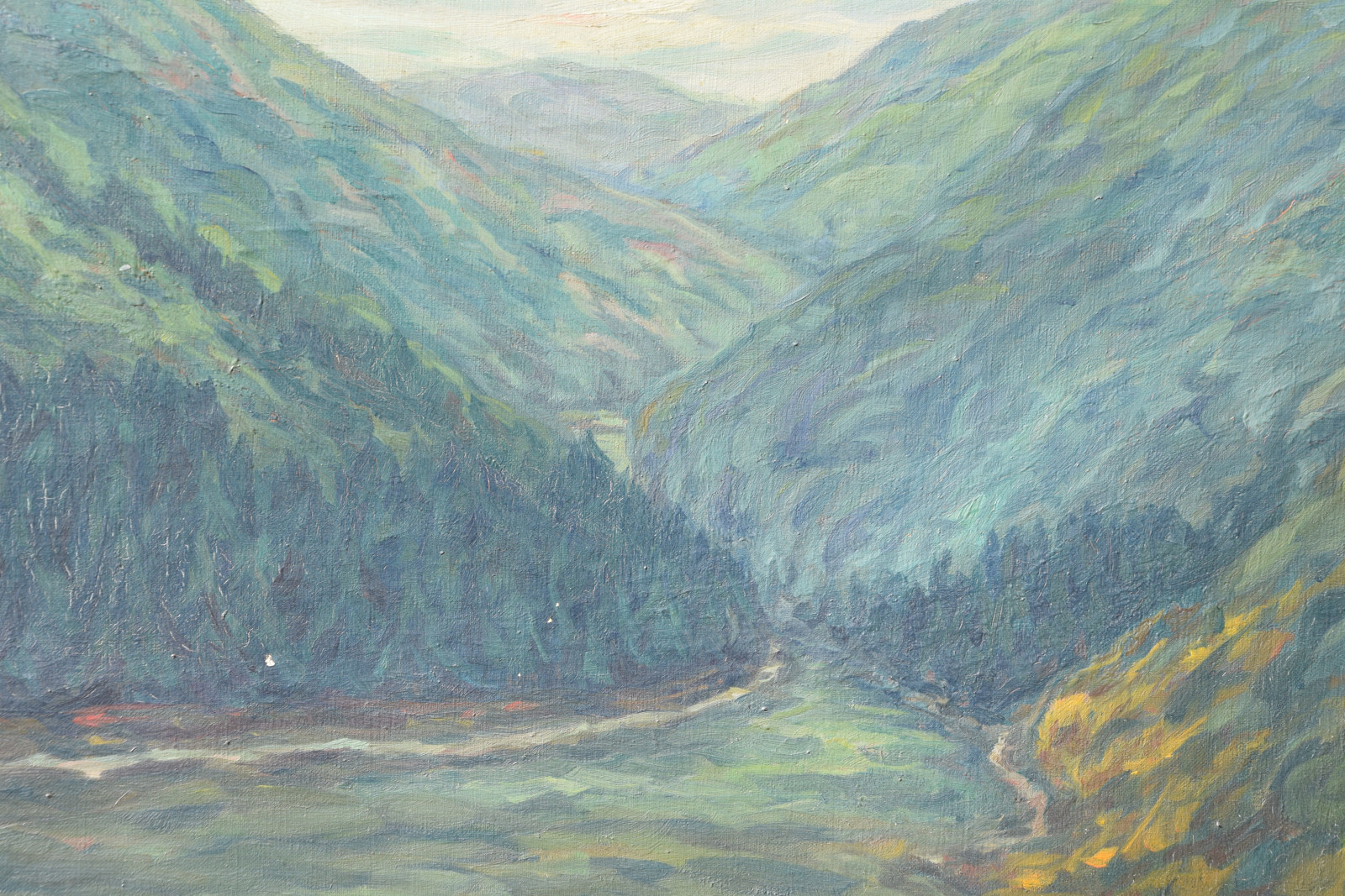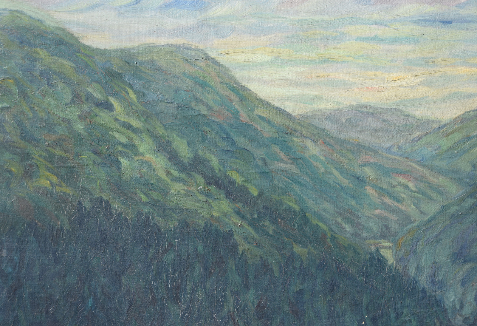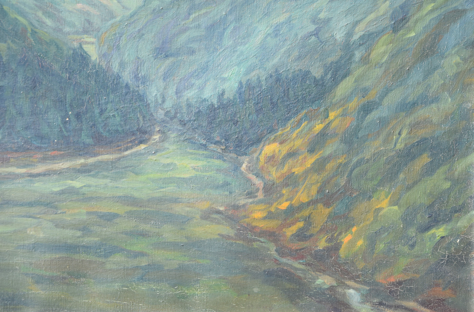 „Motiv aus dem Gleiertal (Sauerland)“ [so verso auf dem Keilrahmen oben links handschriftlich auf (Ausstellungs-)Etikett betitelt]