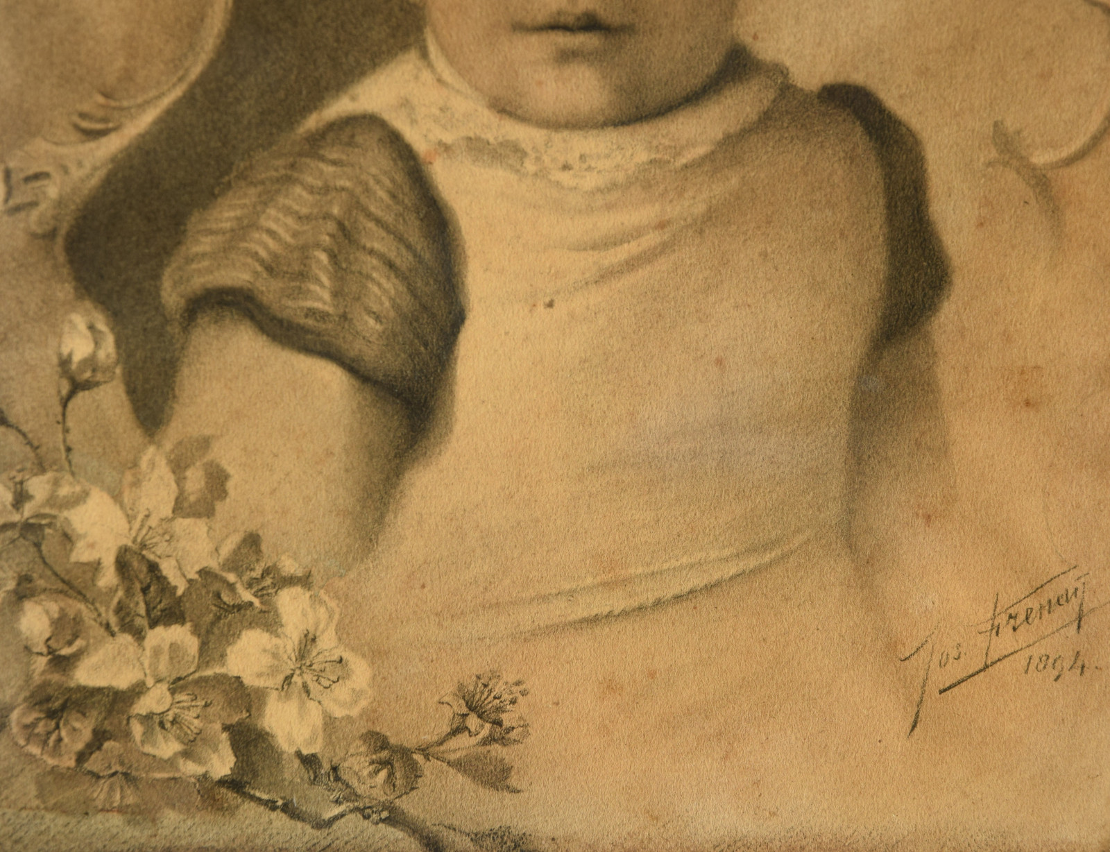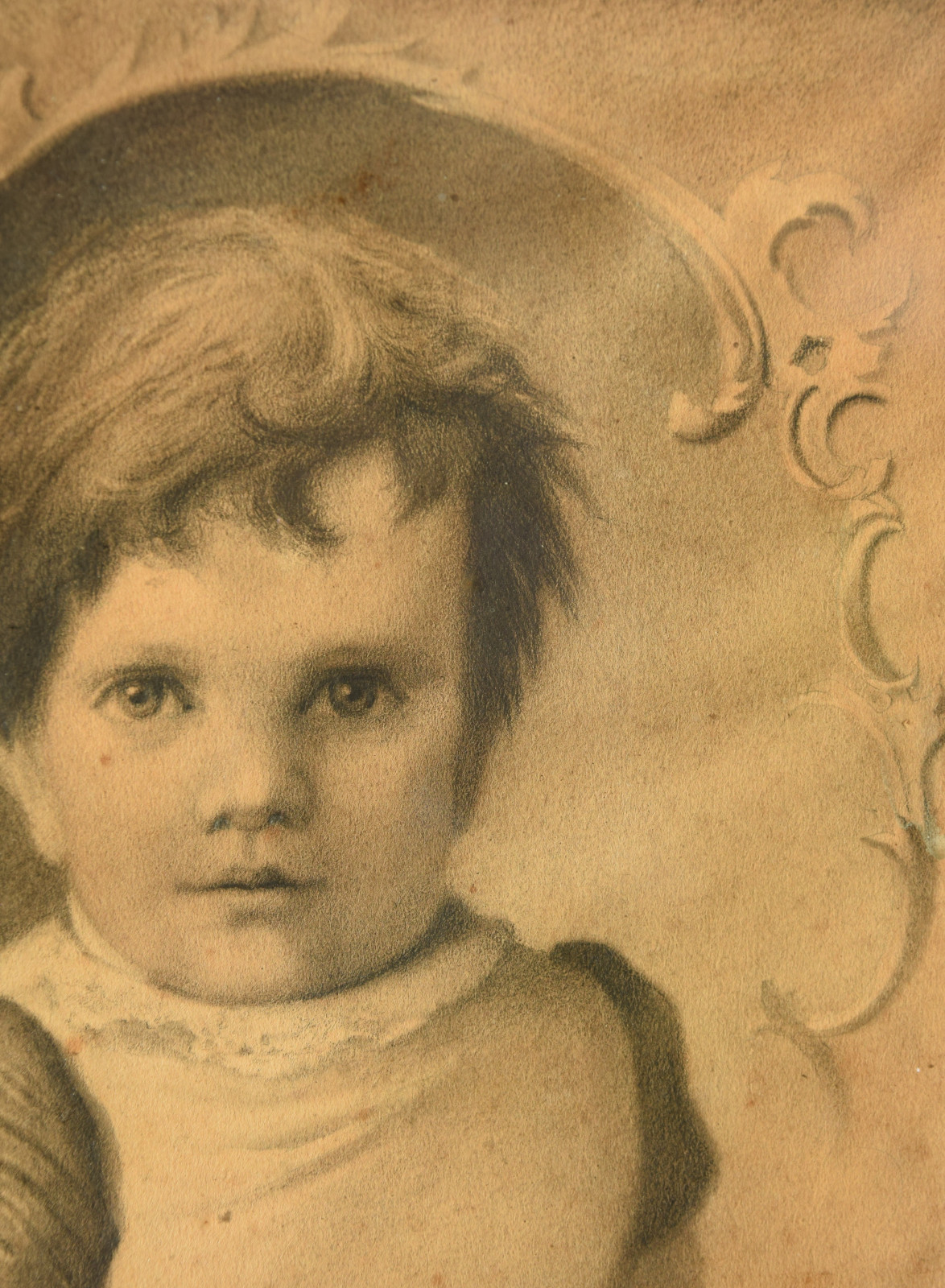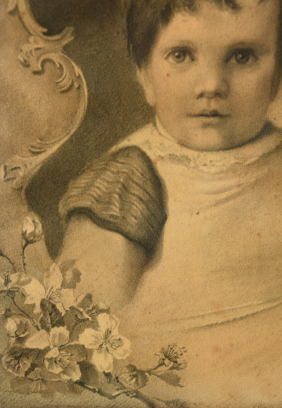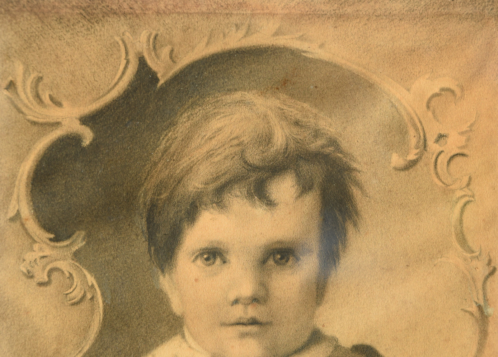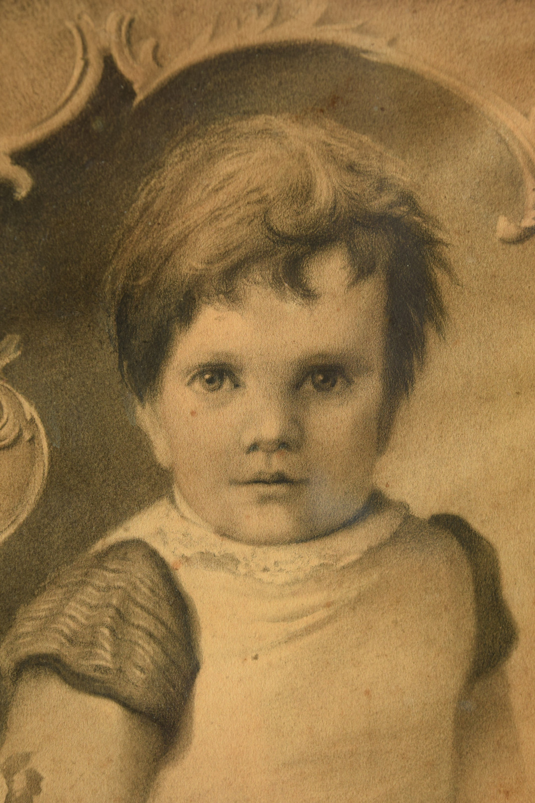 Kinder-, Jungenbildnis mit Jugendstil-Ornamentik und Blumenstrauß (1894)
