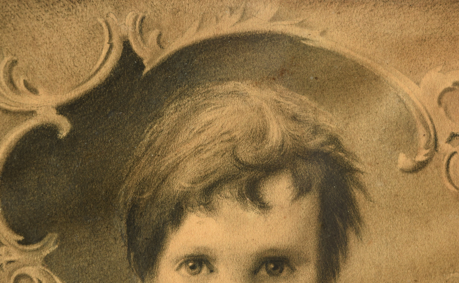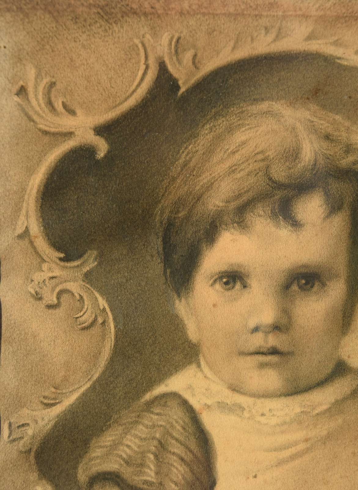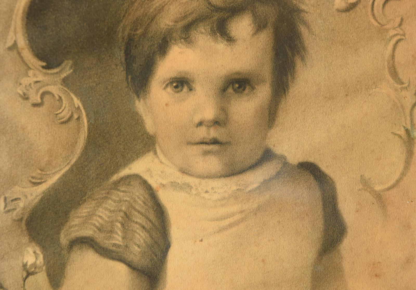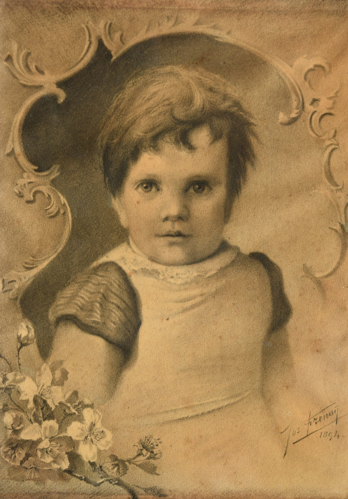 Kinder-, Jungenbildnis mit Jugendstil-Ornamentik und Blumenstrauß (1894)