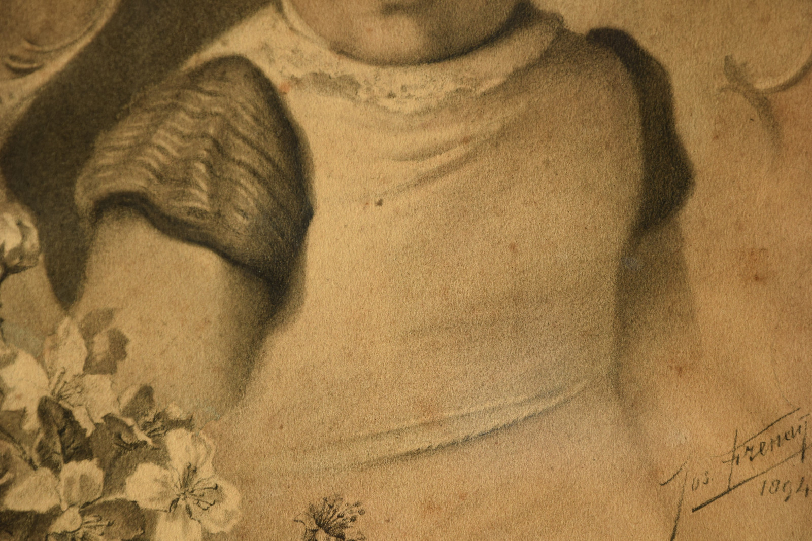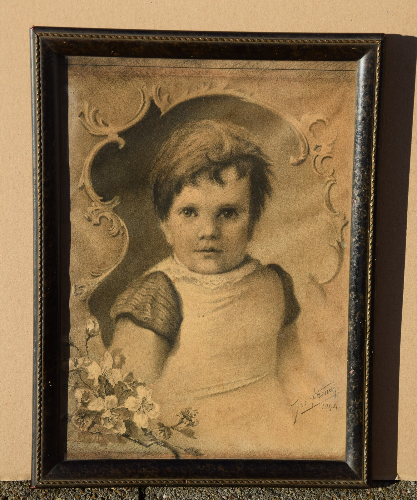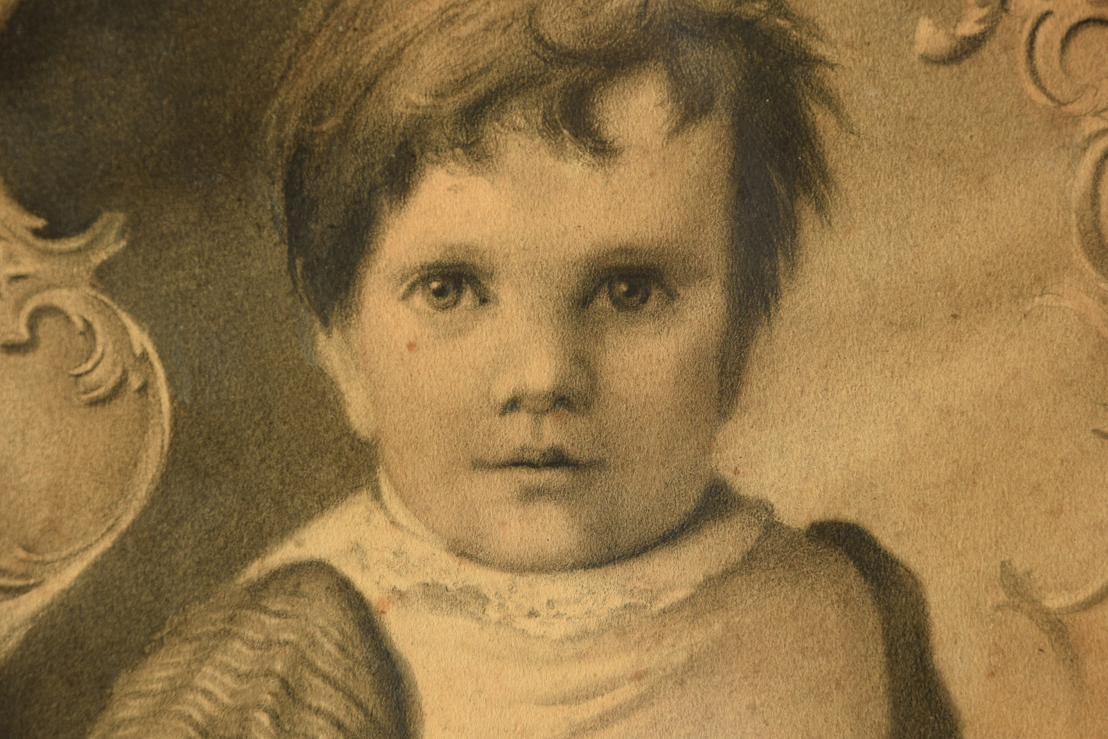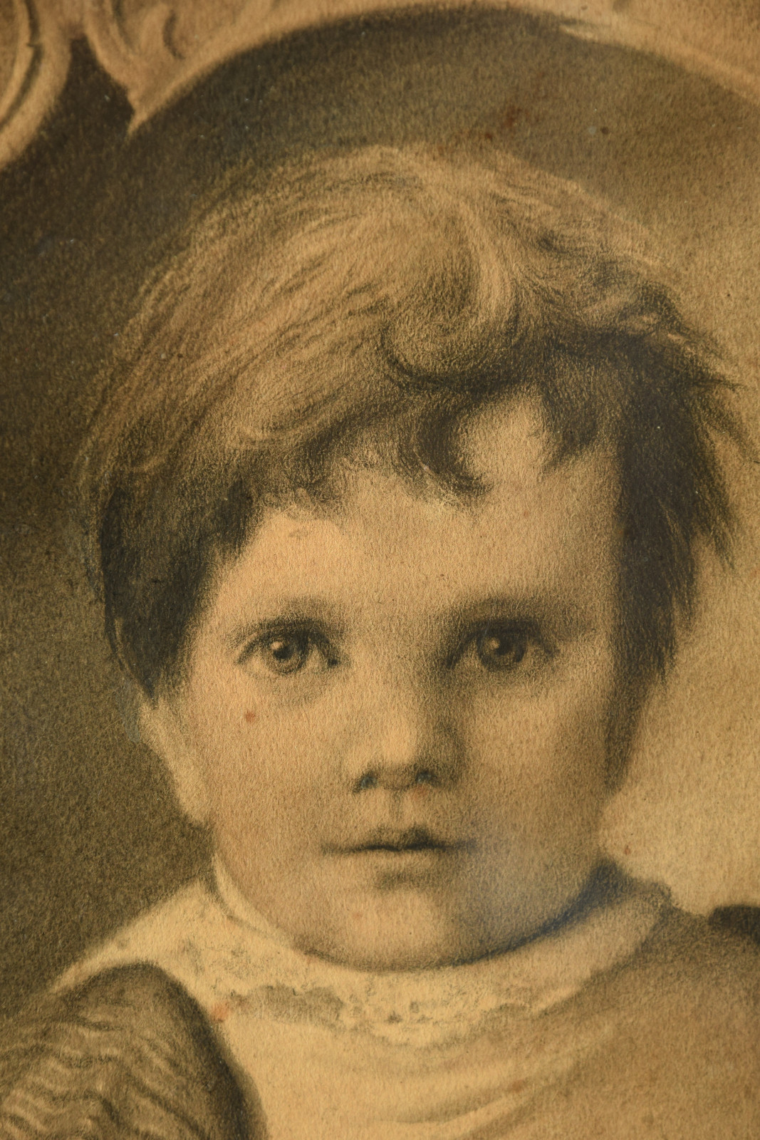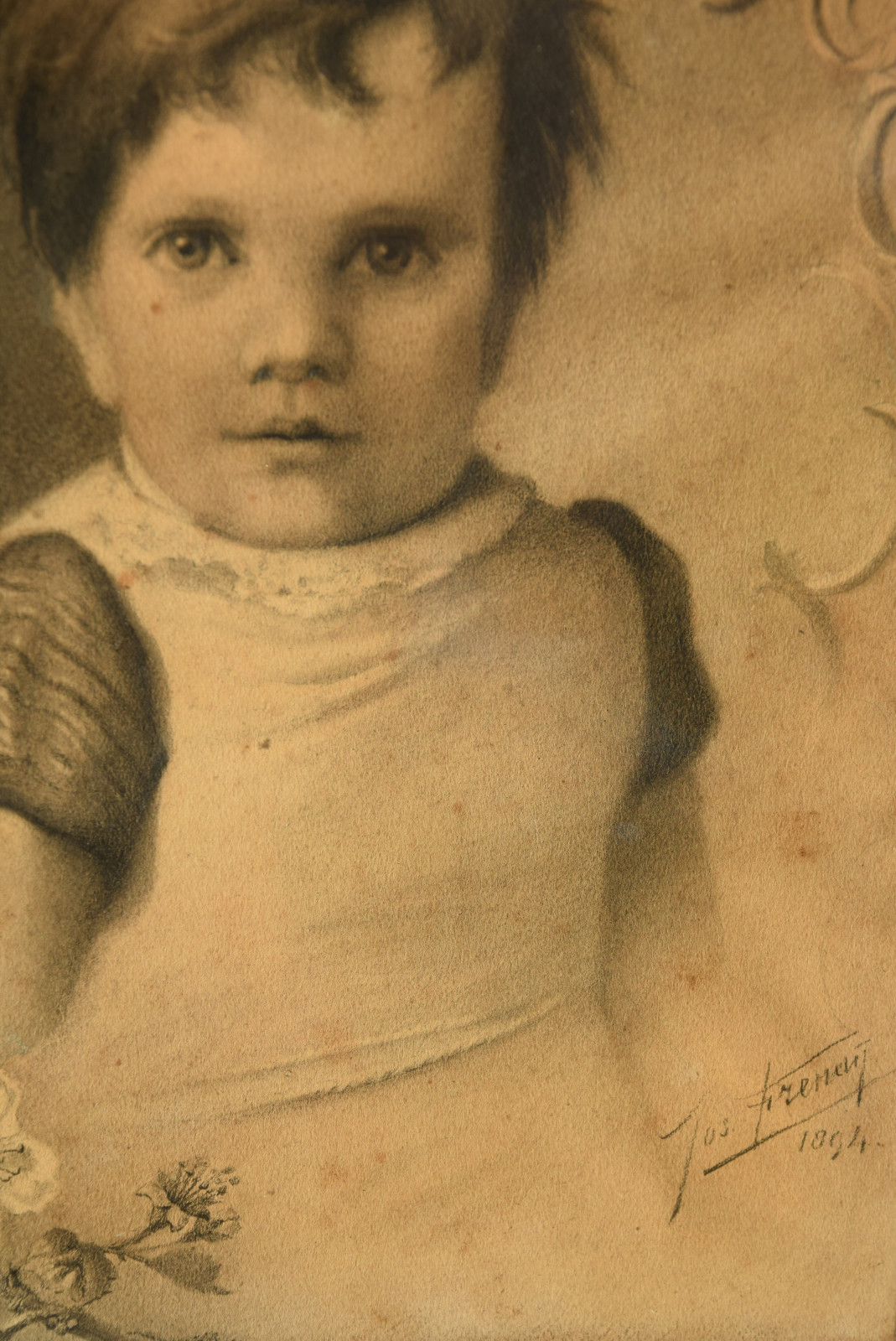 Kinder-, Jungenbildnis mit Jugendstil-Ornamentik und Blumenstrauß (1894)