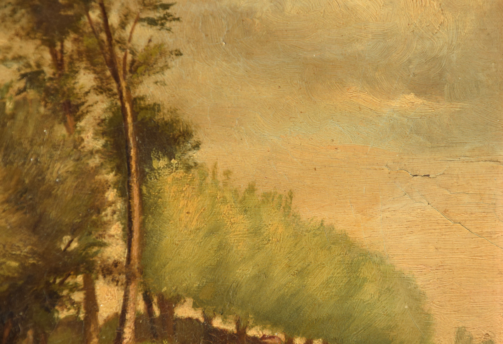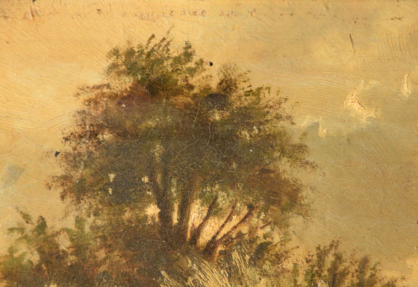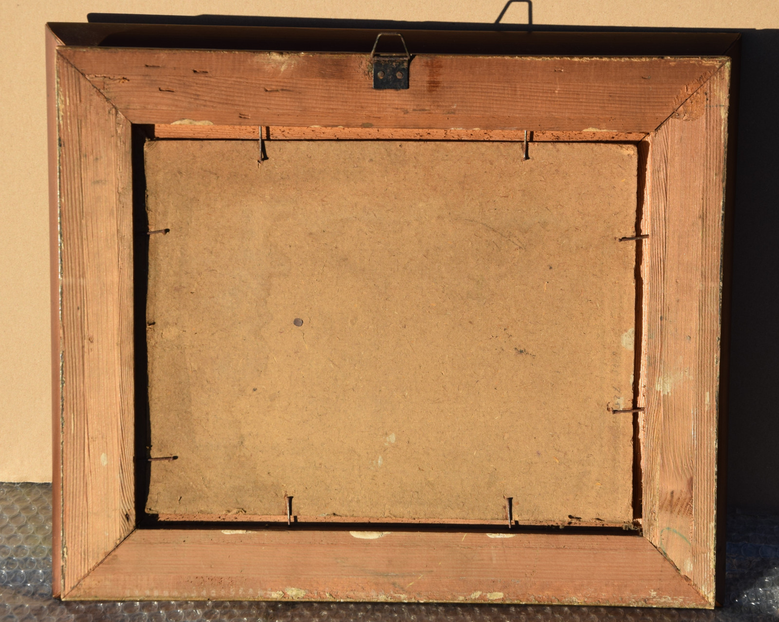 insgesamt etwas nachgedunkelt und fleckig; am rechten Rand mittig mit Beschädigung (Druckstelle und Rissbildung in der Farbschicht); Karton sehr leicht wellig; in den Randbereichen fleckig und rahmungsbedingt etwas berieben; Ecken bestoßen; verso fleckig; Rahmen etwas fleckig und berieben, sowie mit leichten Beschädigungen (Ecke unten links mit Abbruch)