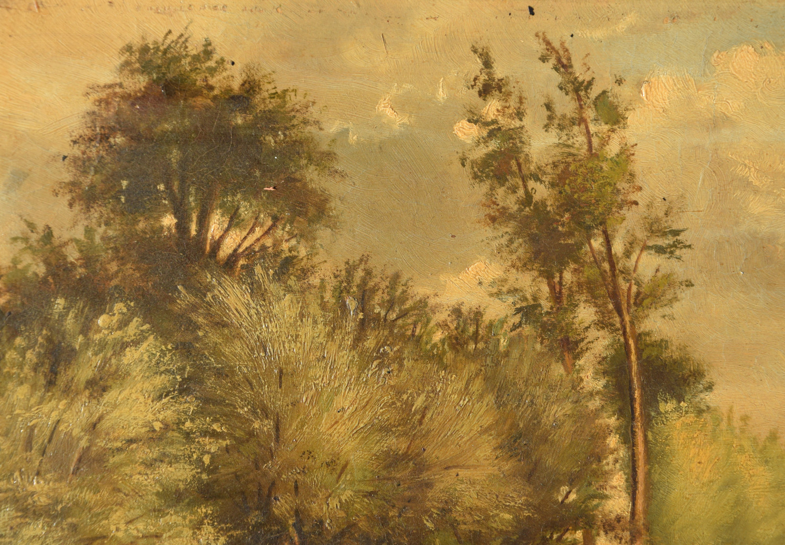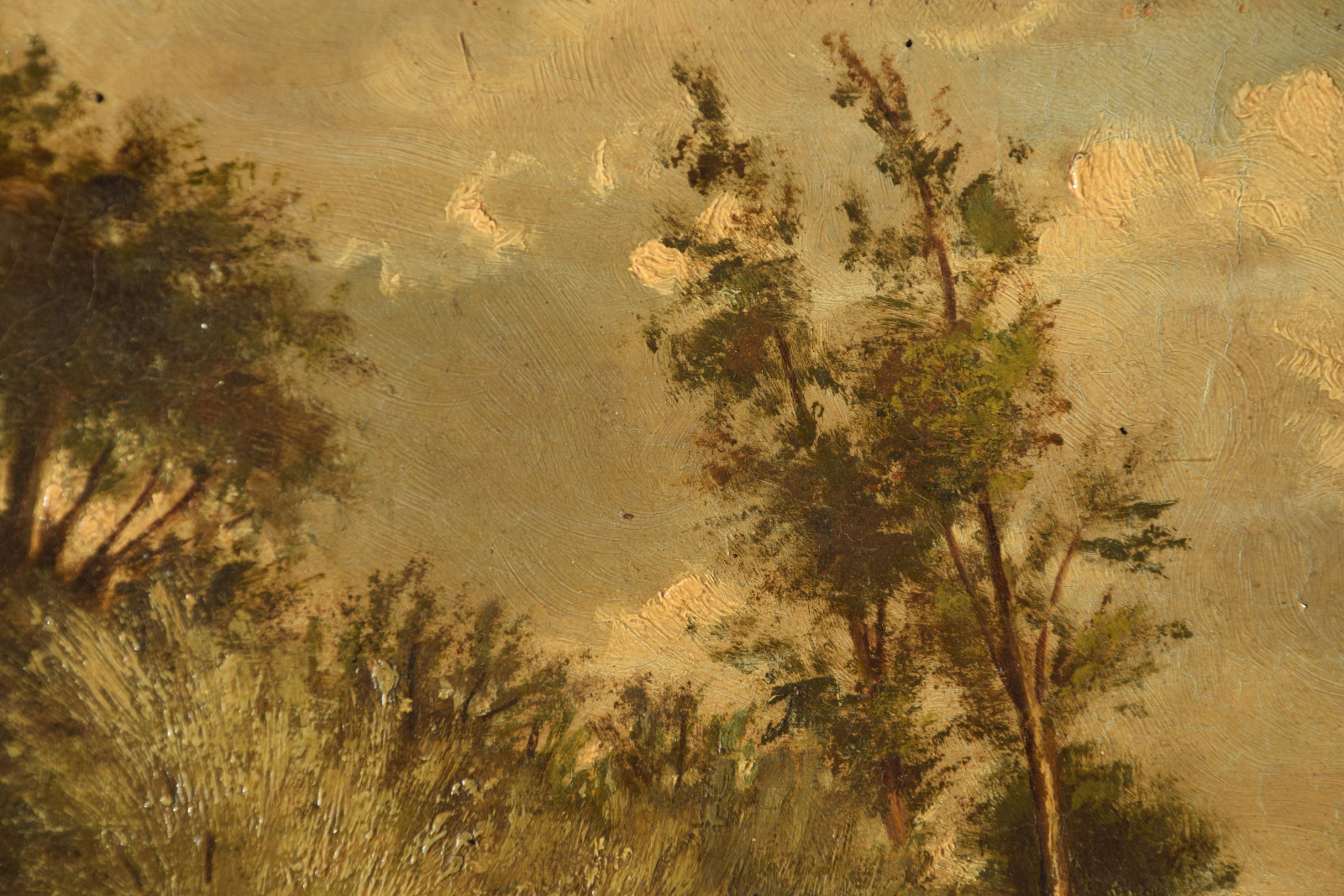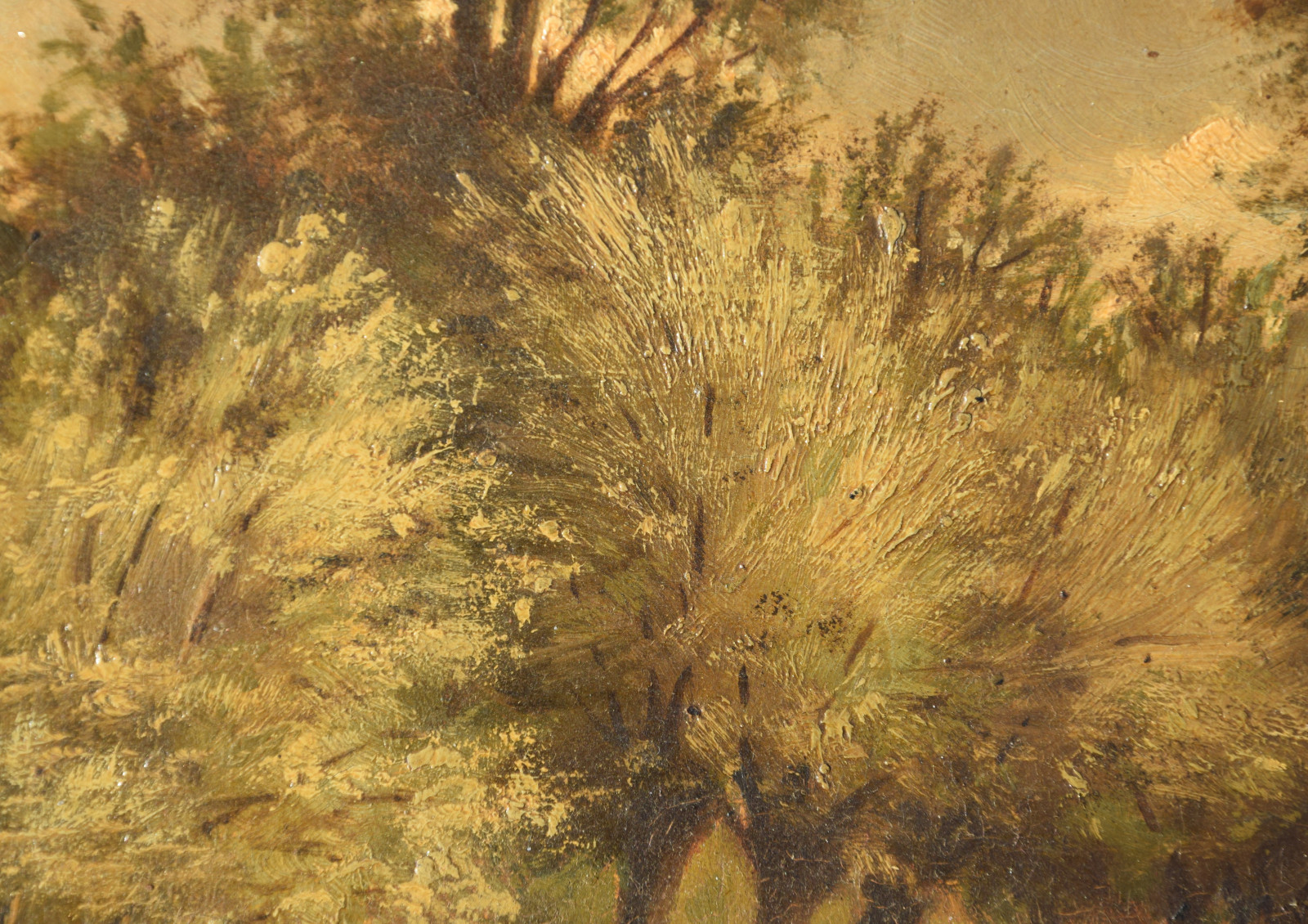insgesamt etwas nachgedunkelt und fleckig; am rechten Rand mittig mit Beschädigung (Druckstelle und Rissbildung in der Farbschicht); Karton sehr leicht wellig; in den Randbereichen fleckig und rahmungsbedingt etwas berieben; Ecken bestoßen; verso fleckig; Rahmen etwas fleckig und berieben, sowie mit leichten Beschädigungen (Ecke unten links mit Abbruch)