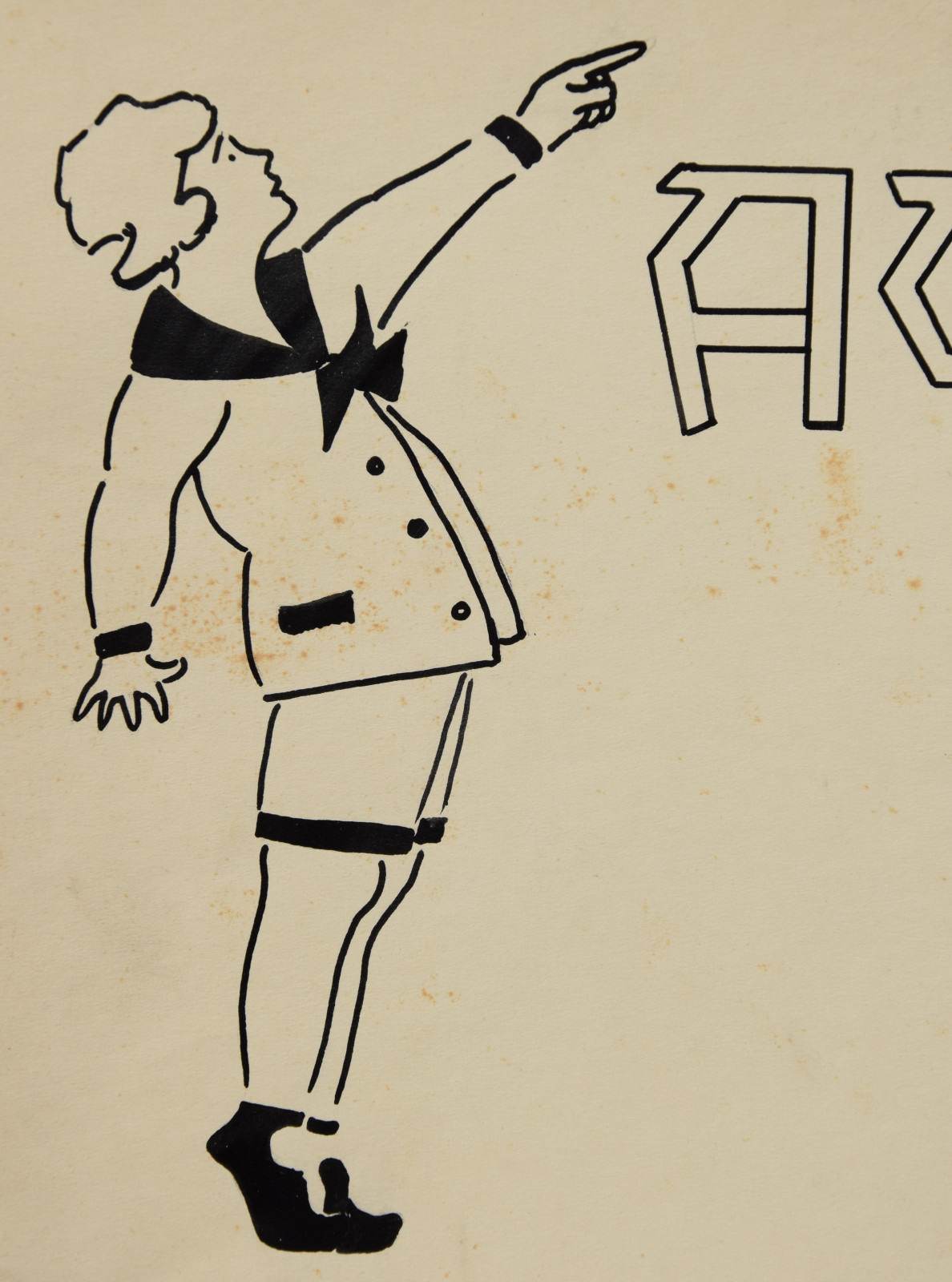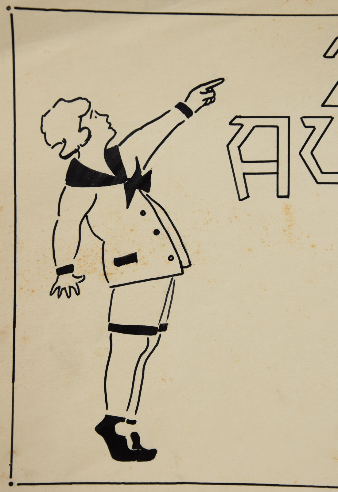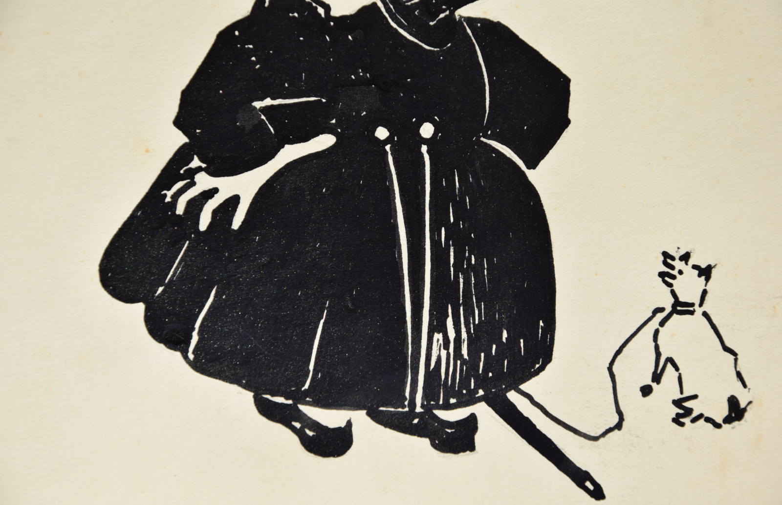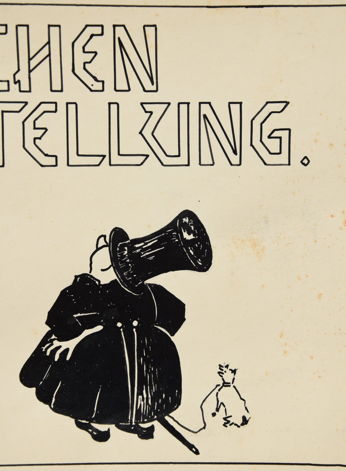 Links ein junger Mann (Schüler?), der sich nach obe reckend auf die Zehen stellt und auf den Hinweis „Zeichen-Ausstellung“ deutet. Rechts ein kleiner Herr mit schwarzem Mantel und übergroßem Zylinder blickt zu dem Schriftzug, während sein kleiner Hund neben ihm wartet.
