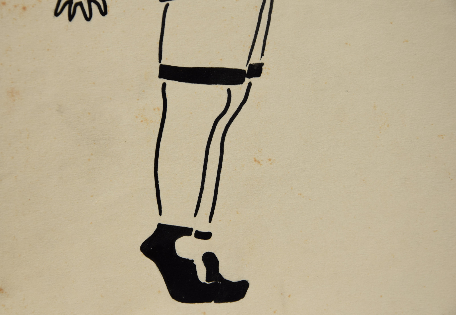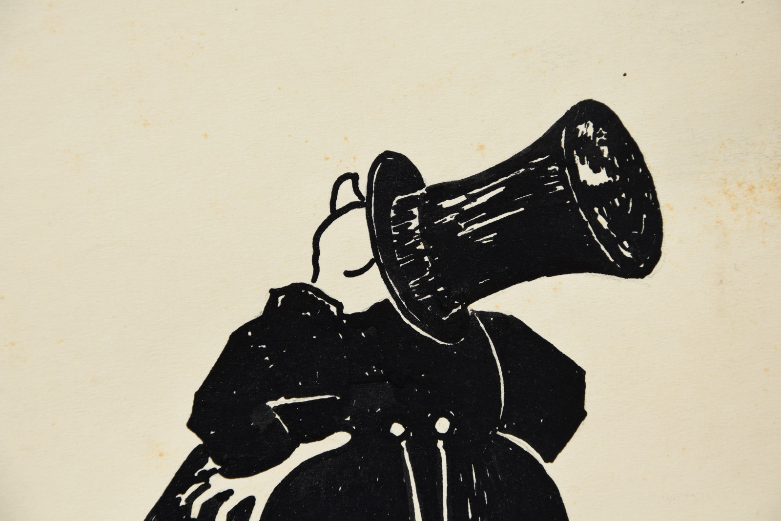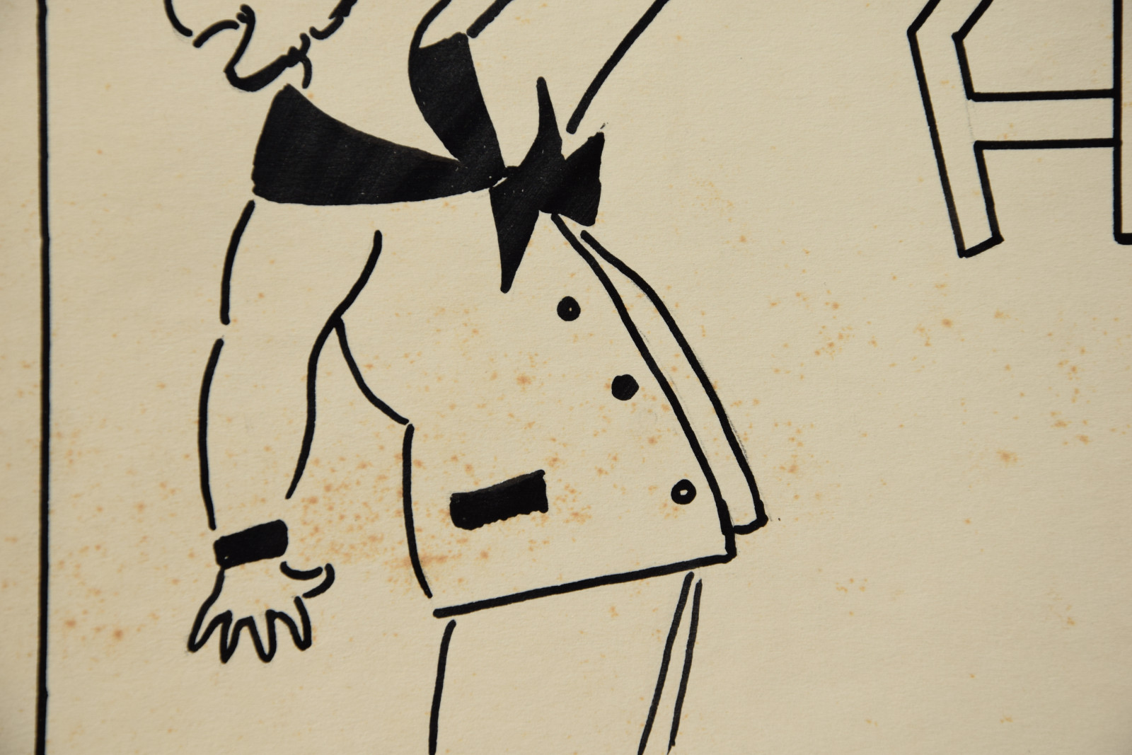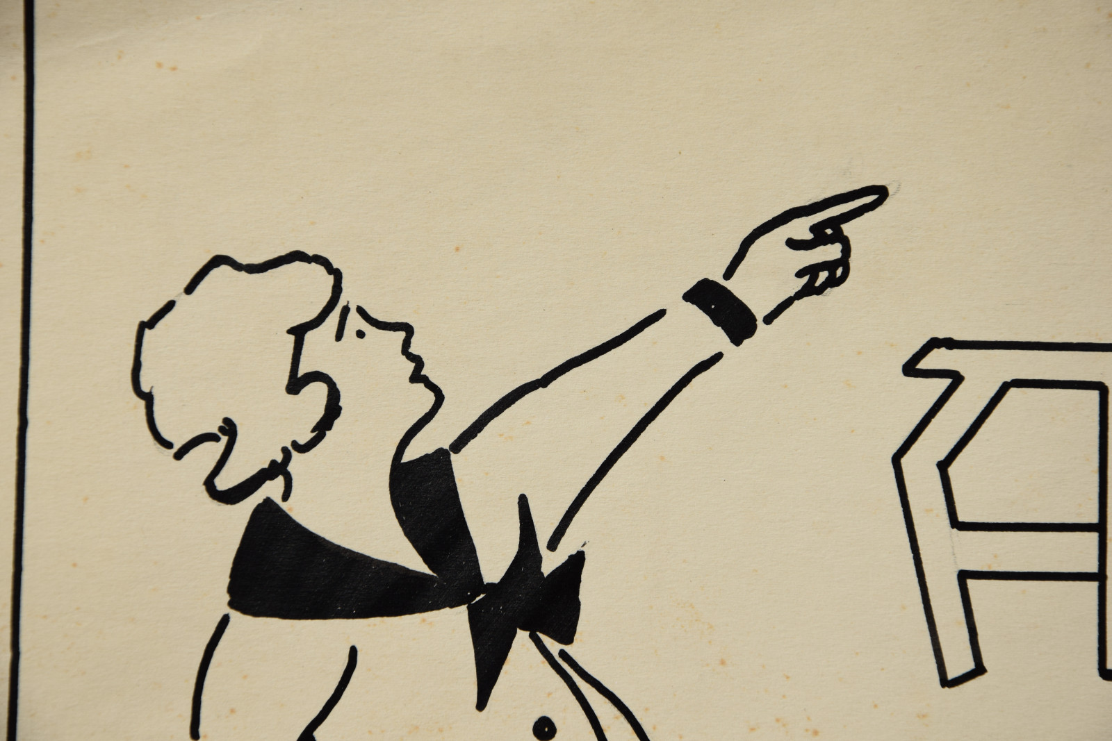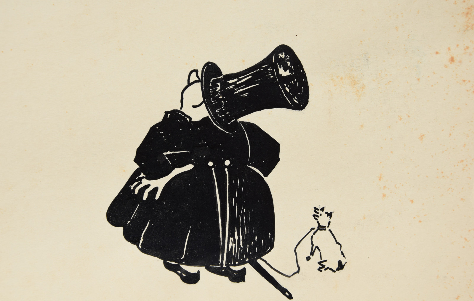 Links ein junger Mann (Schüler?), der sich nach obe reckend auf die Zehen stellt und auf den Hinweis „Zeichen-Ausstellung“ deutet. Rechts ein kleiner Herr mit schwarzem Mantel und übergroßem Zylinder blickt zu dem Schriftzug, während sein kleiner Hund neben ihm wartet.