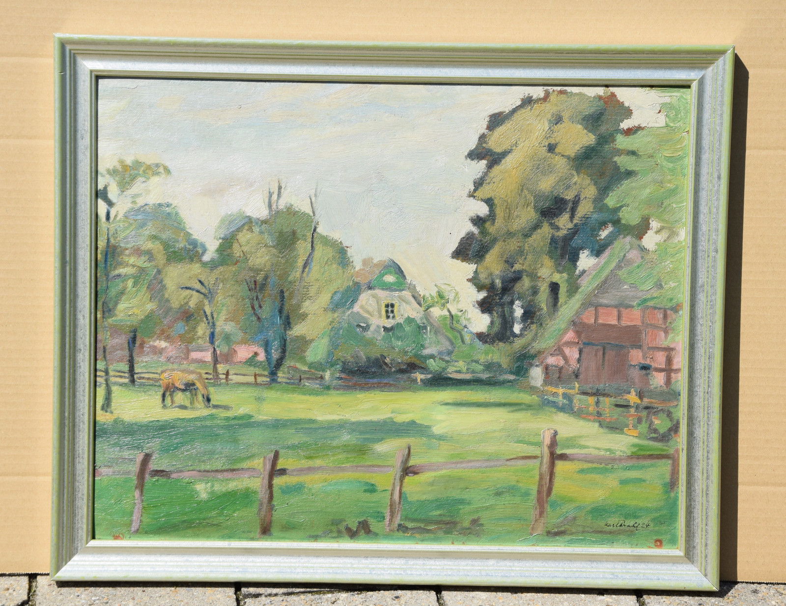 ohne Titel [sommerliches Gehöft mit Pferdekoppel (unter Umständen Motiv aus Kummerfeld, wo Prahl damals in einem kleinen Hof lebte)]
