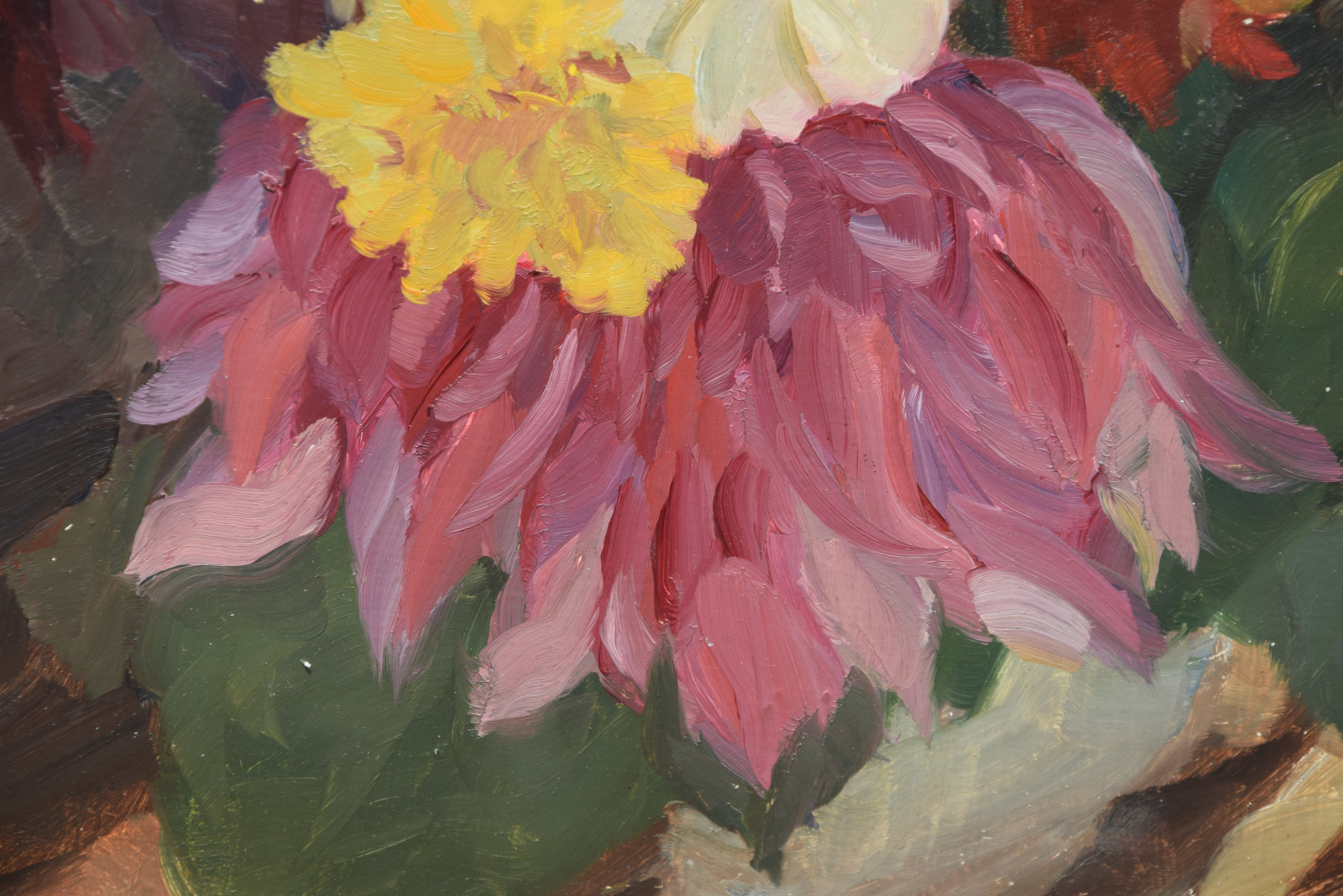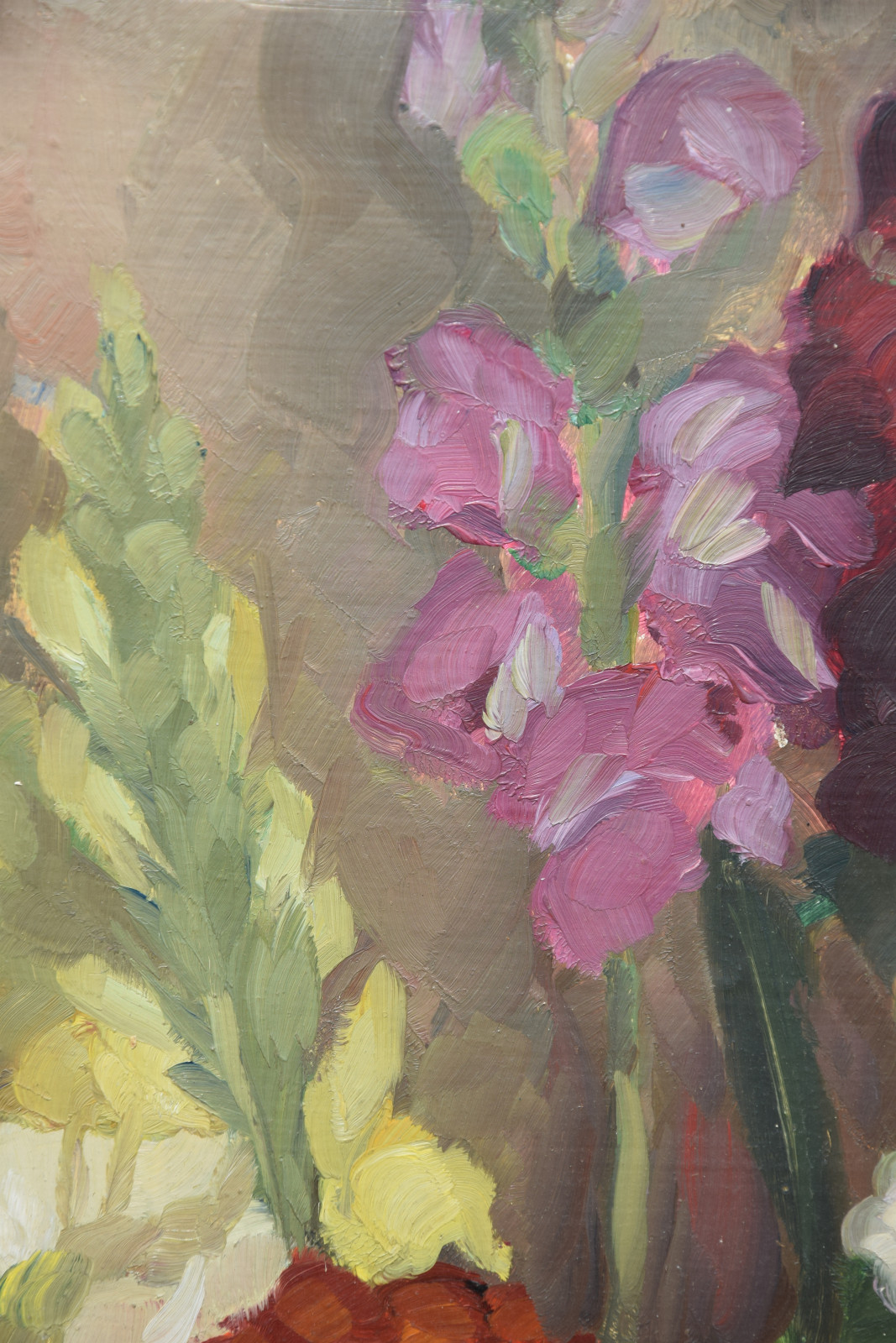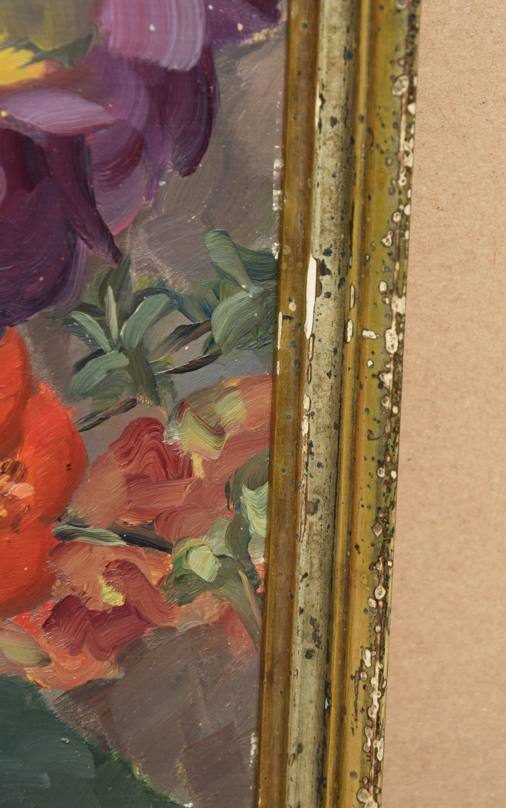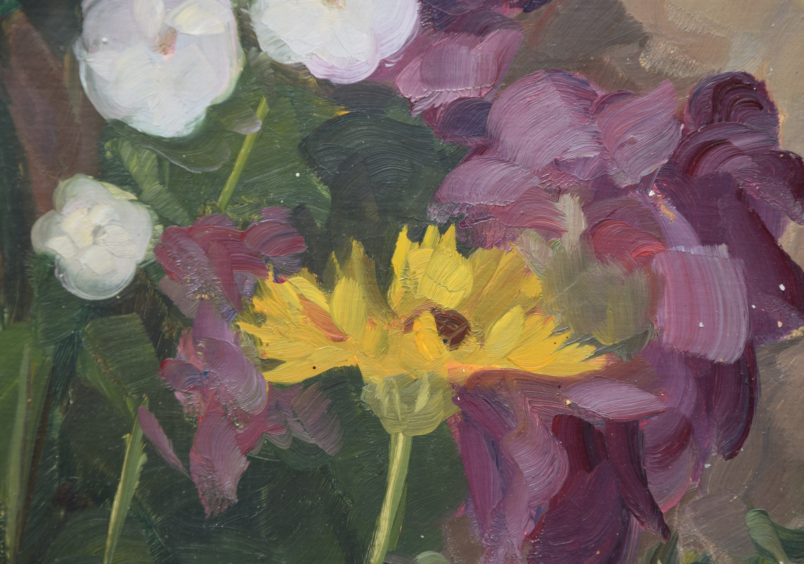 Das hier gezeigte dichte und farbstarke Stillleben mit Wiesenblumen wird in jener Zeit entstanden sein, als Kurt Lauber kriegsbedingt von München nach Tittmoning verzog. Während dieser Zeit lebte er hauptsächlich von der Malerei, wobei vor allem Motive der dortigen Landschaft, Bildnisse der Bevölkerung und eben auch Stillleben entstanden.