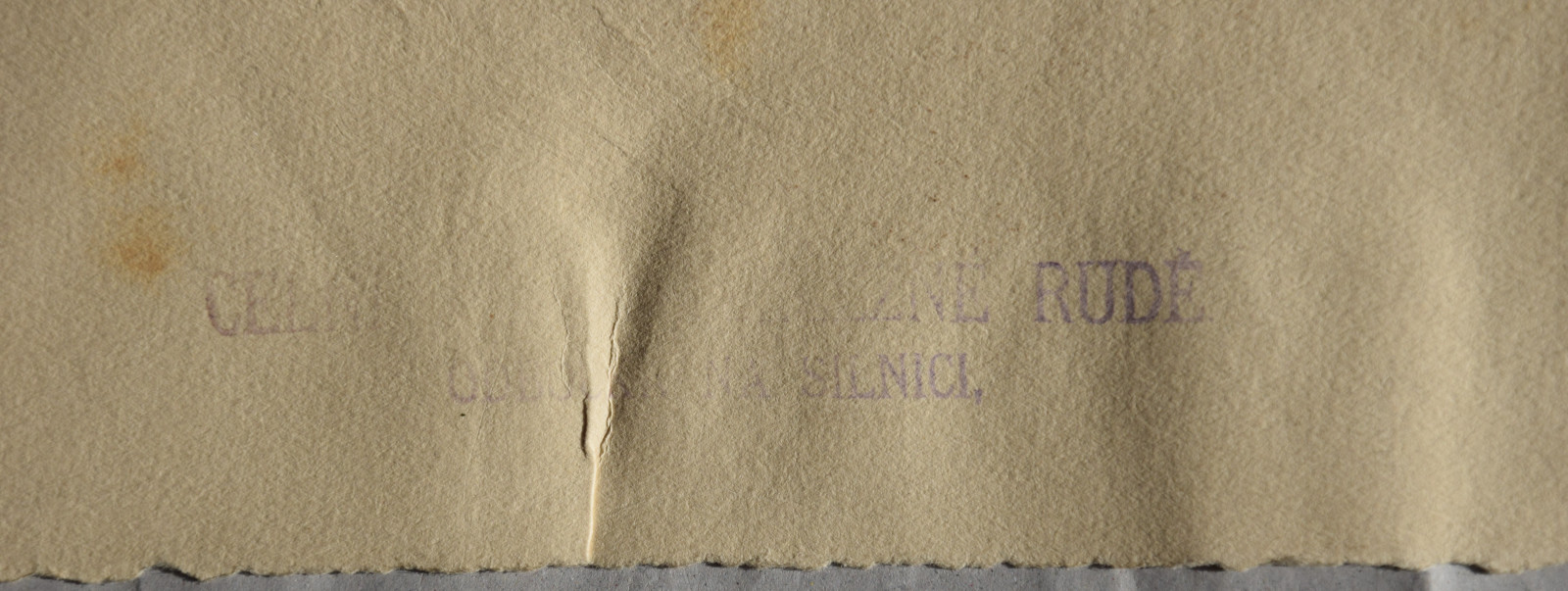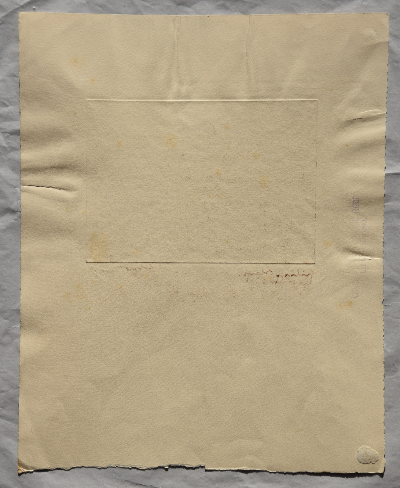 unterer und linker Rand mit leichten Abrissspuren; leichte Druckstellen im Blatt; Ecken schwach bestoßen; Ecke unten rechts mit Knickspur; am linken und rechten Rand, sowie oben mittig etwas knittrig; in den Randbereichen etwas nachgedunkelt; recto und verso insgesamt etwas fleckig und etwas nachgedunkelt; verso in Ecke unten rechts Klebereste von früherer Befestigung; verso am rechten Rand mittig etwas farbschwacher, undeutlicher Stempel in Tschechisch „[…] rudé […] na silnici“