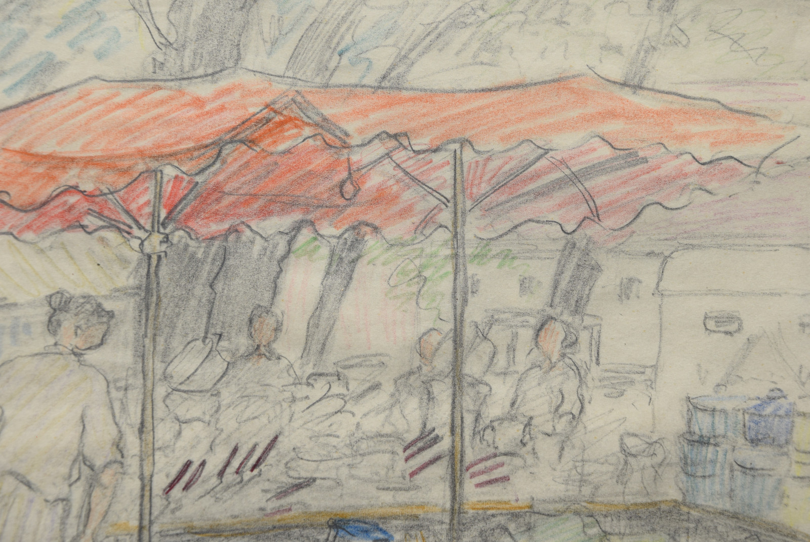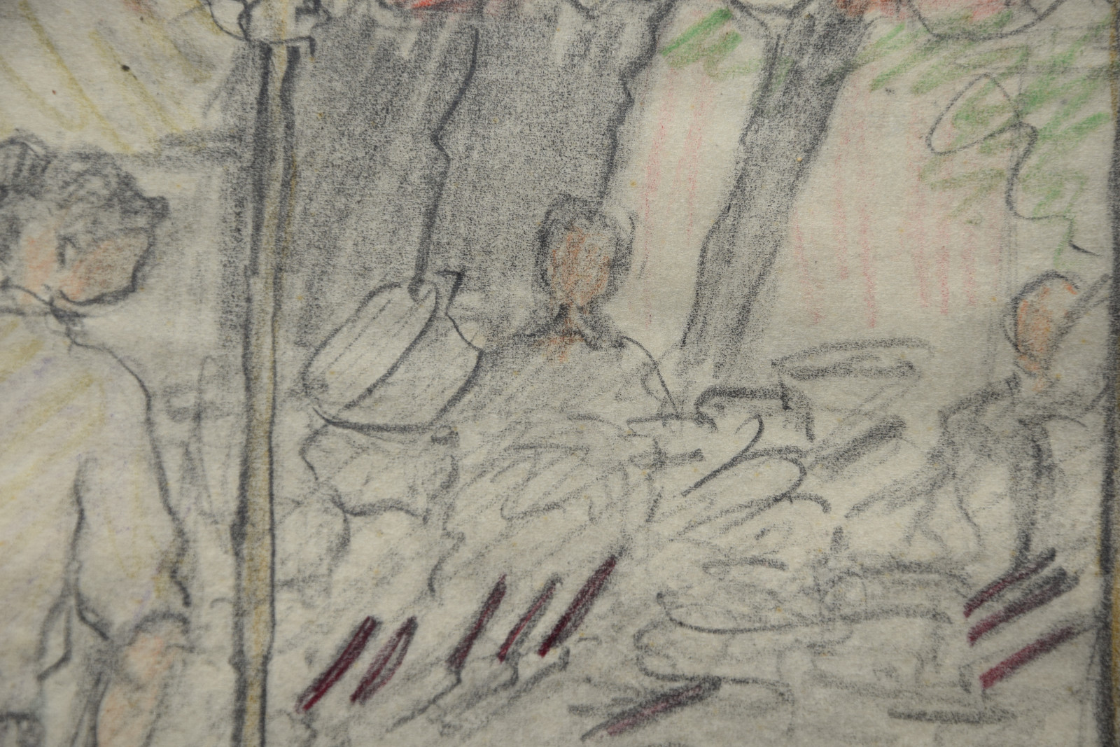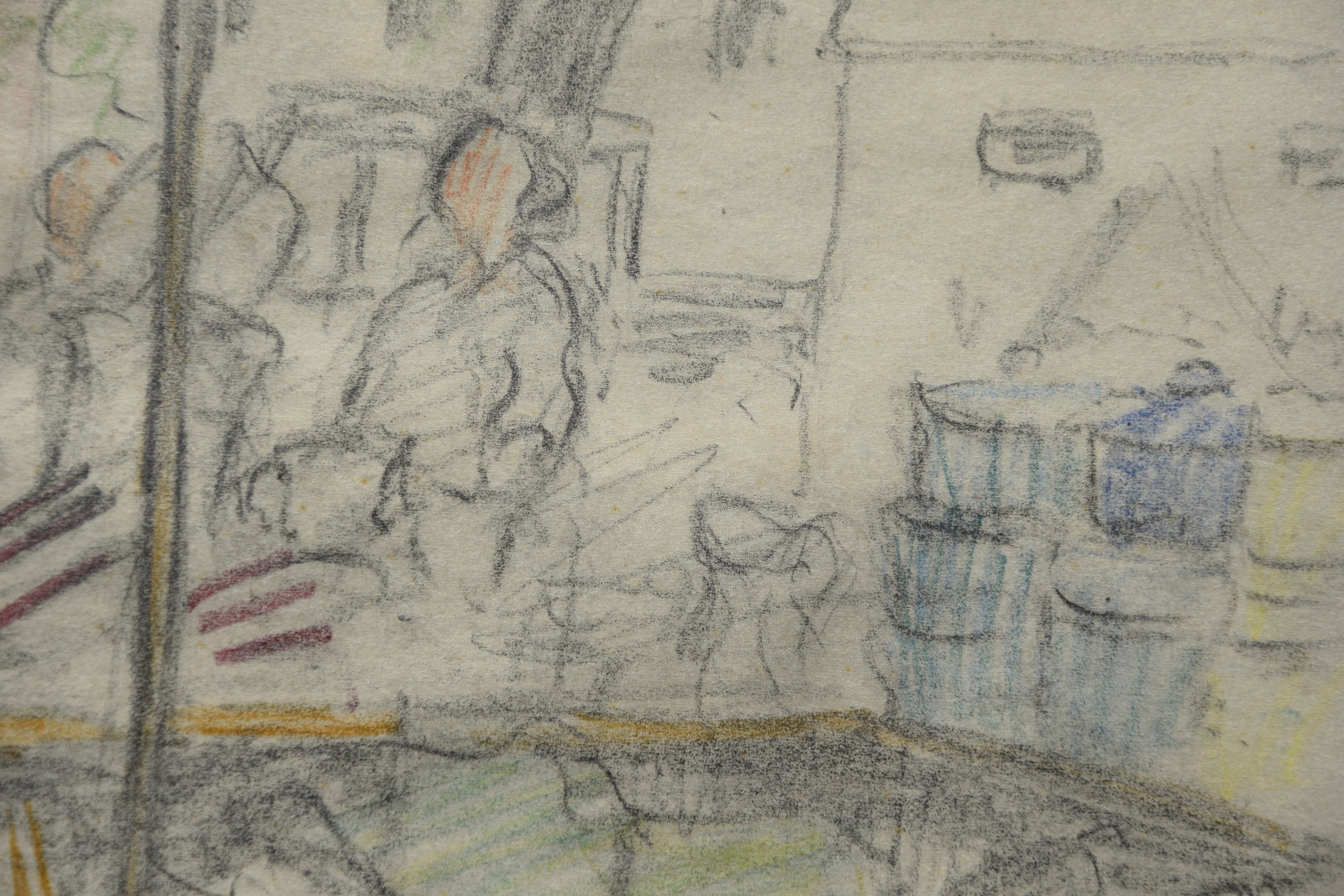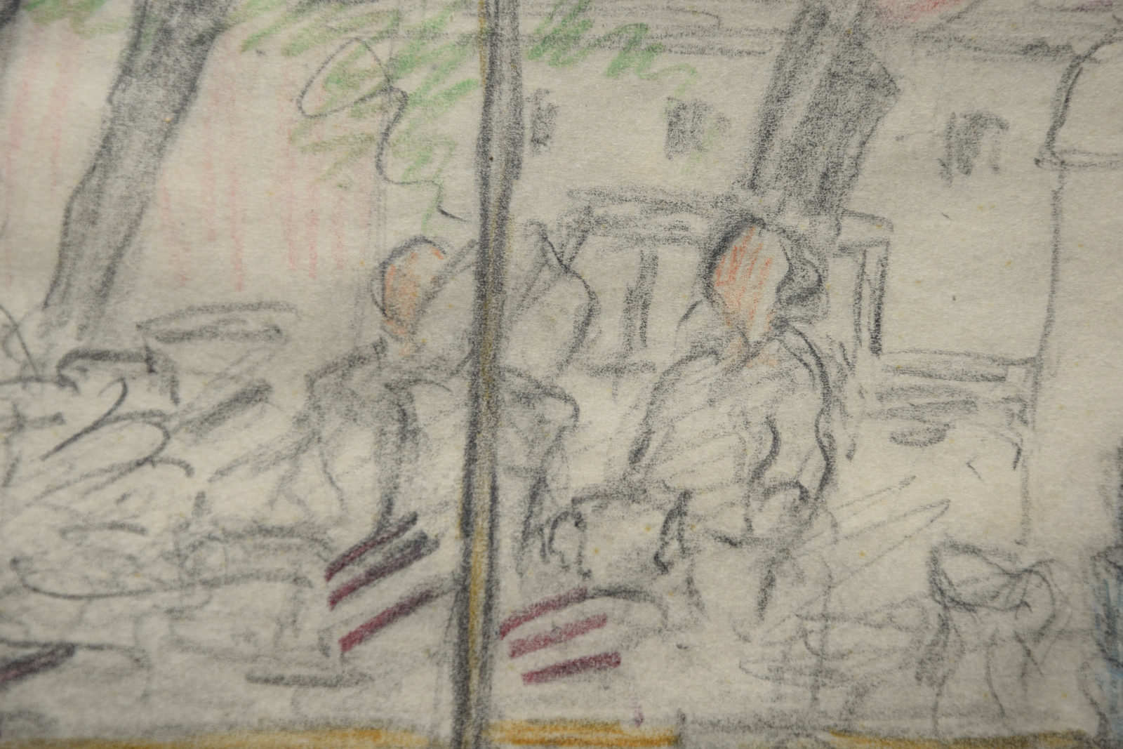 Bleistift und Farbstifte auf dünnem, pergaminähnlichem Papier