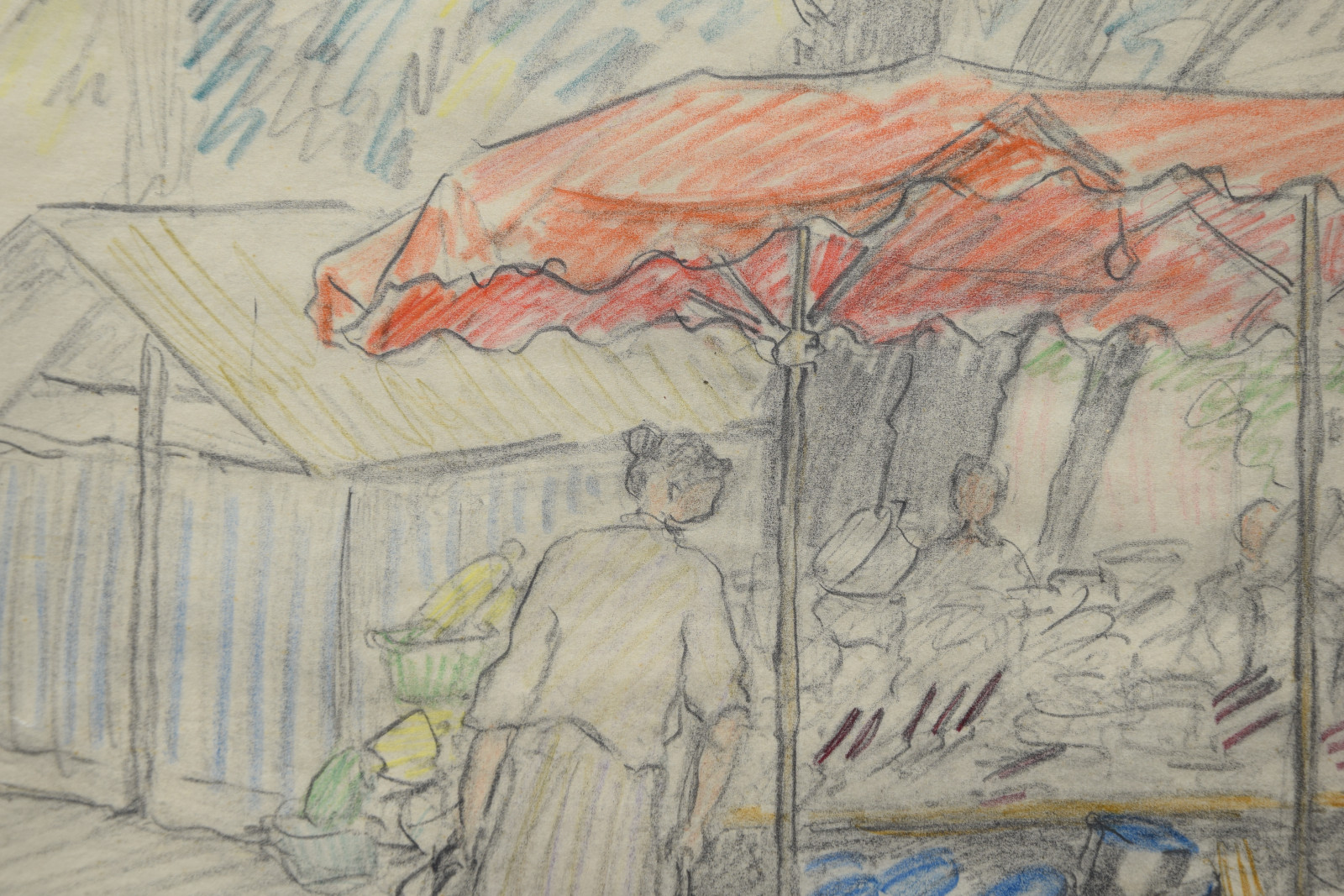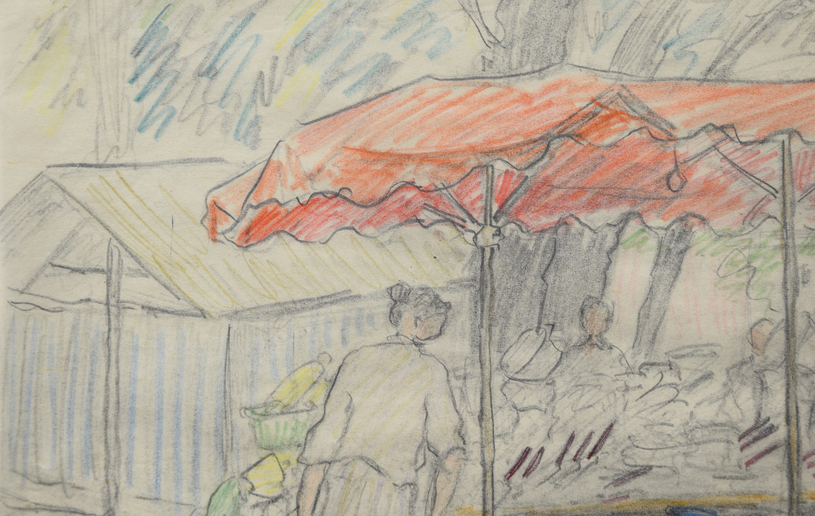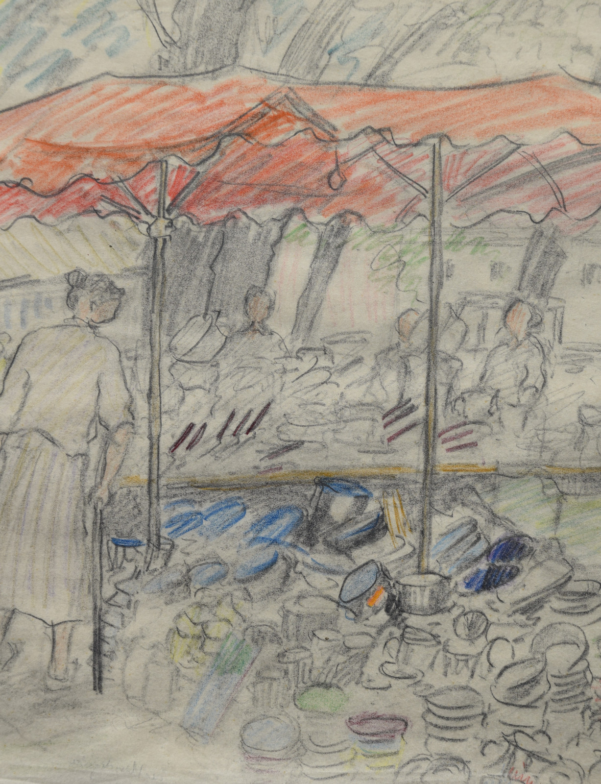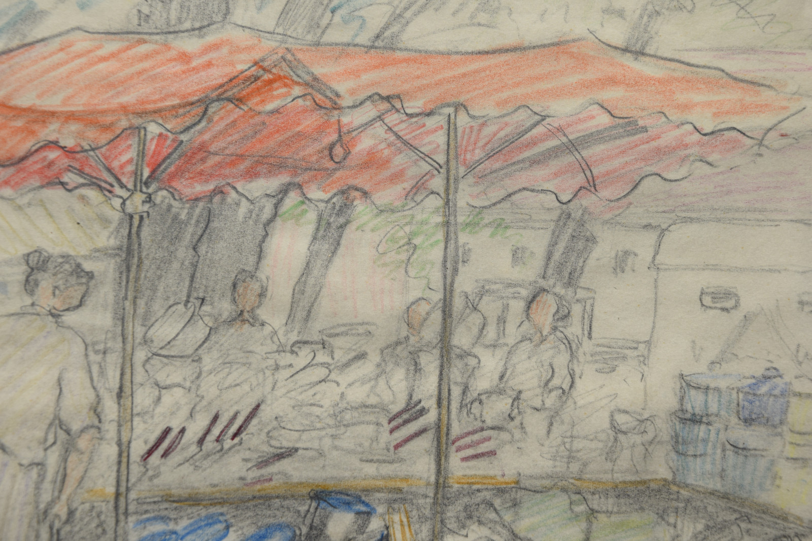 Bleistift und Farbstifte auf dünnem, pergaminähnlichem Papier
