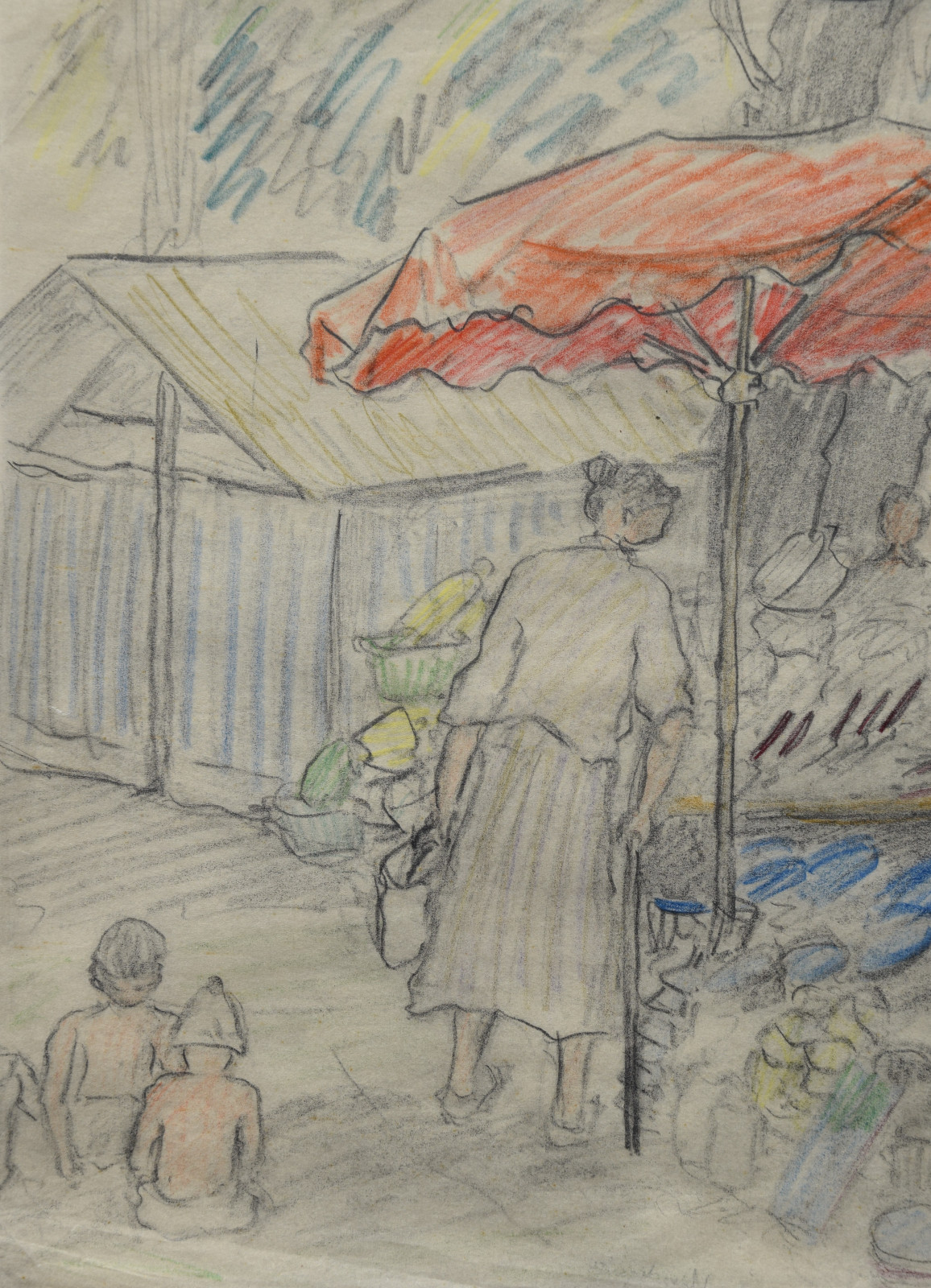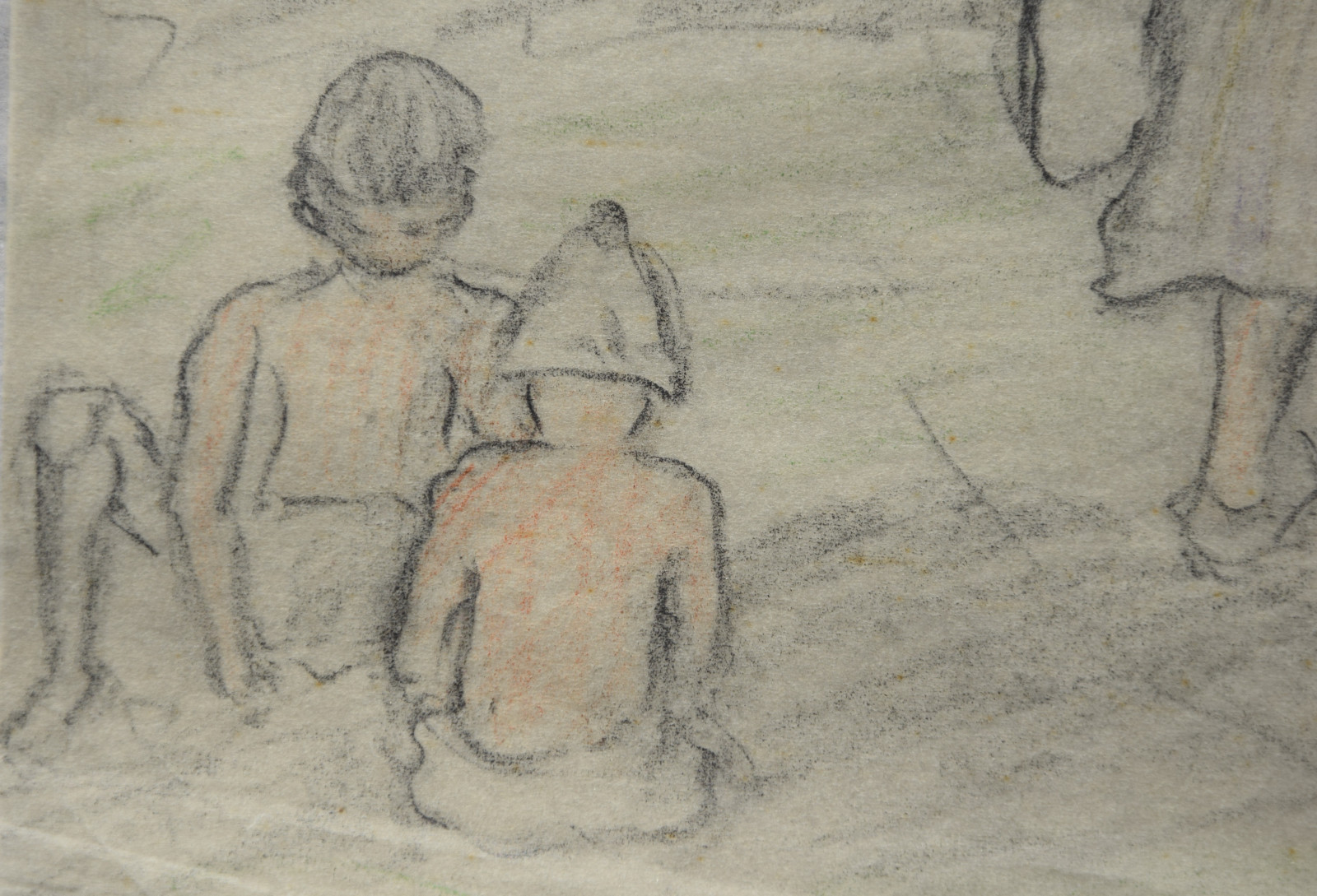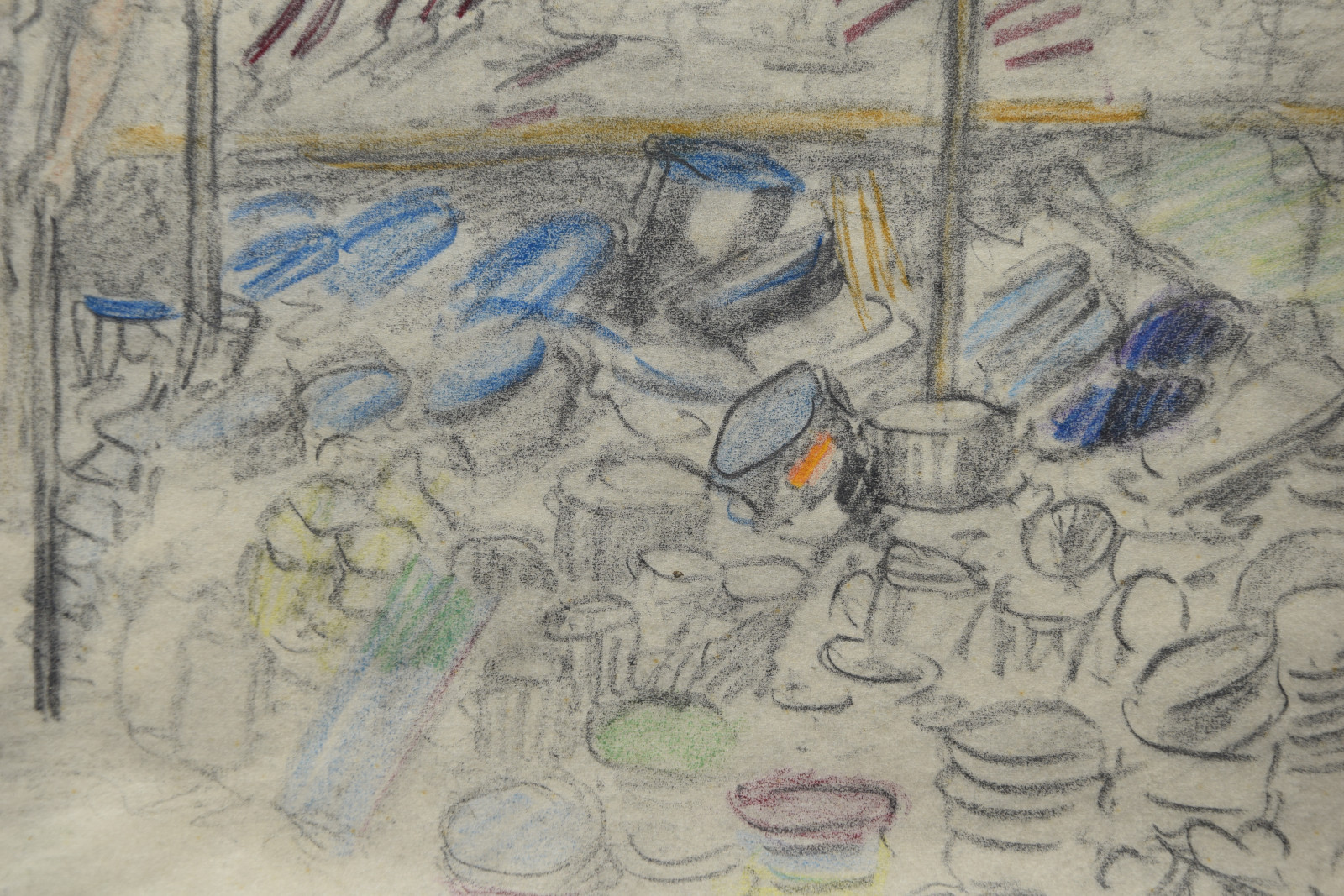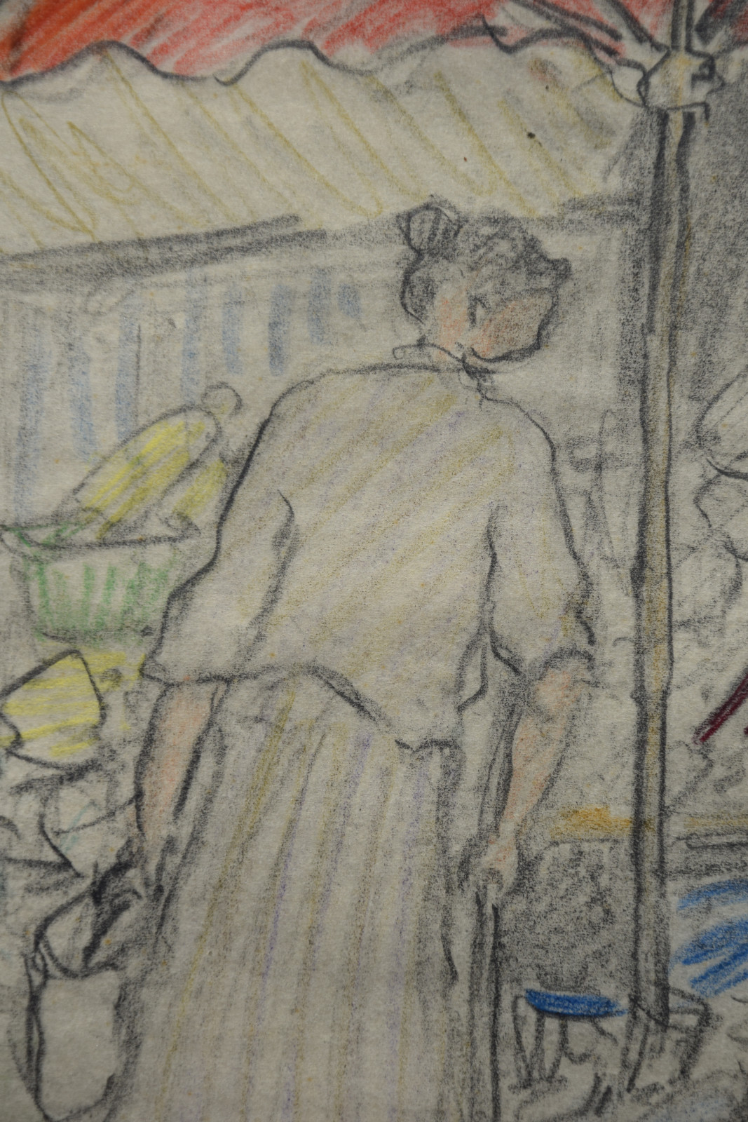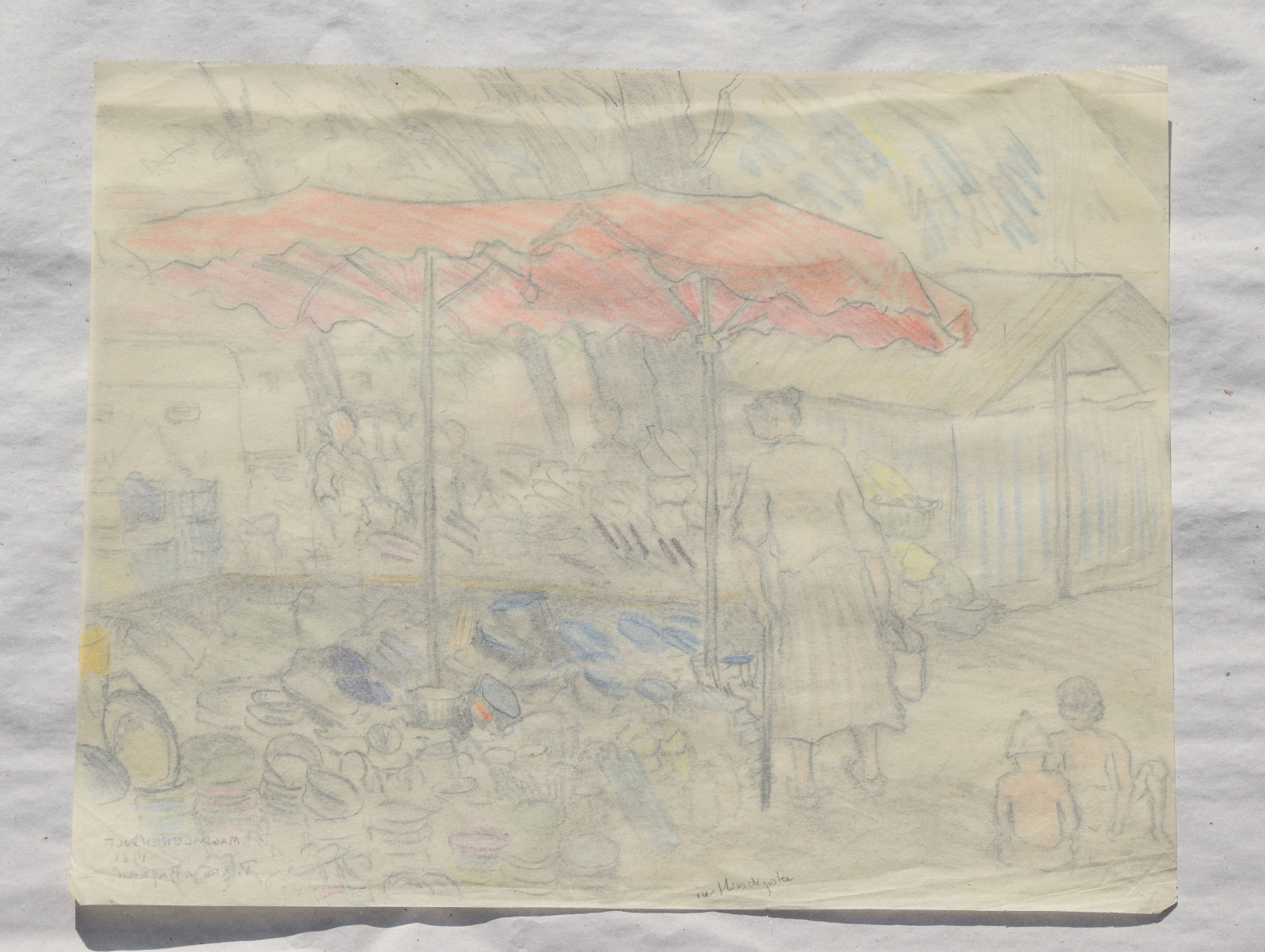 Bleistift und Farbstifte auf dünnem, pergaminähnlichem Papier