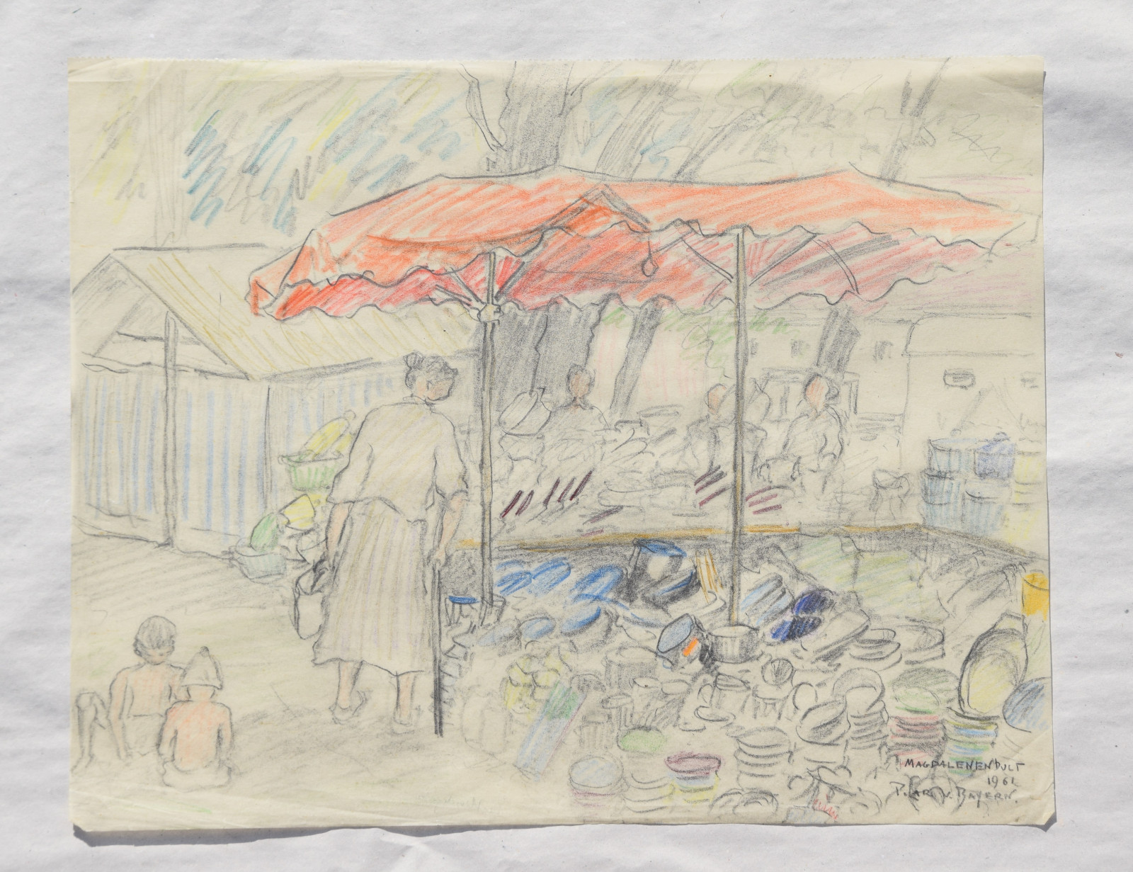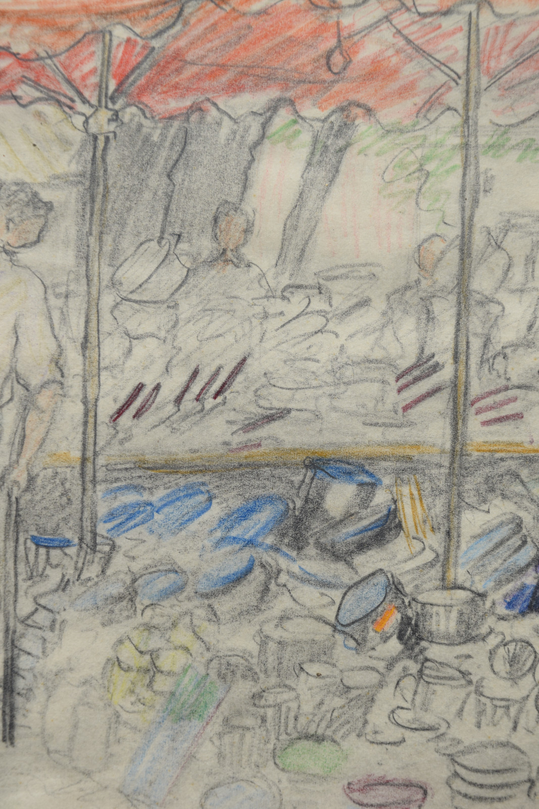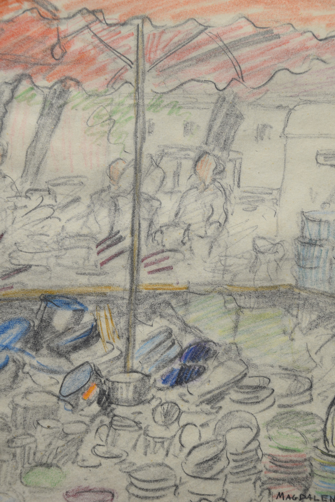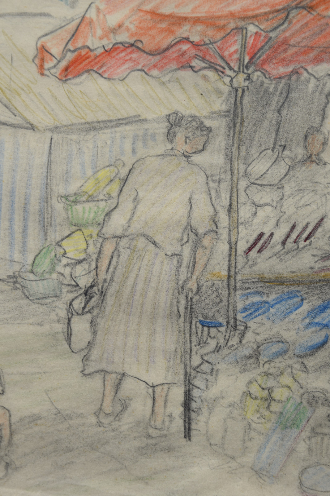 Bleistift und Farbstifte auf dünnem, pergaminähnlichem Papier