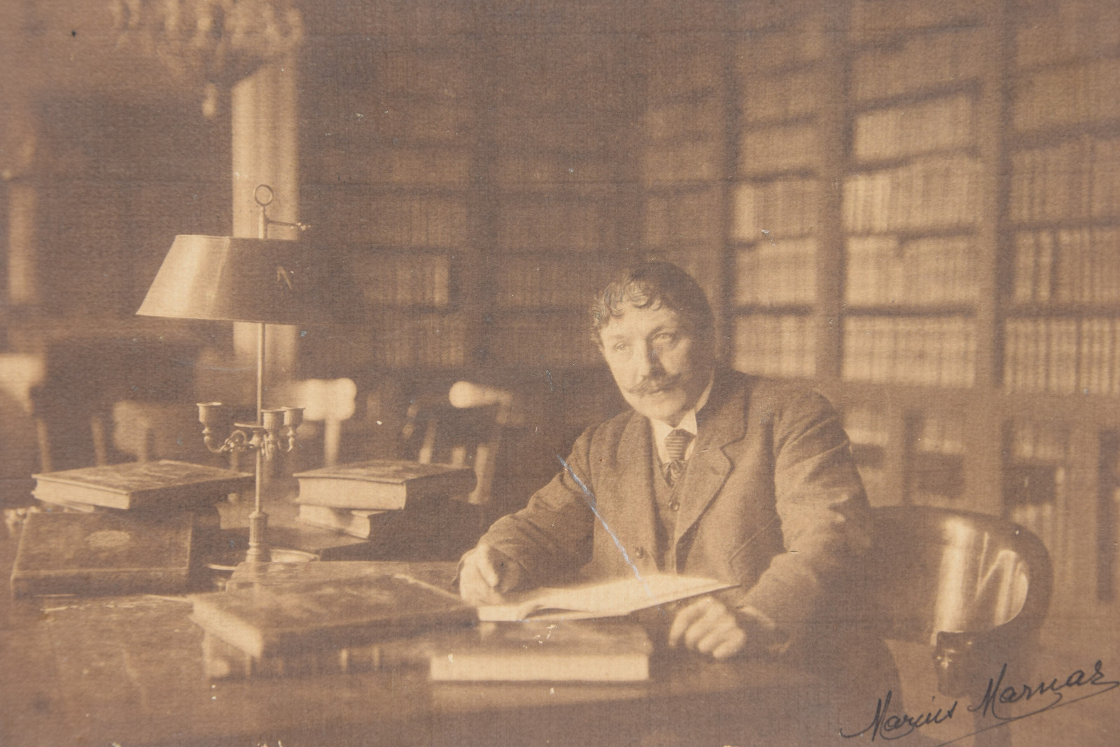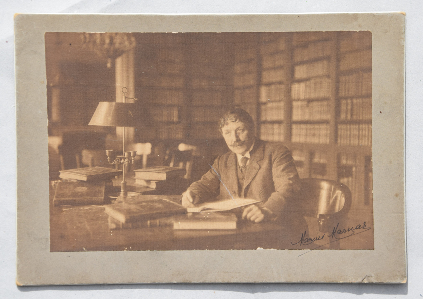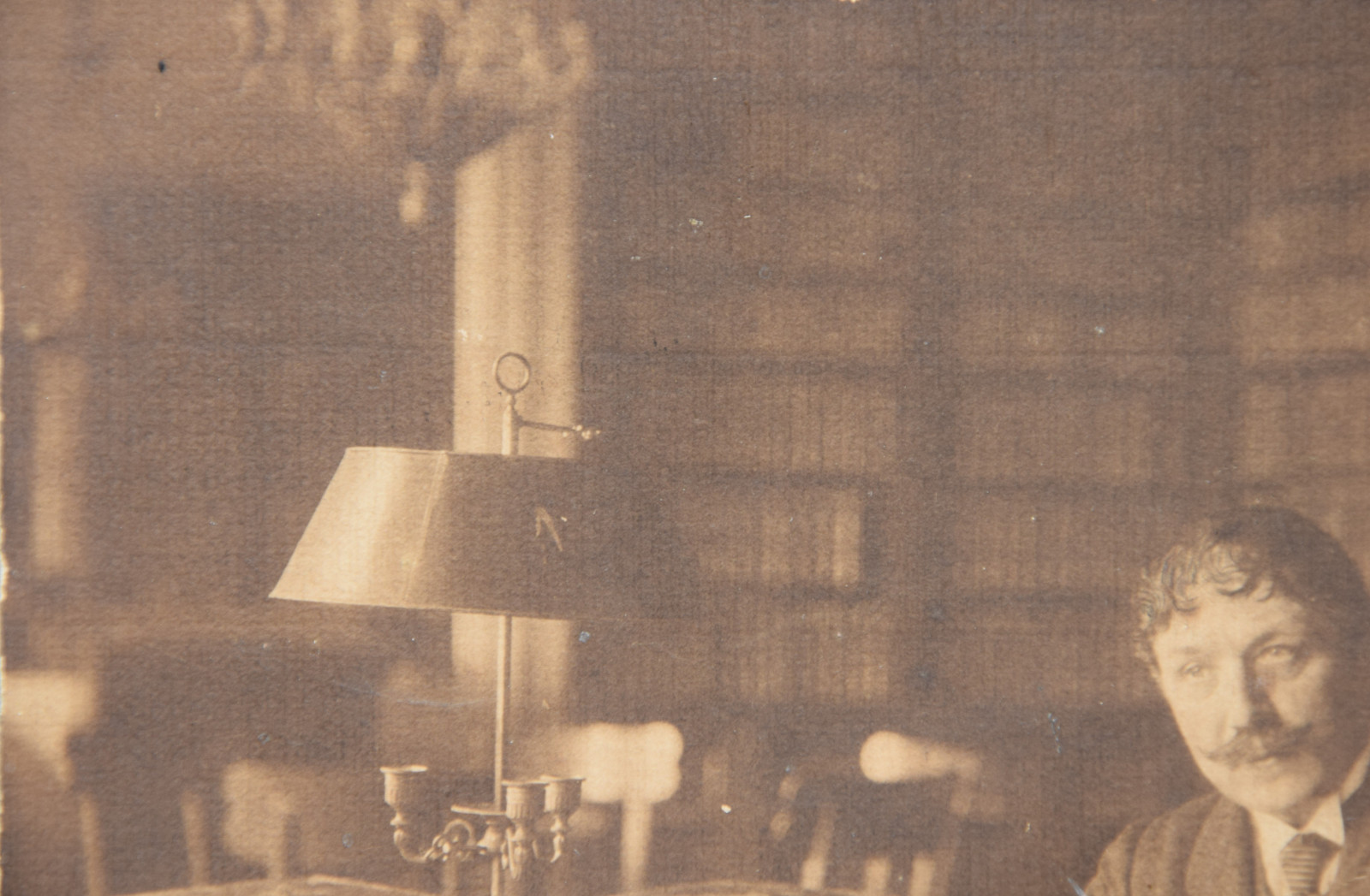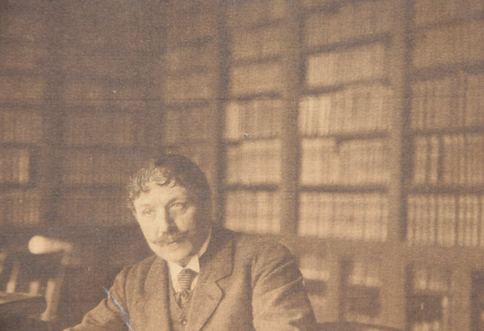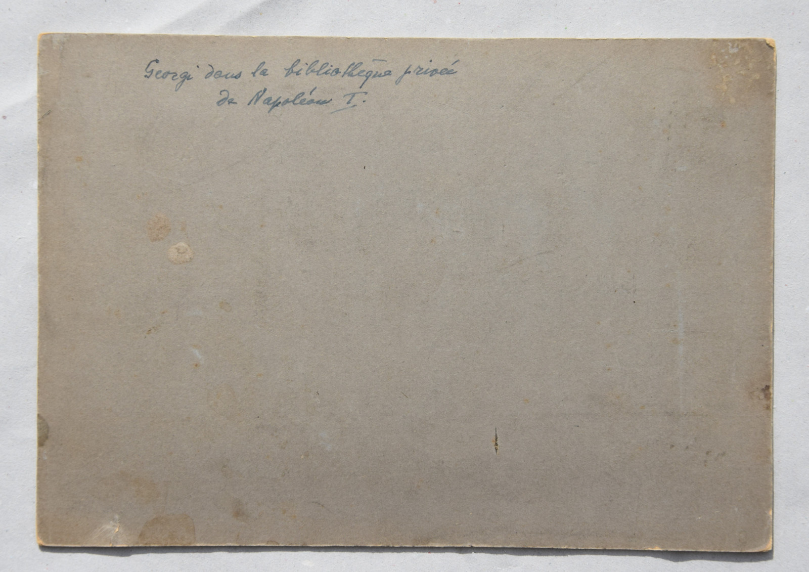 ‚Der Schriftsteller Georges d’Esparbès (1863-1944) in der Bibliothek von Napoleon I. im Schloss Fontainebleau.‘ [hierzu verso auf Karton oben in dunkler Tinte alt bezeichnet „Georgi dans la bibliothèque privée de Napoléon“]