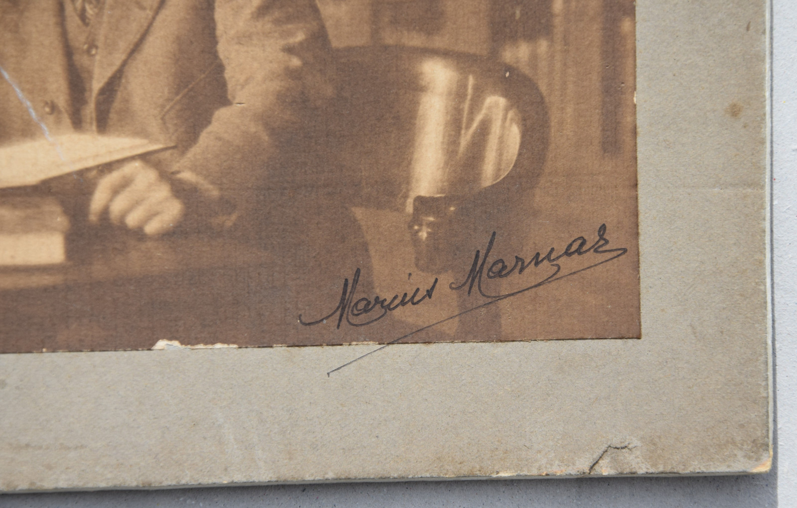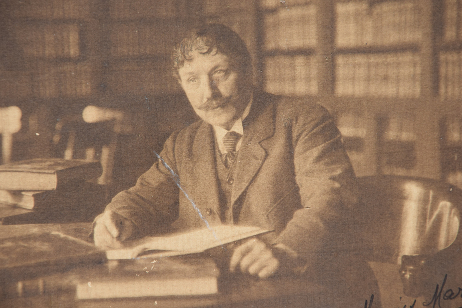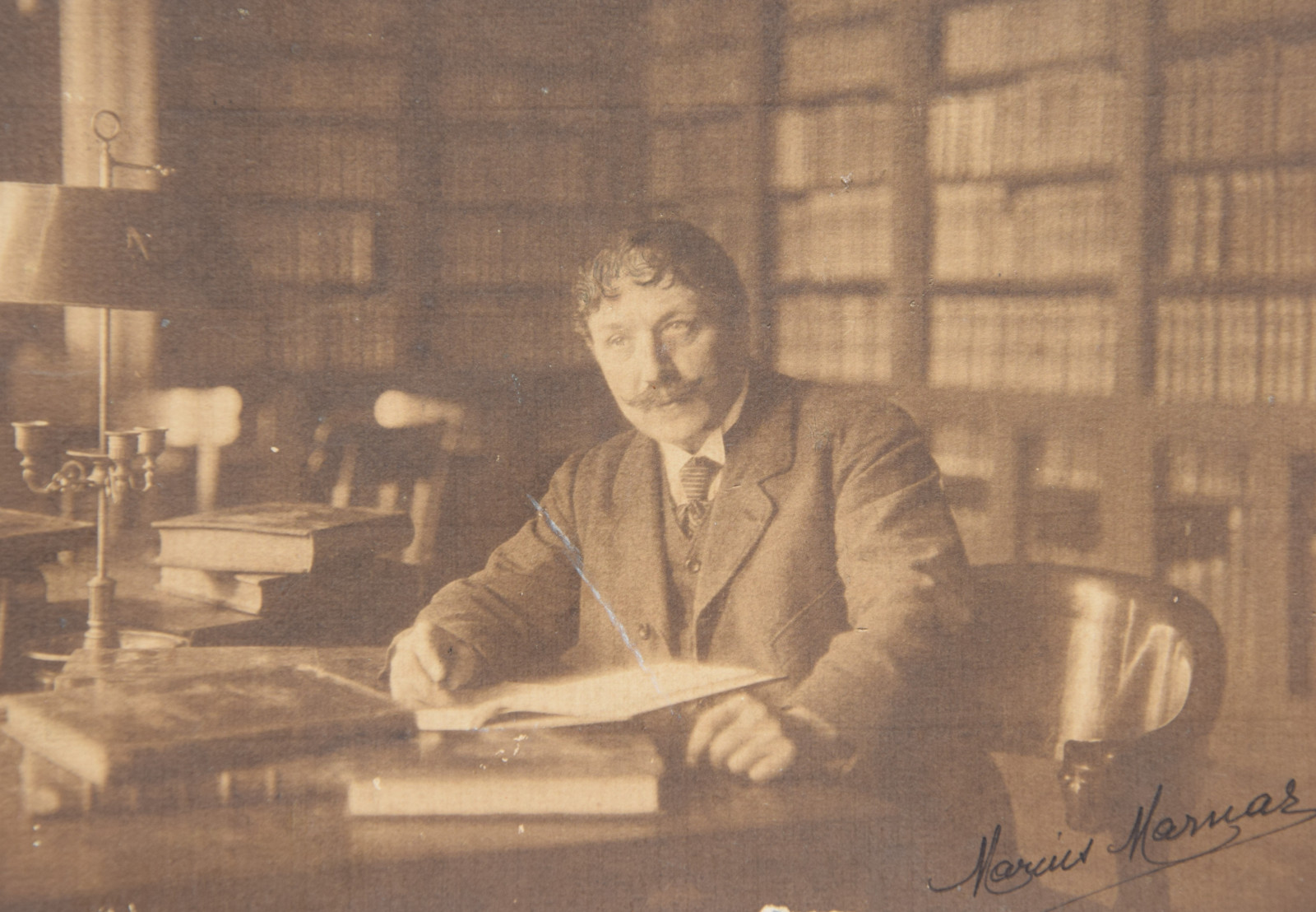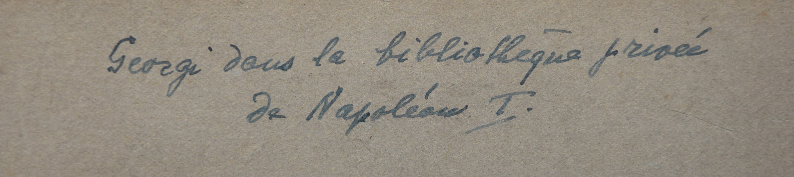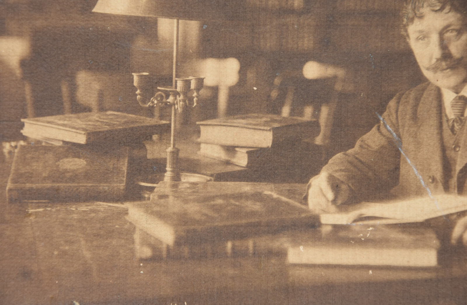 ‚Der Schriftsteller Georges d’Esparbès (1863-1944) in der Bibliothek von Napoleon I. im Schloss Fontainebleau.‘ [hierzu verso auf Karton oben in dunkler Tinte alt bezeichnet „Georgi dans la bibliothèque privée de Napoléon“]