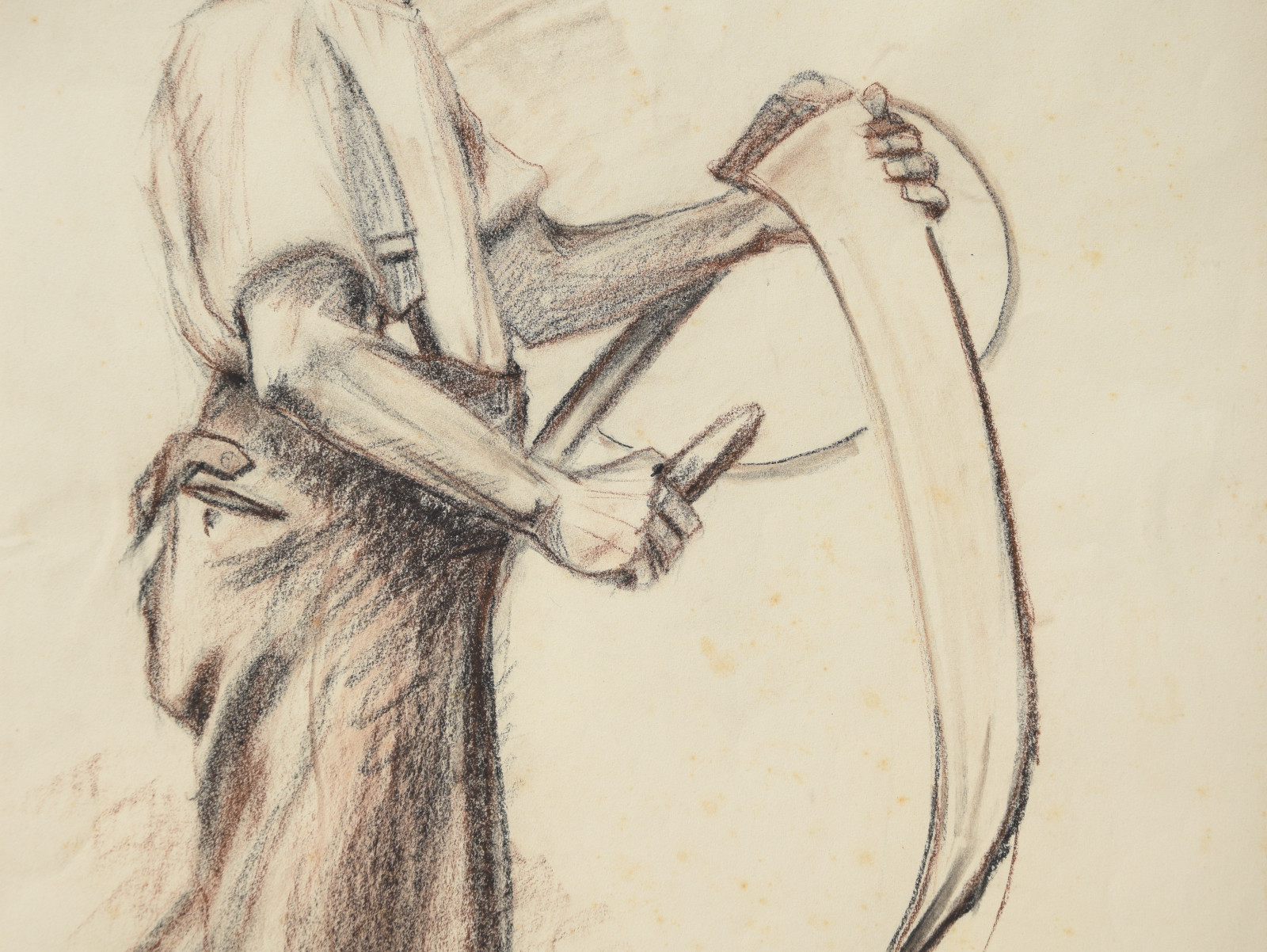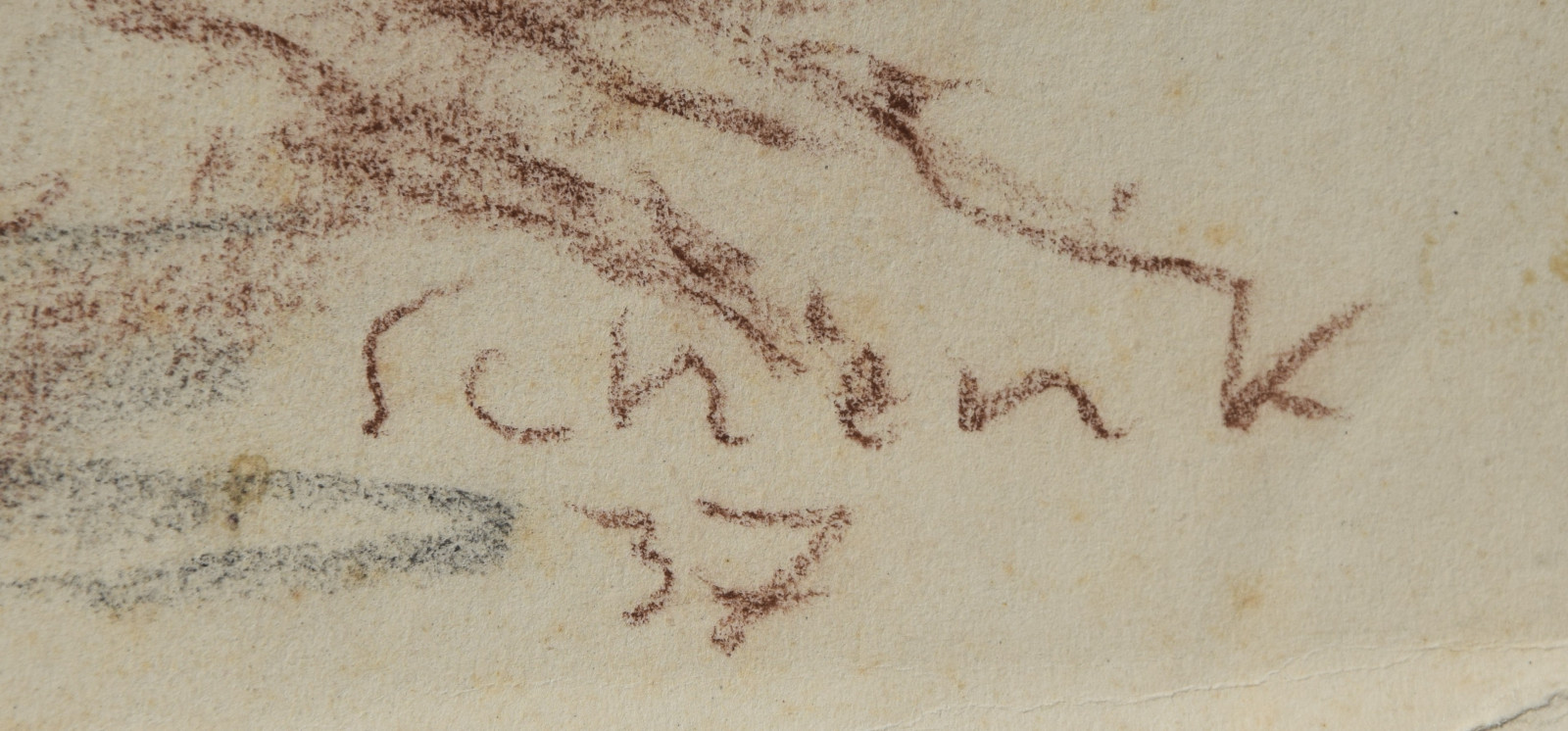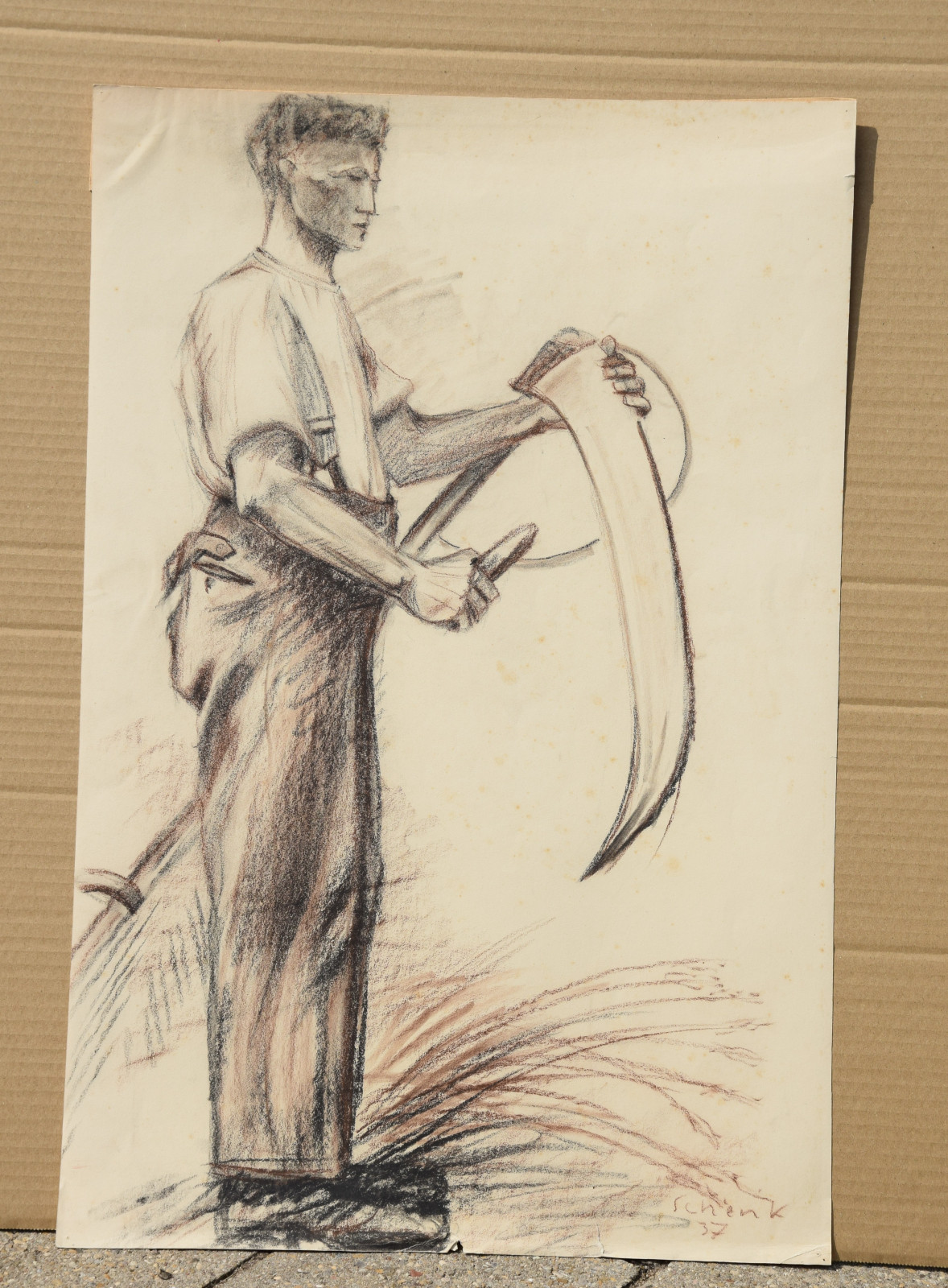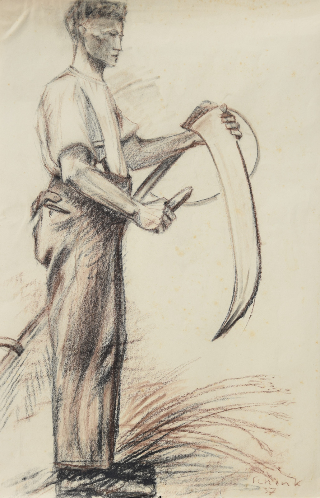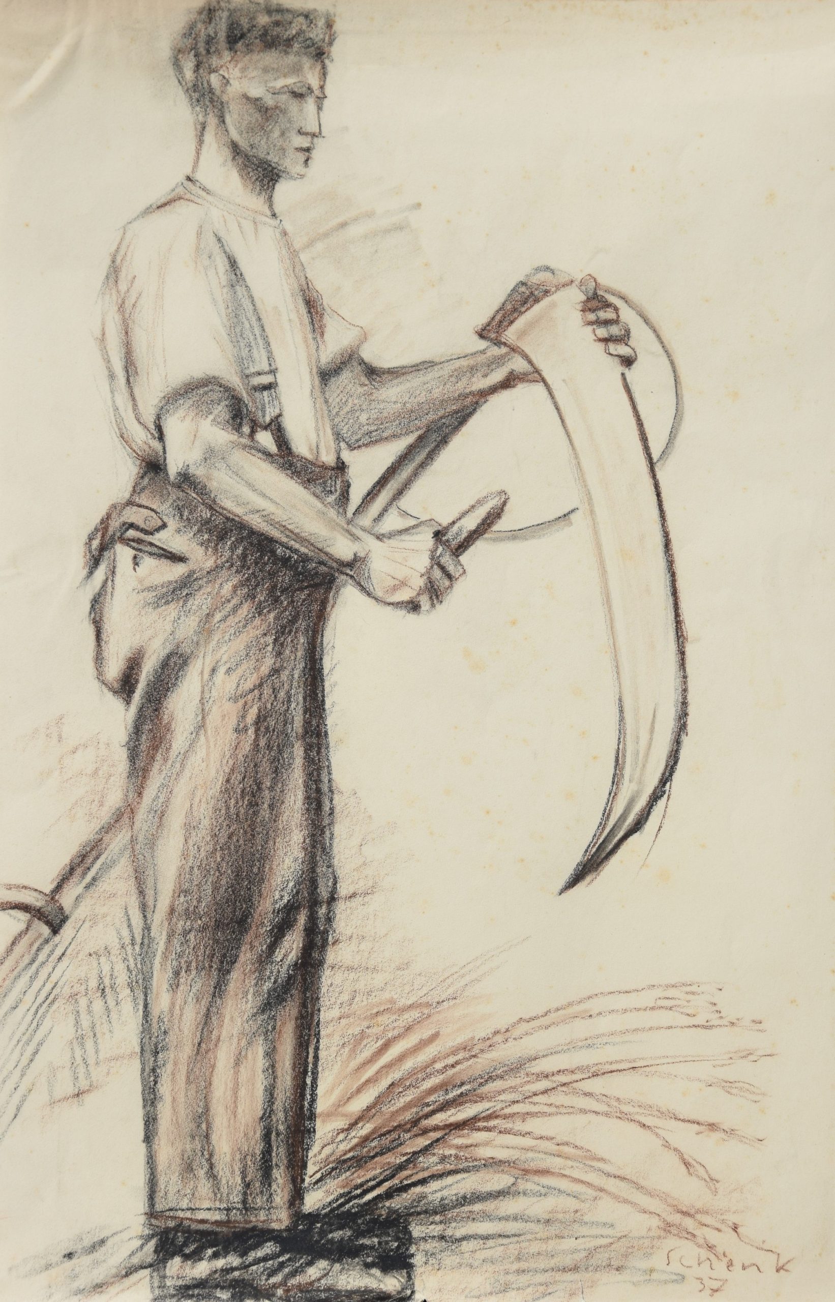 Die hier vorliegende Zeichnung entstanden 1937 und damit interessanterweise in der Zeit des Dritten Reichs, in der eine öffentliche Tätigkeit Schenks als Künstler sonst nicht dokumentiert ist. In dieser recht großen Zeichnung des Feldarbeiters zeigt sich die künstlerische Moderne noch etwas verhalten in der schnellen Strichführung. In einem engen Hochformat zeigt sich der Arbeiter, der hier in aller Ruhe seine Sense schleift.