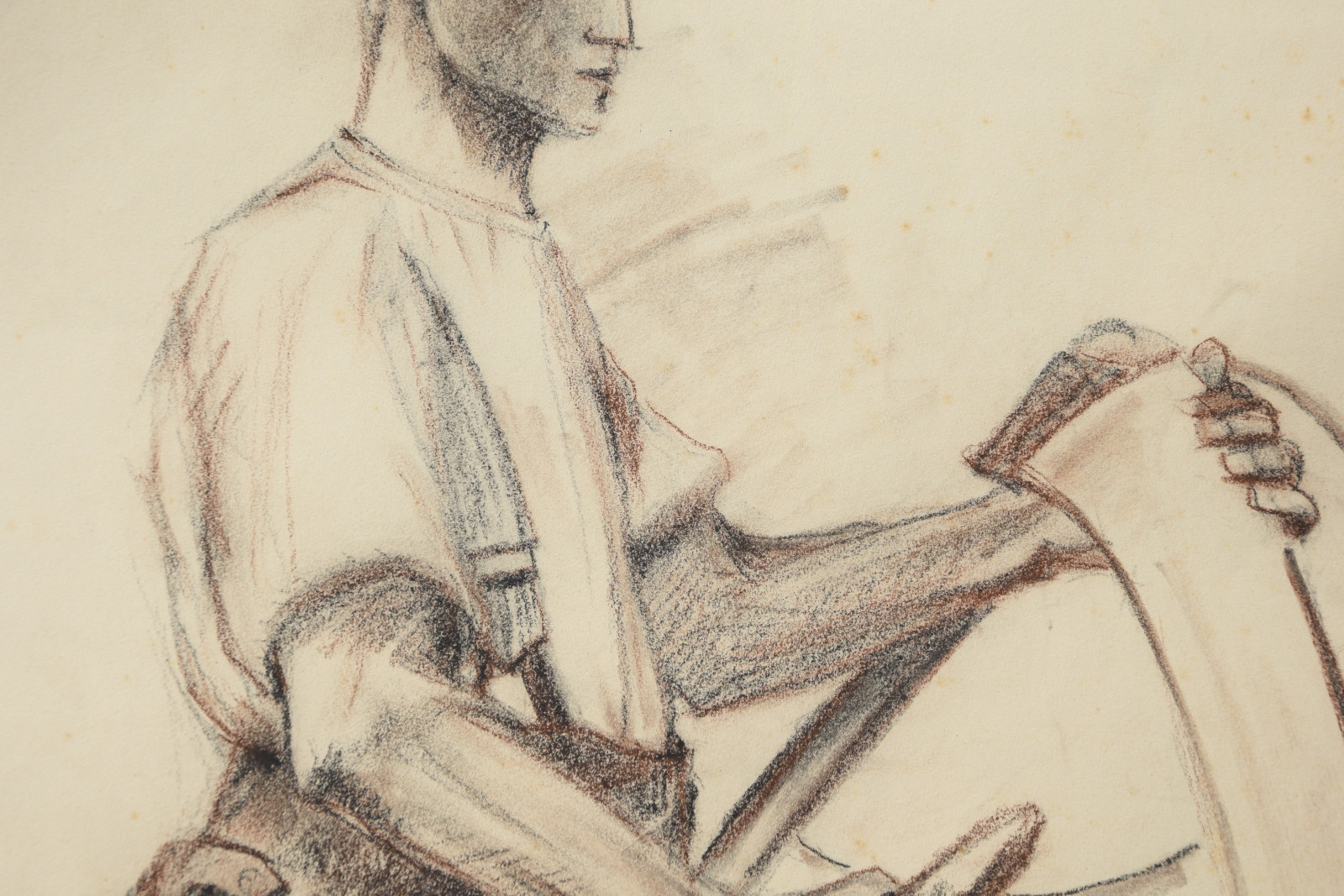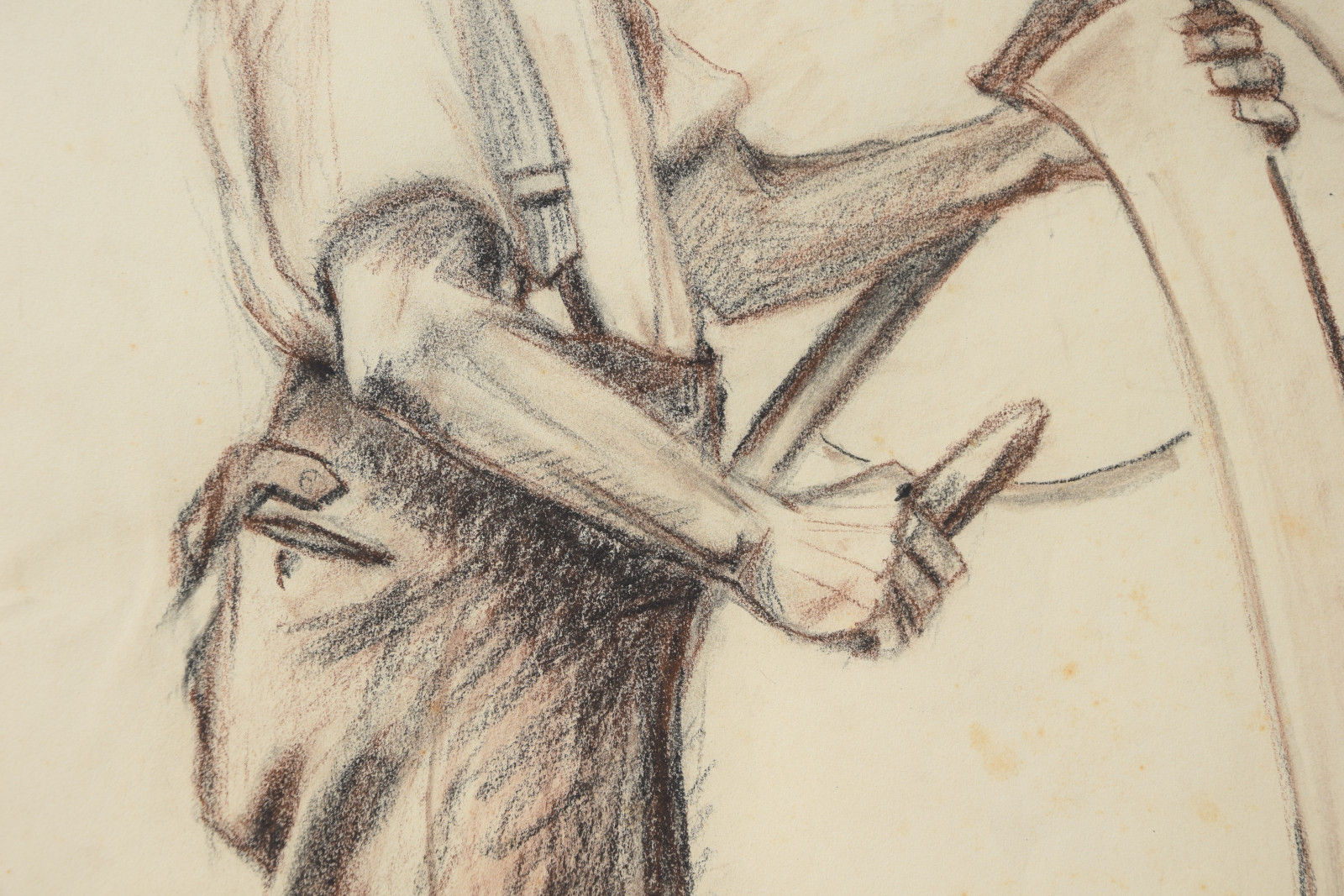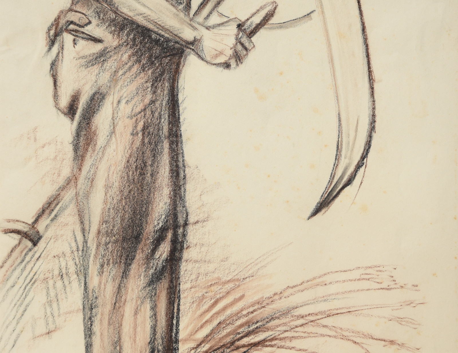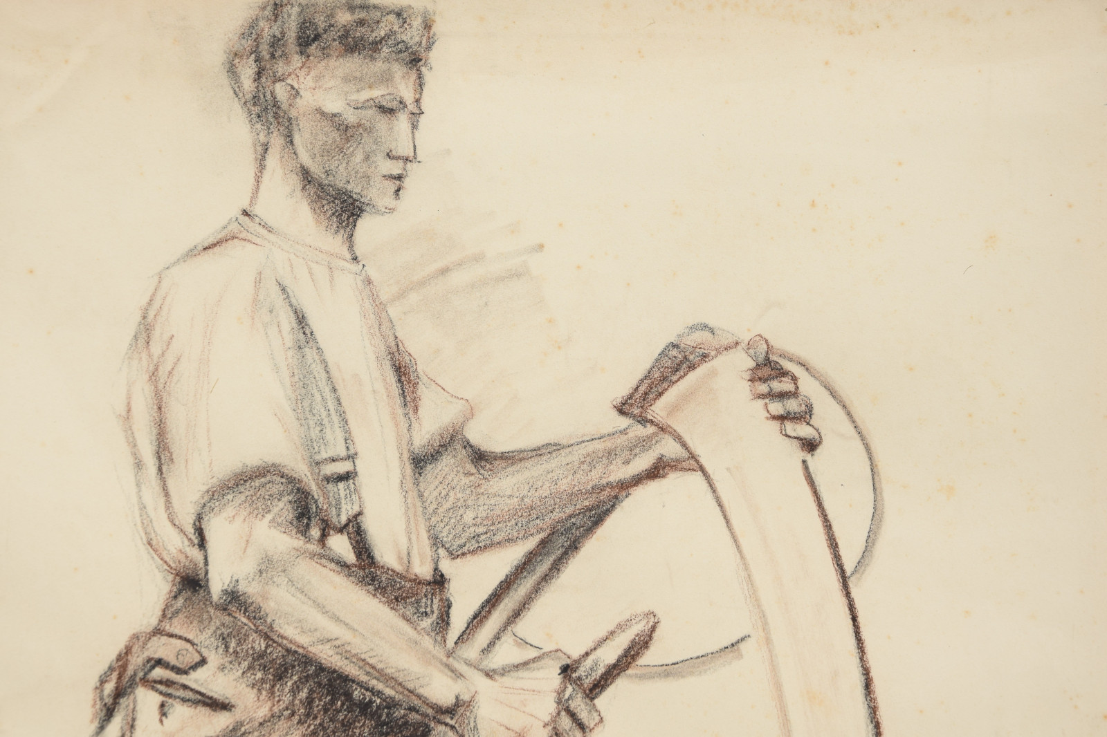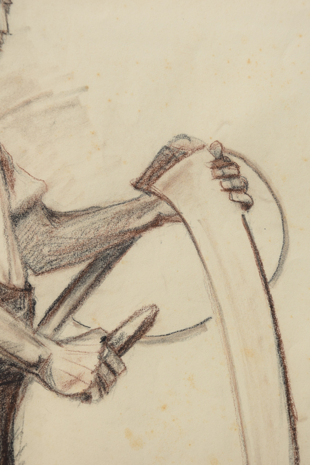 Die hier vorliegende Zeichnung entstanden 1937 und damit interessanterweise in der Zeit des Dritten Reichs, in der eine öffentliche Tätigkeit Schenks als Künstler sonst nicht dokumentiert ist. In dieser recht großen Zeichnung des Feldarbeiters zeigt sich die künstlerische Moderne noch etwas verhalten in der schnellen Strichführung. In einem engen Hochformat zeigt sich der Arbeiter, der hier in aller Ruhe seine Sense schleift.