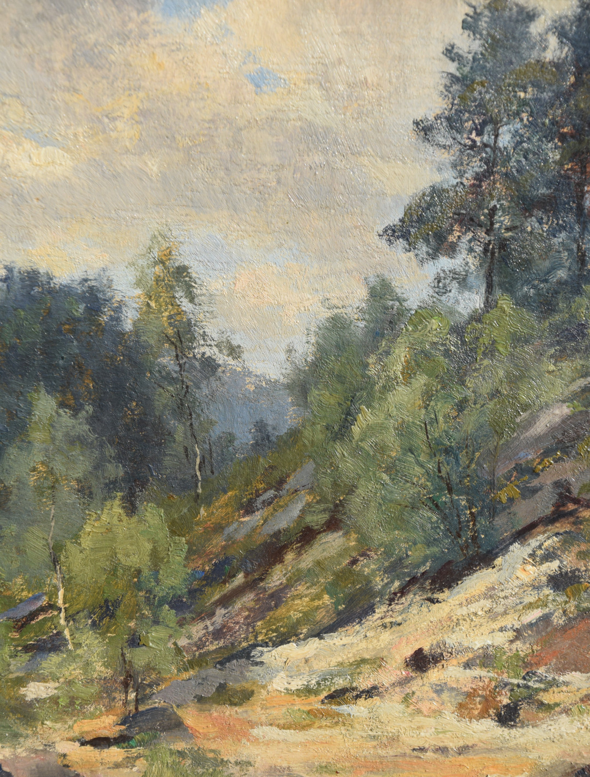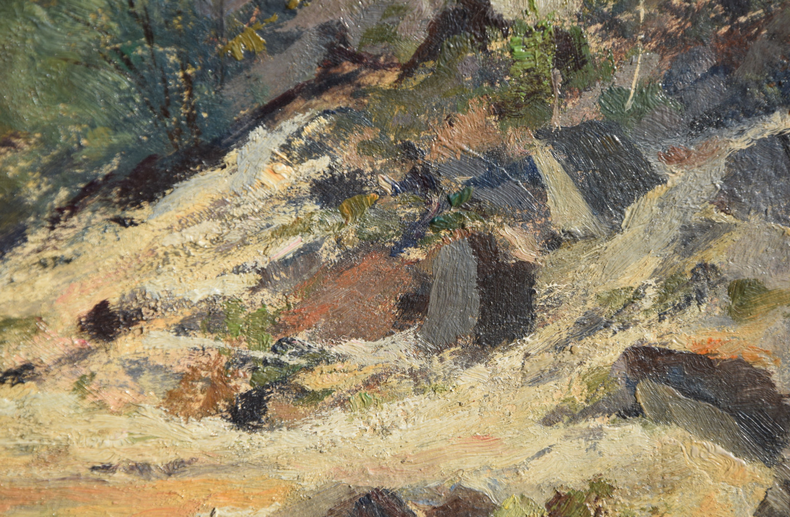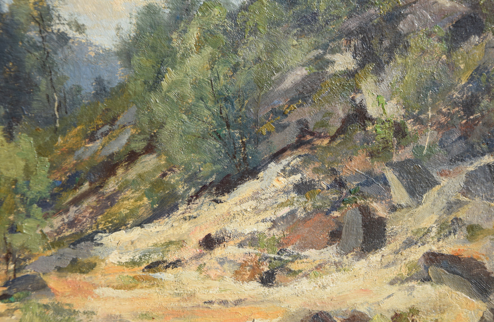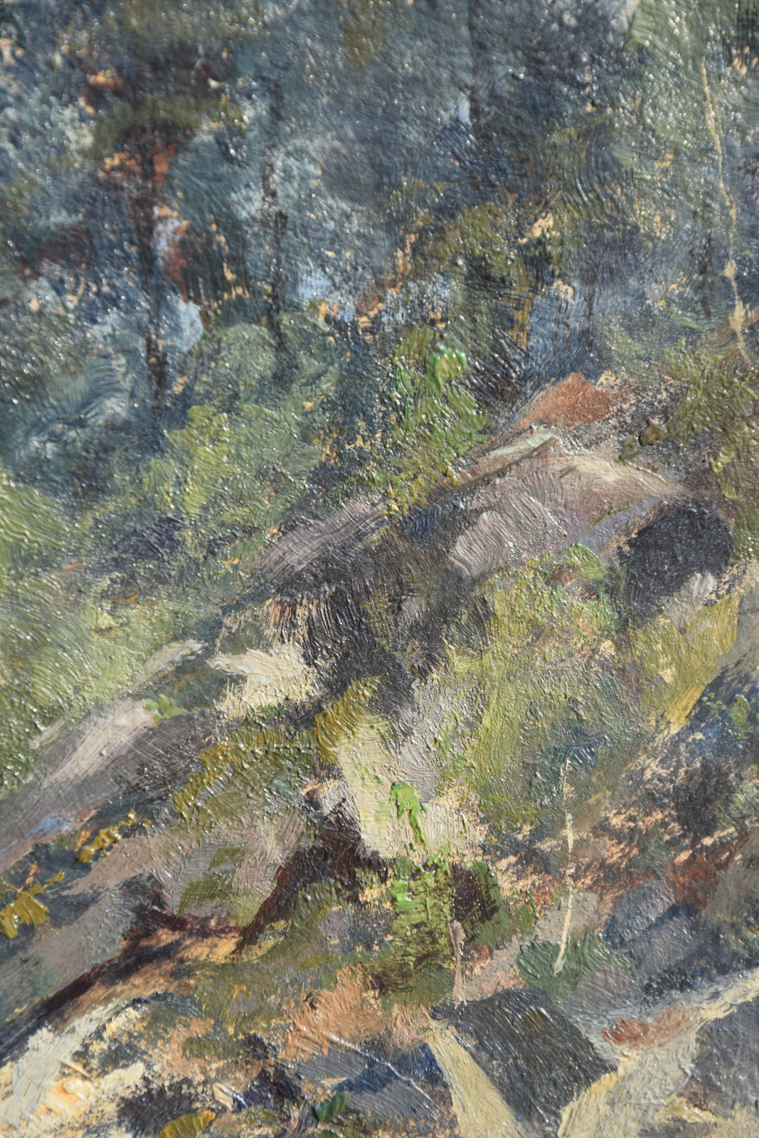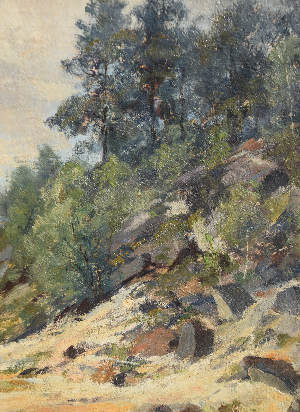 Der rückseitigen Betitelung nach wird diese, sonst nicht näher spezifizierte Halde, in die Sächsische Schweiz zu lokalisieren sein. Die Steine und Felsen türmen sich hier auf und bilden den sich zum rechten Bildrand hin erhebenden Hügel. Dazwischen stehen immer wieder Laub- und Nadelbäume, die im Hintergrund sich zum Wald verdichten. Über der Szenerie liegt ein stark bewölkter Himmel, durch den aber immer mal wieder kleinere Streifen Blaus durchbrechen.
