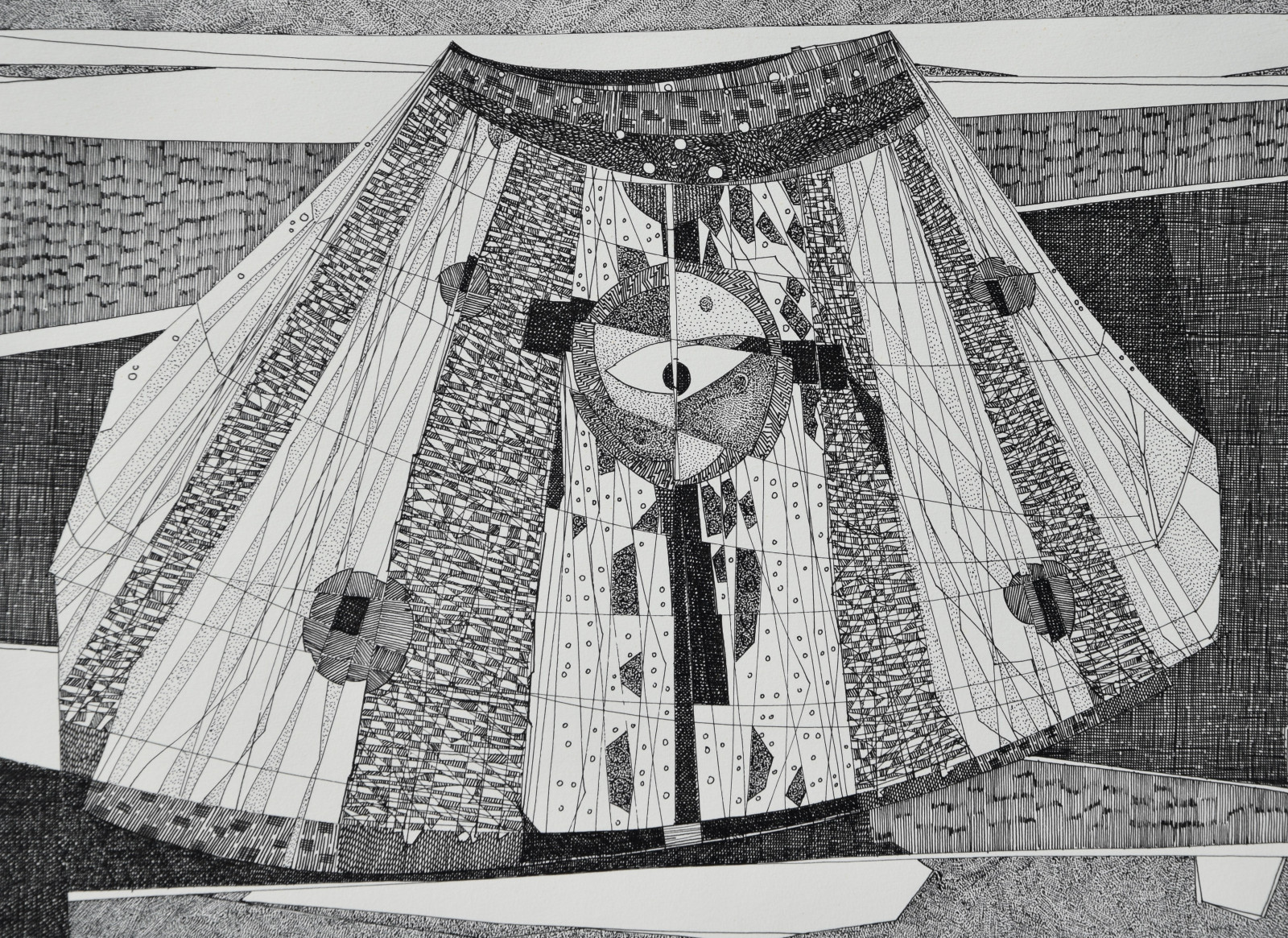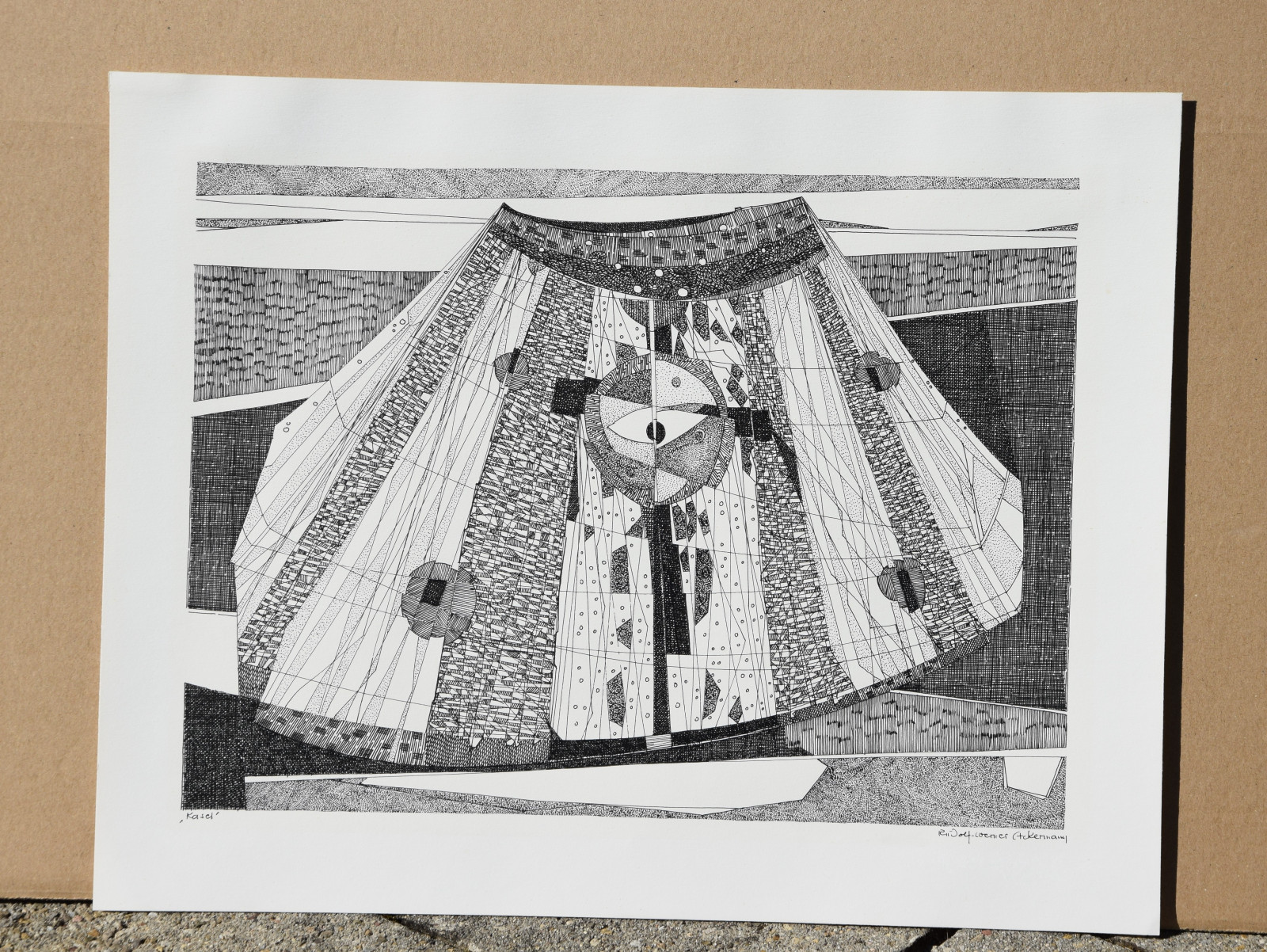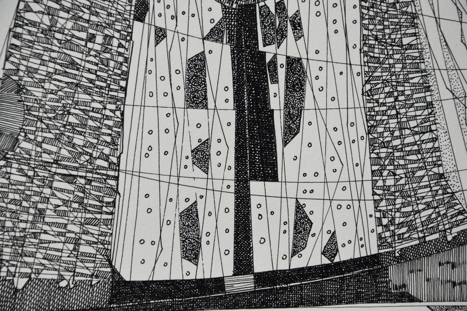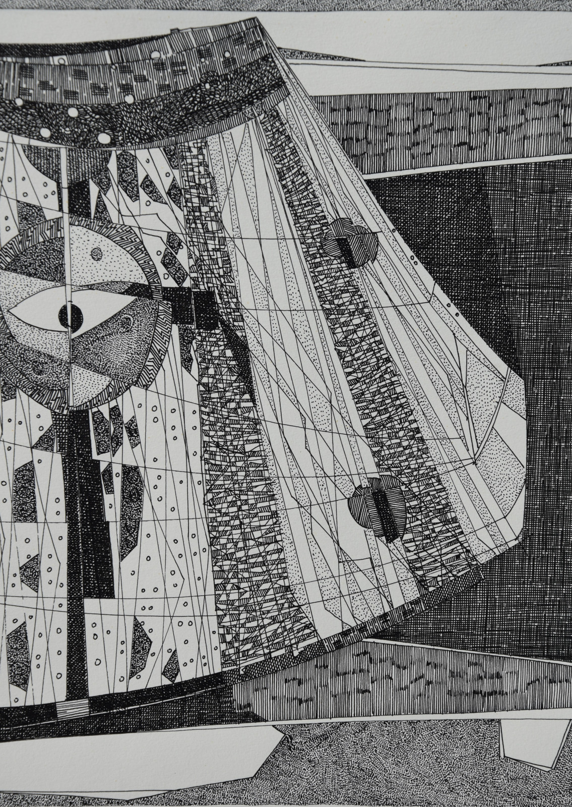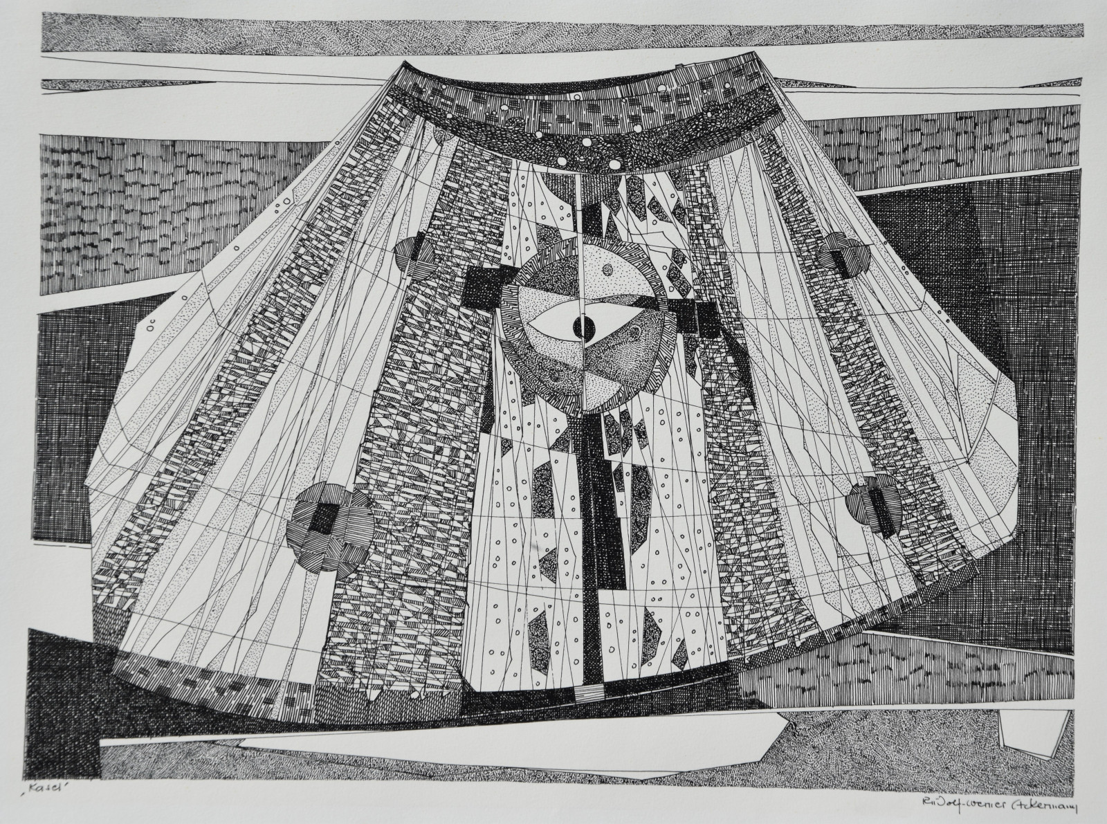 Die hier vorliegende Tuschfederzeichnung Rudolf-Werner Ackermanns ist ein wunderbares Beispiel für dessen filigrane, dichte Zeichenkunst. Ackermann zeigt hier dem Titel nach eine Kasel, das liturgische Obergewand eines Bischofs oder Priesters bei der heiligen Messe, wobei er diese in einem hohen Abstraktionsgrad, zergliedert ausführt, aber dennoch im Gegenständlichen bleibt. Durch die ganz unterschiedlichen Linienführungen und Schraffuren, wie auch das Einfügen verschiedener Formen und die abgestuften Grauwerte gelingt es Ackermann zudem eine Tiefe und vibrierende Dynamik in das Bild zu legen.