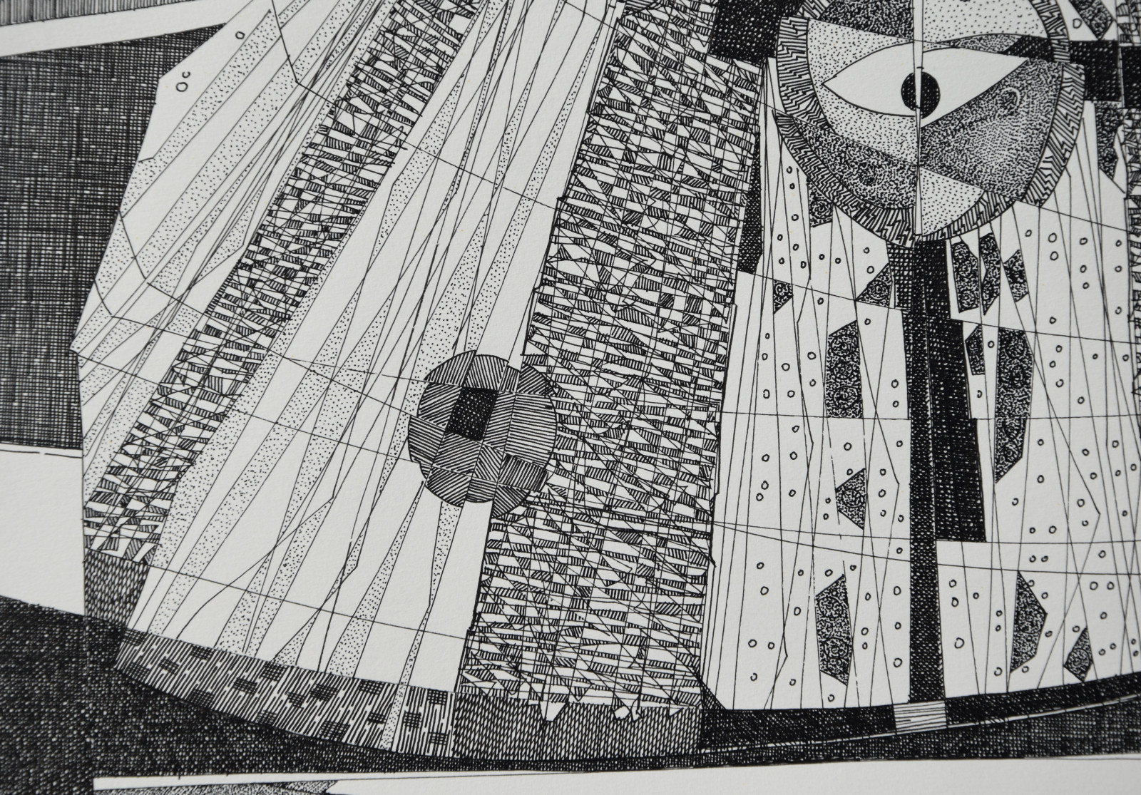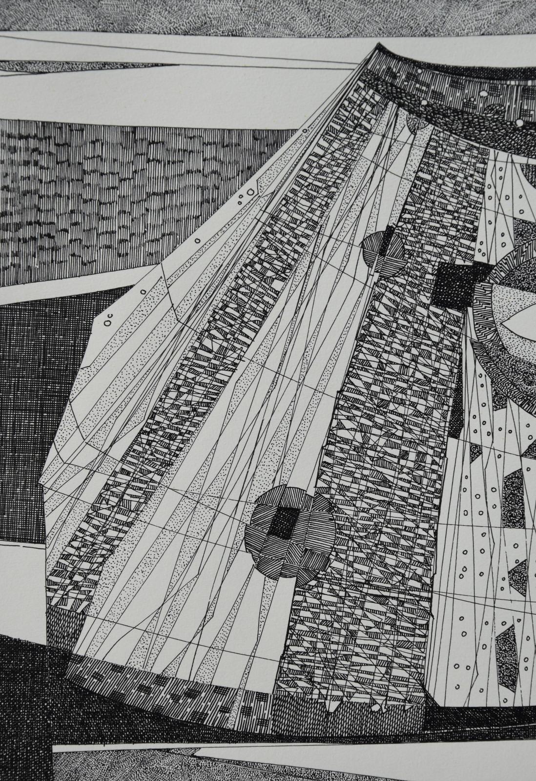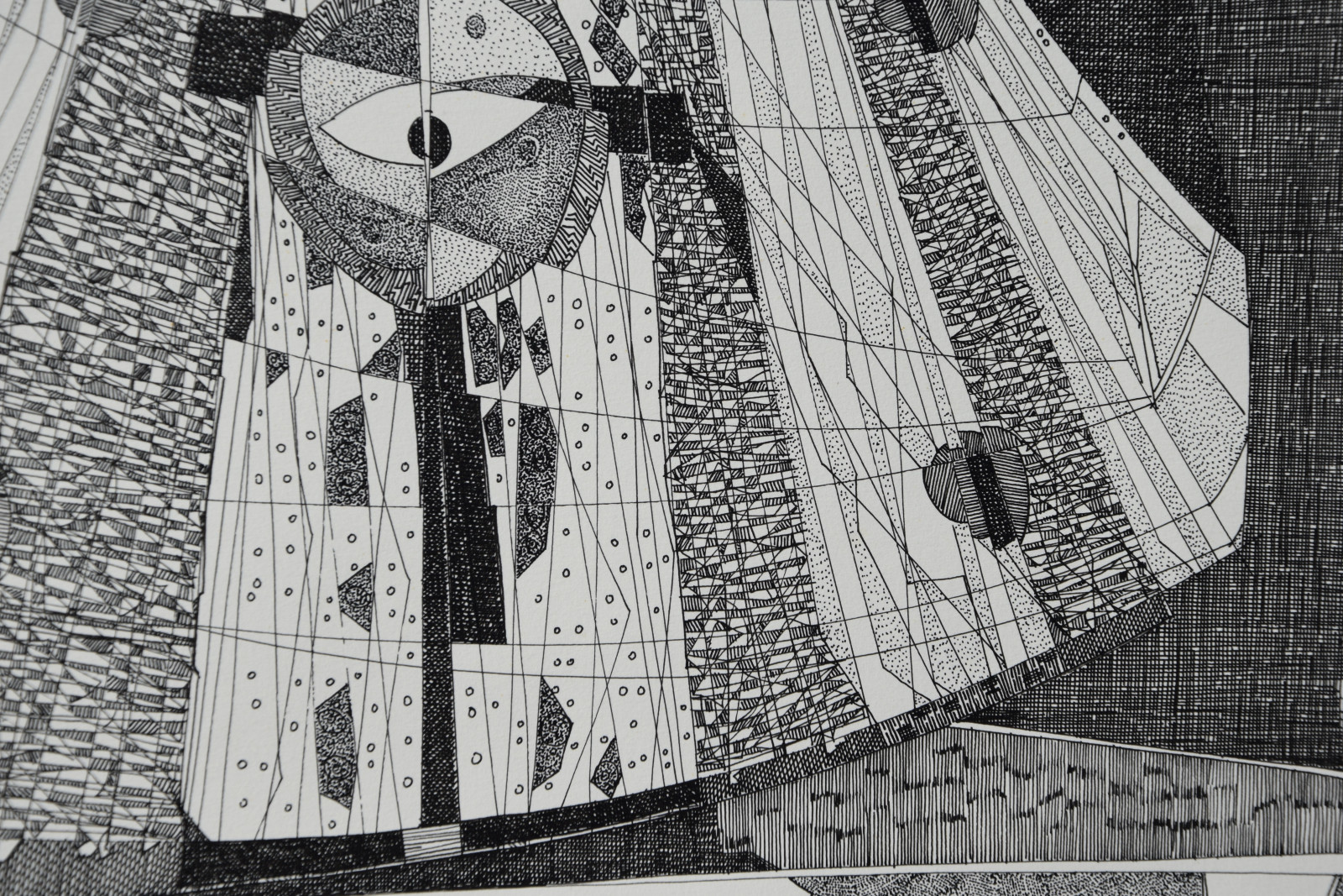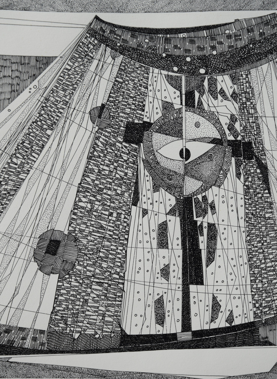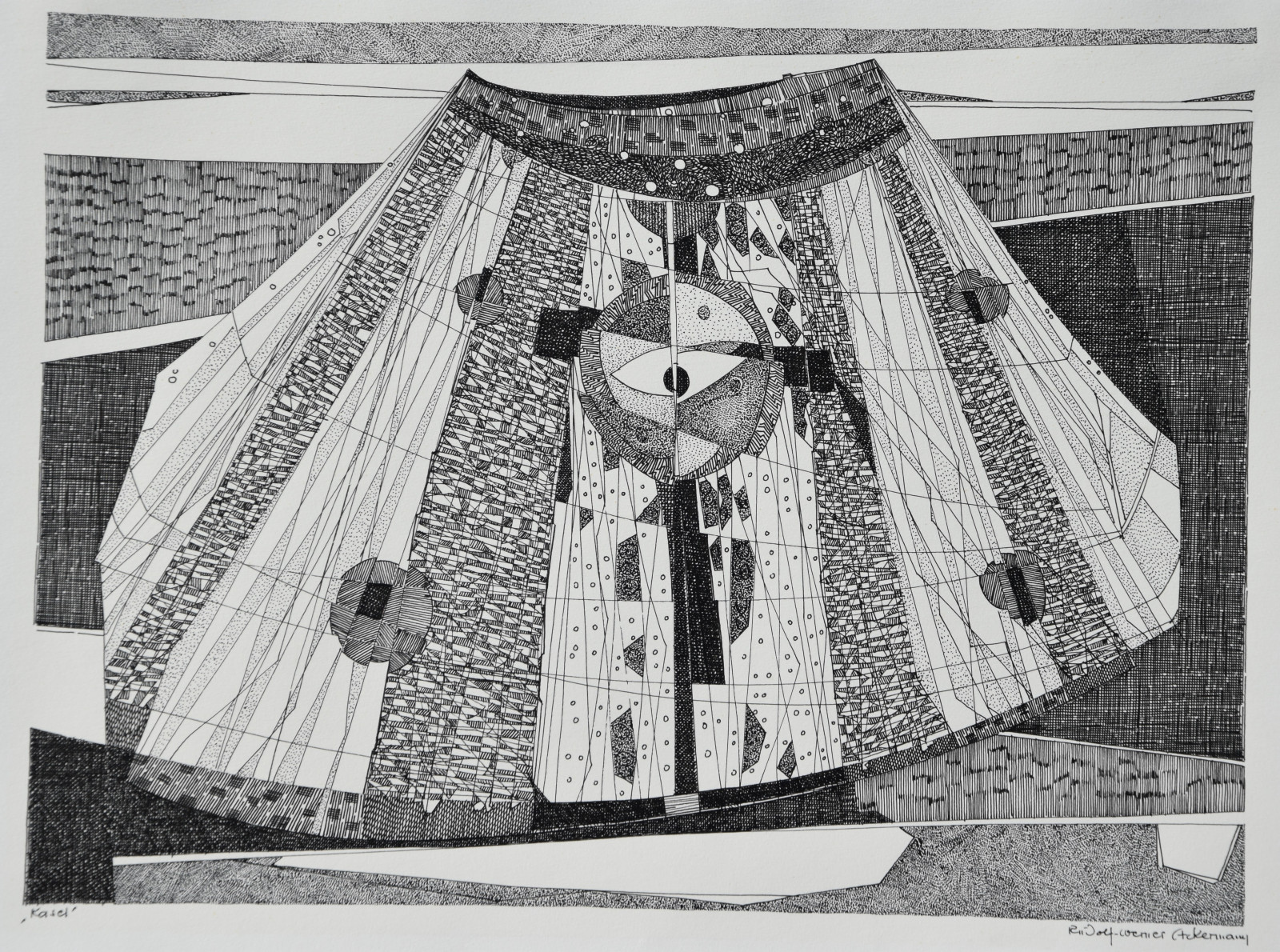 Die hier vorliegende Tuschfederzeichnung Rudolf-Werner Ackermanns ist ein wunderbares Beispiel für dessen filigrane, dichte Zeichenkunst. Ackermann zeigt hier dem Titel nach eine Kasel, das liturgische Obergewand eines Bischofs oder Priesters bei der heiligen Messe, wobei er diese in einem hohen Abstraktionsgrad, zergliedert ausführt, aber dennoch im Gegenständlichen bleibt. Durch die ganz unterschiedlichen Linienführungen und Schraffuren, wie auch das Einfügen verschiedener Formen und die abgestuften Grauwerte gelingt es Ackermann zudem eine Tiefe und vibrierende Dynamik in das Bild zu legen.