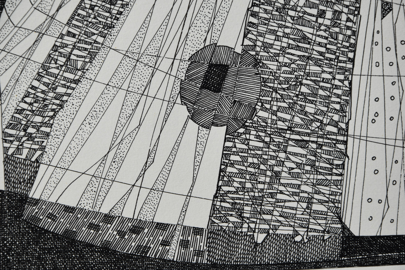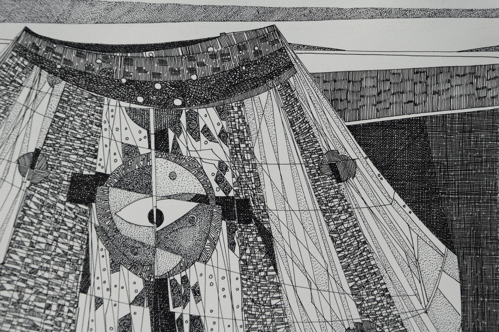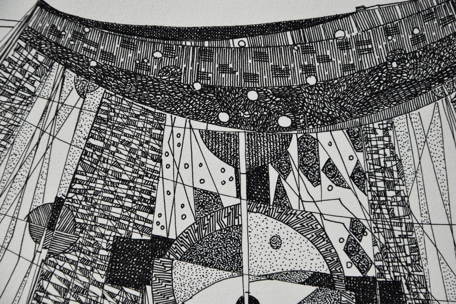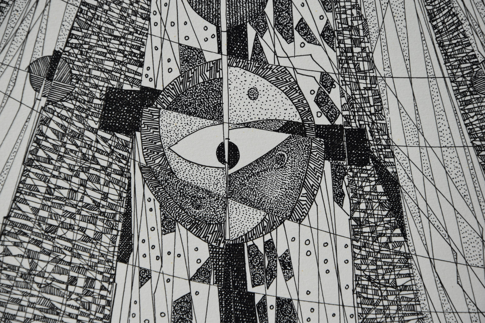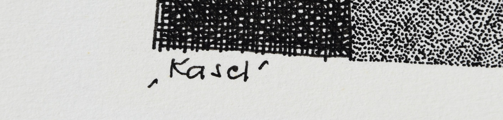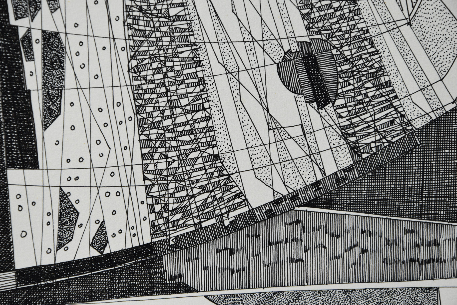 Die hier vorliegende Tuschfederzeichnung Rudolf-Werner Ackermanns ist ein wunderbares Beispiel für dessen filigrane, dichte Zeichenkunst. Ackermann zeigt hier dem Titel nach eine Kasel, das liturgische Obergewand eines Bischofs oder Priesters bei der heiligen Messe, wobei er diese in einem hohen Abstraktionsgrad, zergliedert ausführt, aber dennoch im Gegenständlichen bleibt. Durch die ganz unterschiedlichen Linienführungen und Schraffuren, wie auch das Einfügen verschiedener Formen und die abgestuften Grauwerte gelingt es Ackermann zudem eine Tiefe und vibrierende Dynamik in das Bild zu legen.