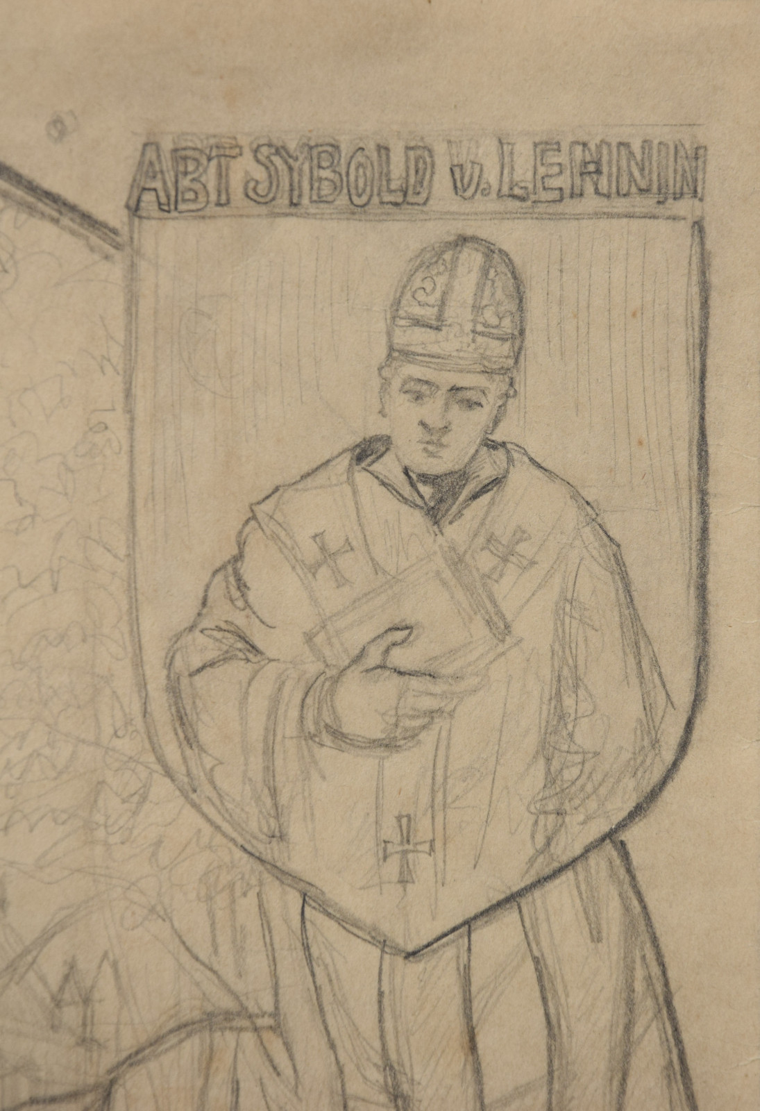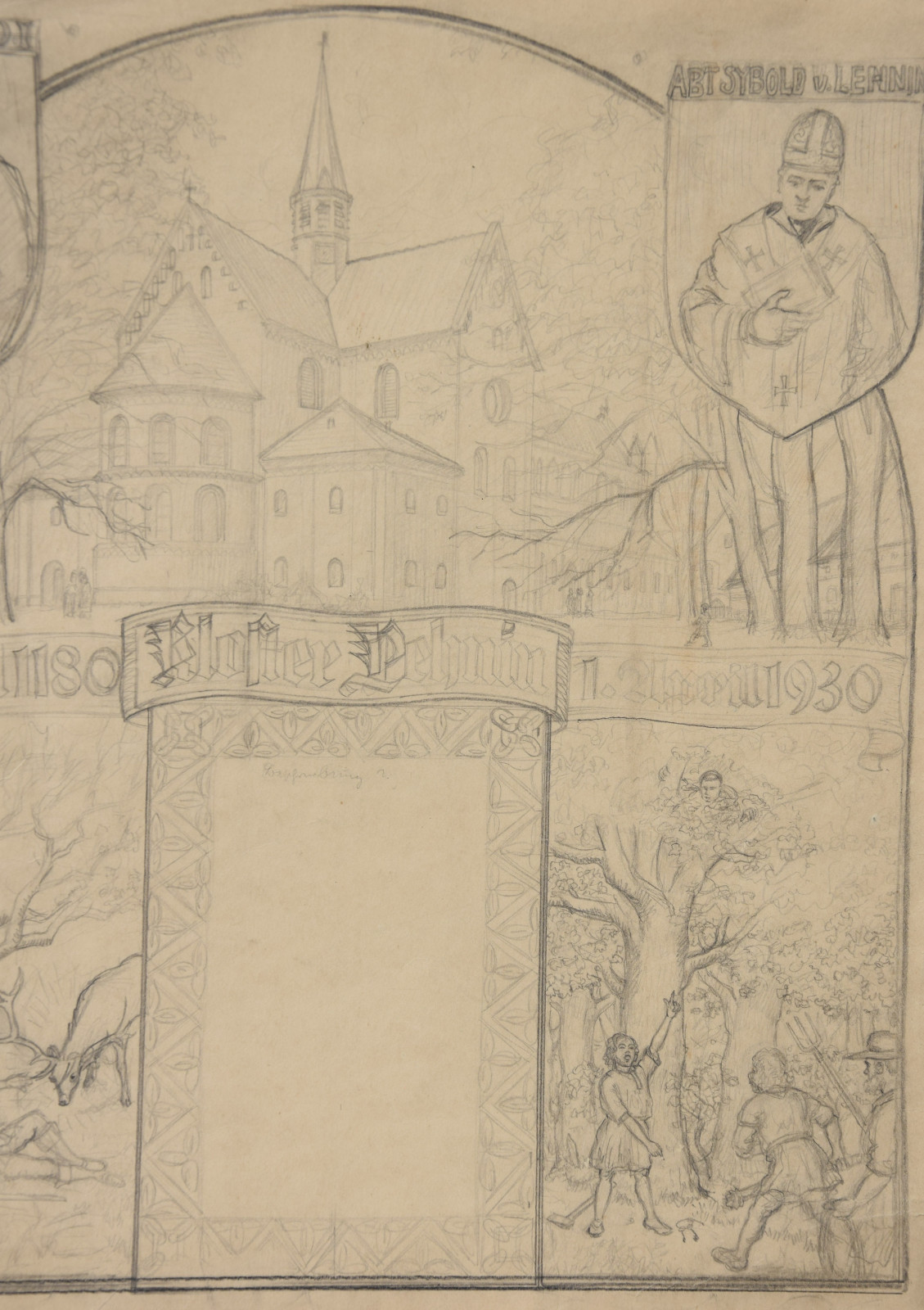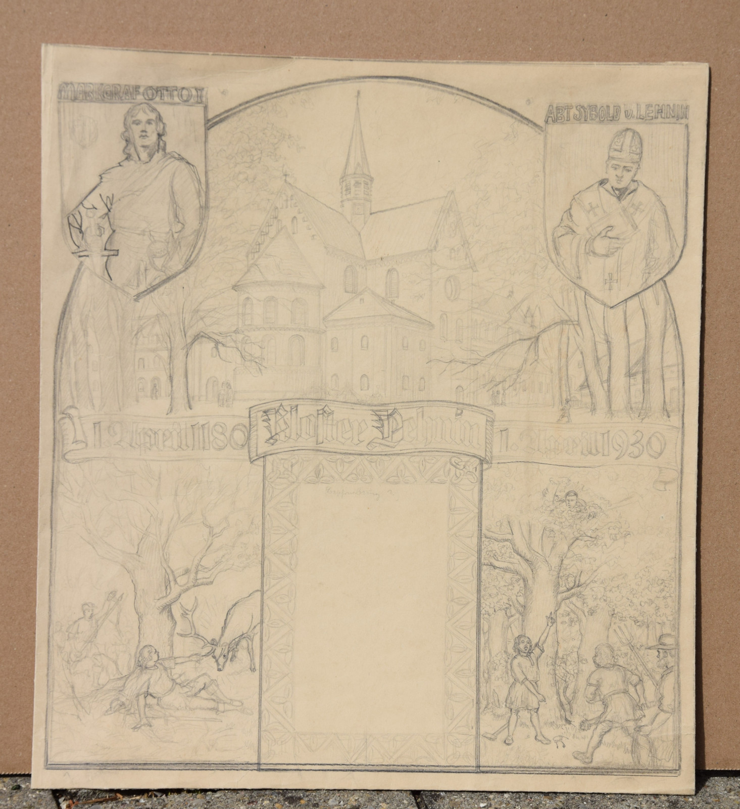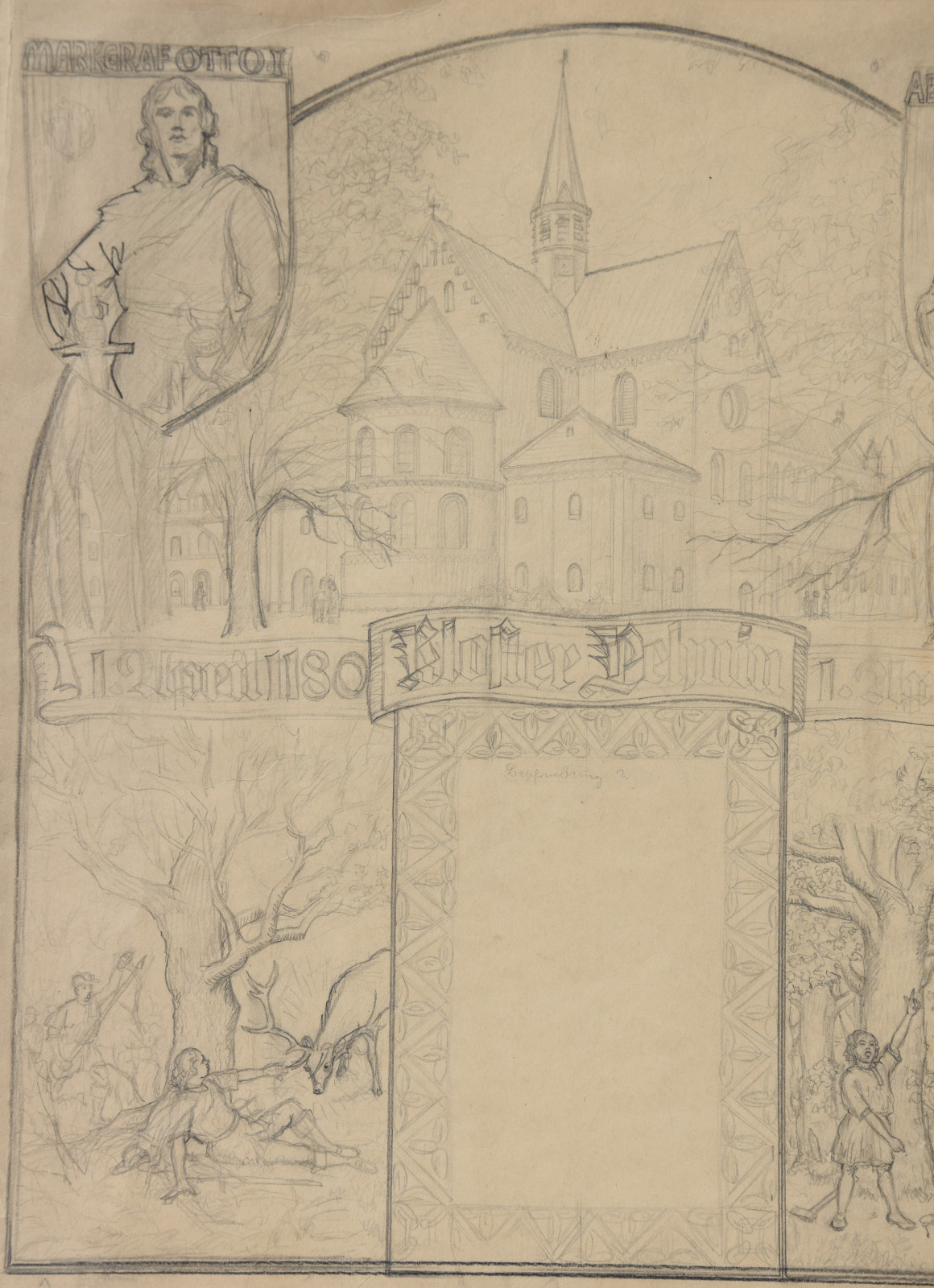 Die vorliegende Zeichnung wird Kraska im Vorfeld der 750-Jahrfeier zum Bestehen des, südwestlich von Potsdam gelegenen, Klosters Lehnin geschaffen haben. In der Bildmitte zeigt sich das Kloster, links oben und unten der Klosterstifter Otto I., sowie rechts oben und unten der erste Klosterabt Sibold/Sybold. Womöglich war die Zeichnung als Entwurf für eine Illustration angelegt.