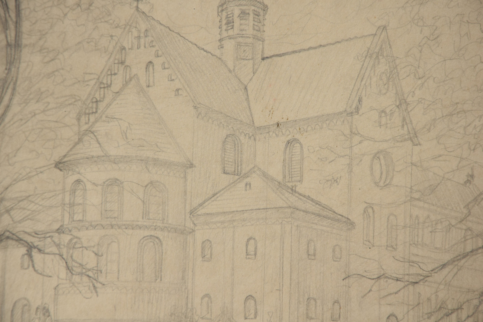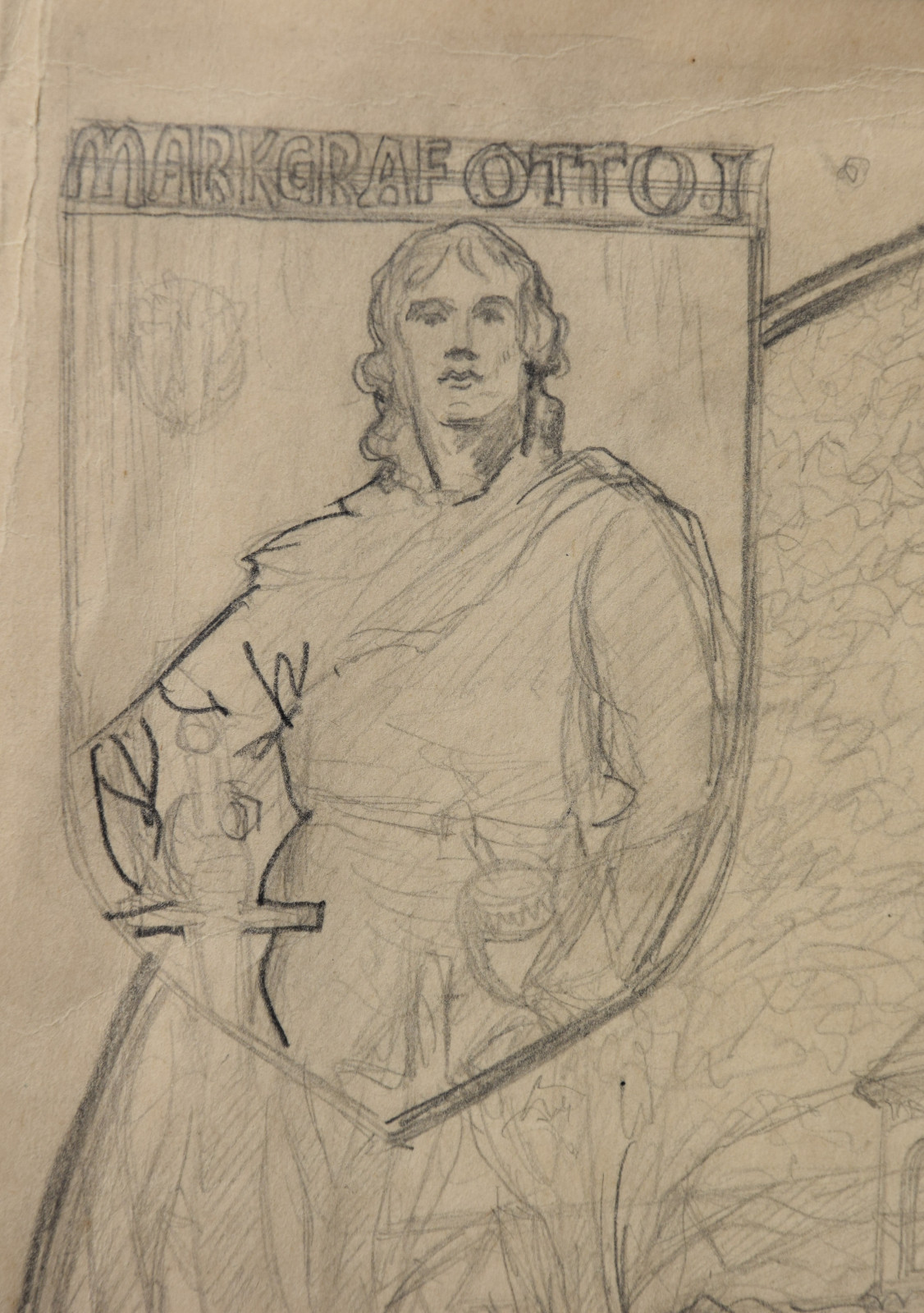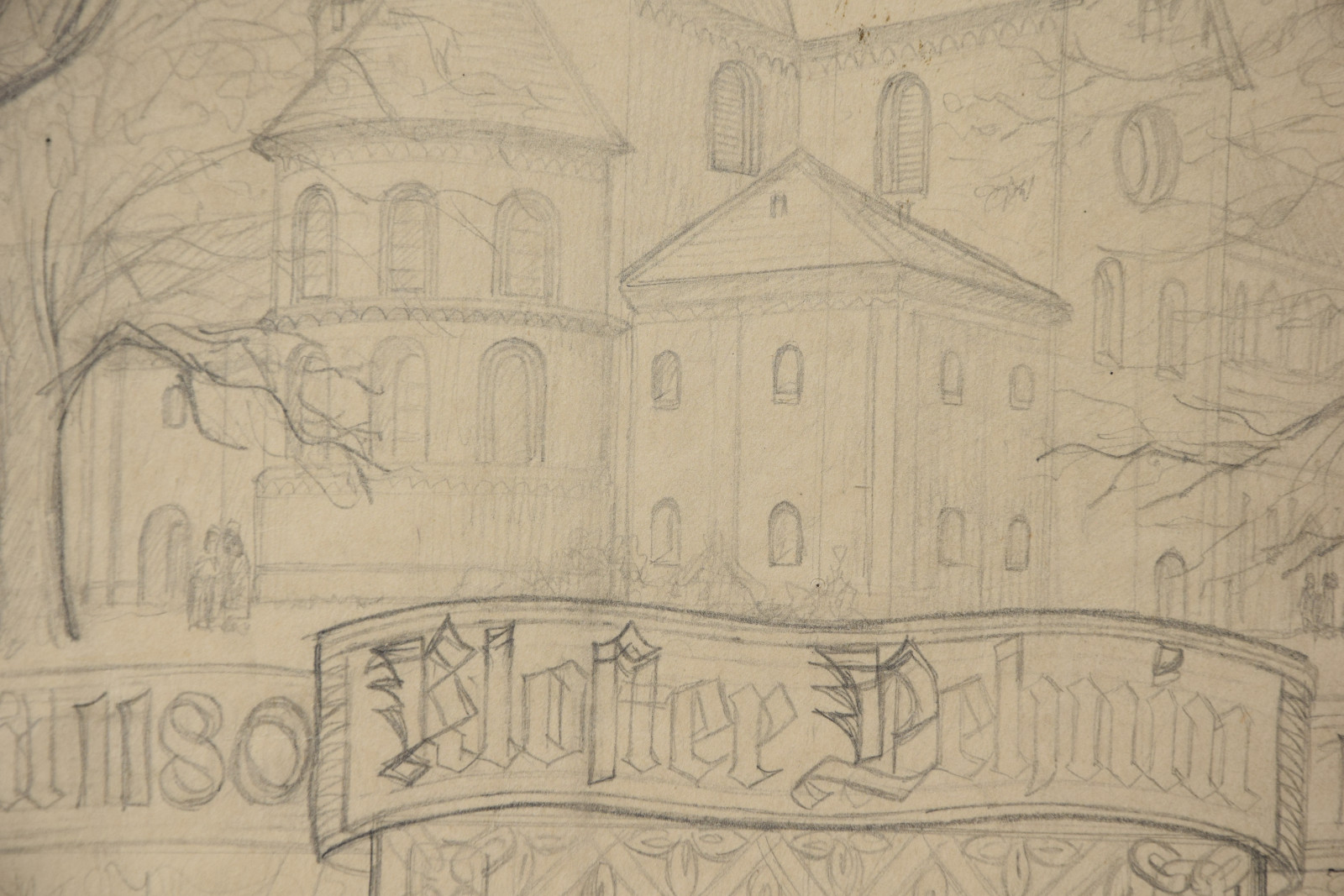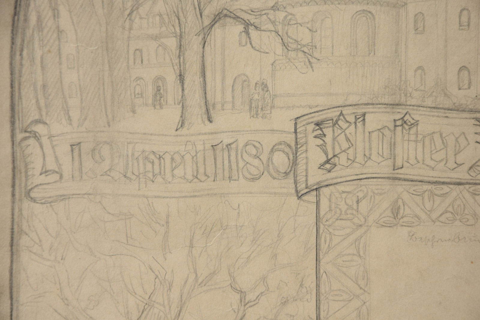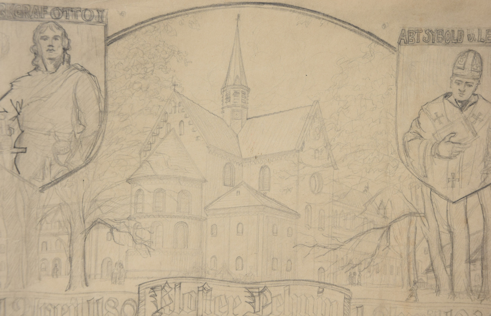 Die vorliegende Zeichnung wird Kraska im Vorfeld der 750-Jahrfeier zum Bestehen des, südwestlich von Potsdam gelegenen, Klosters Lehnin geschaffen haben. In der Bildmitte zeigt sich das Kloster, links oben und unten der Klosterstifter Otto I., sowie rechts oben und unten der erste Klosterabt Sibold/Sybold. Womöglich war die Zeichnung als Entwurf für eine Illustration angelegt.