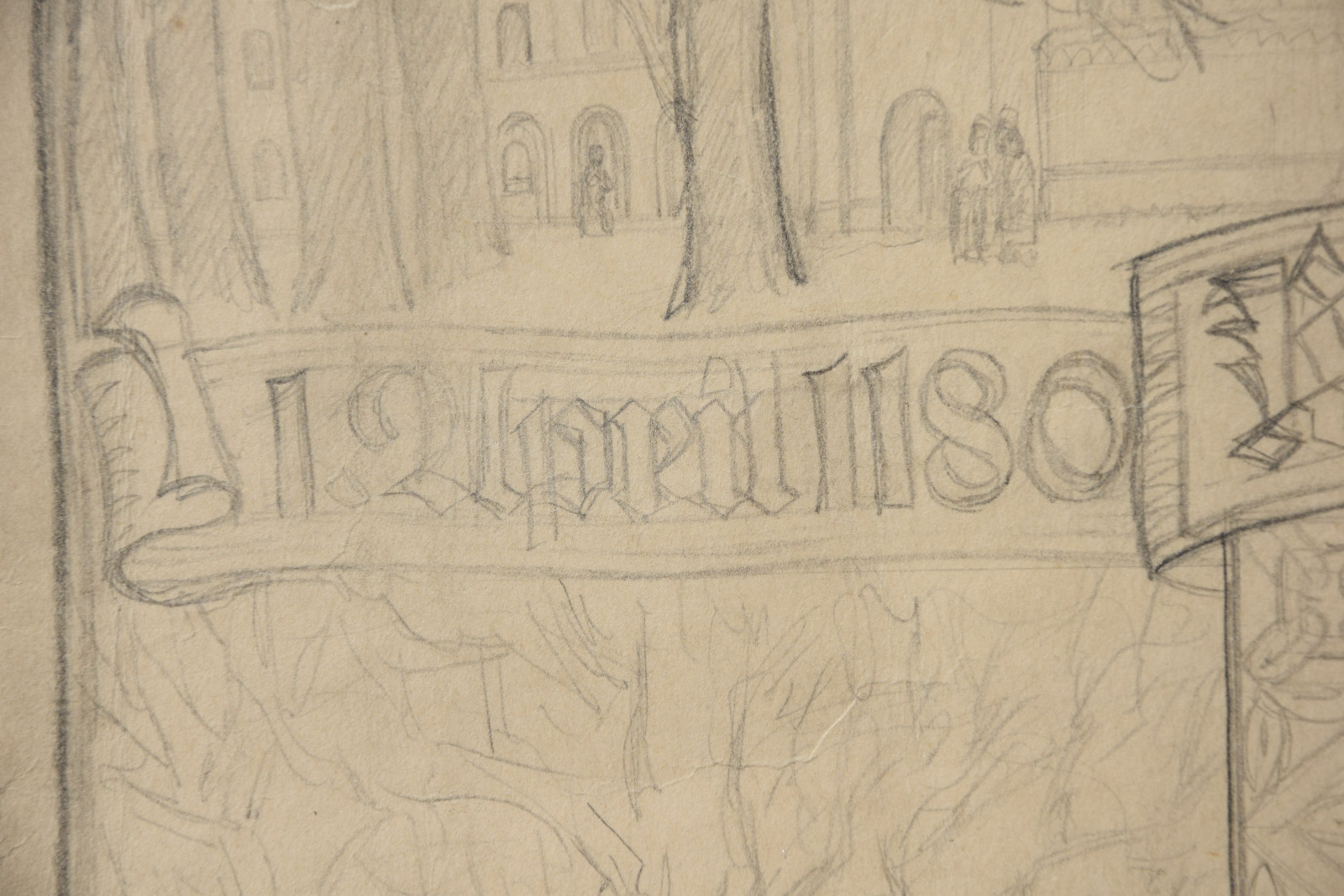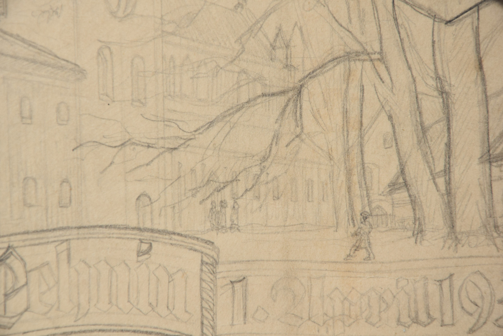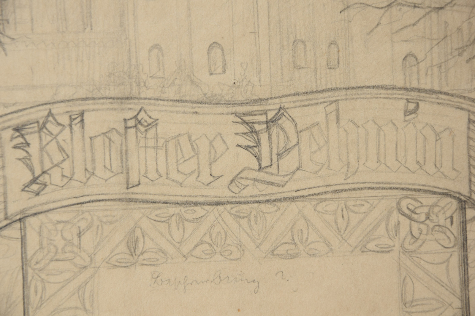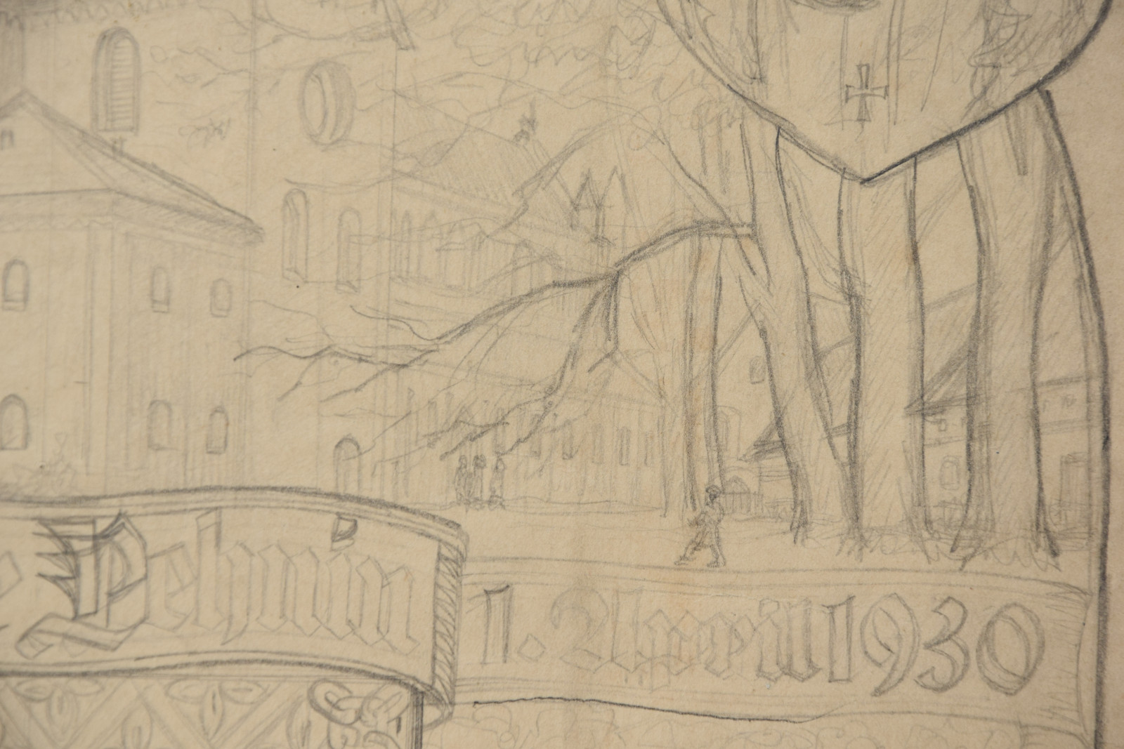 Die vorliegende Zeichnung wird Kraska im Vorfeld der 750-Jahrfeier zum Bestehen des, südwestlich von Potsdam gelegenen, Klosters Lehnin geschaffen haben. In der Bildmitte zeigt sich das Kloster, links oben und unten der Klosterstifter Otto I., sowie rechts oben und unten der erste Klosterabt Sibold/Sybold. Womöglich war die Zeichnung als Entwurf für eine Illustration angelegt.