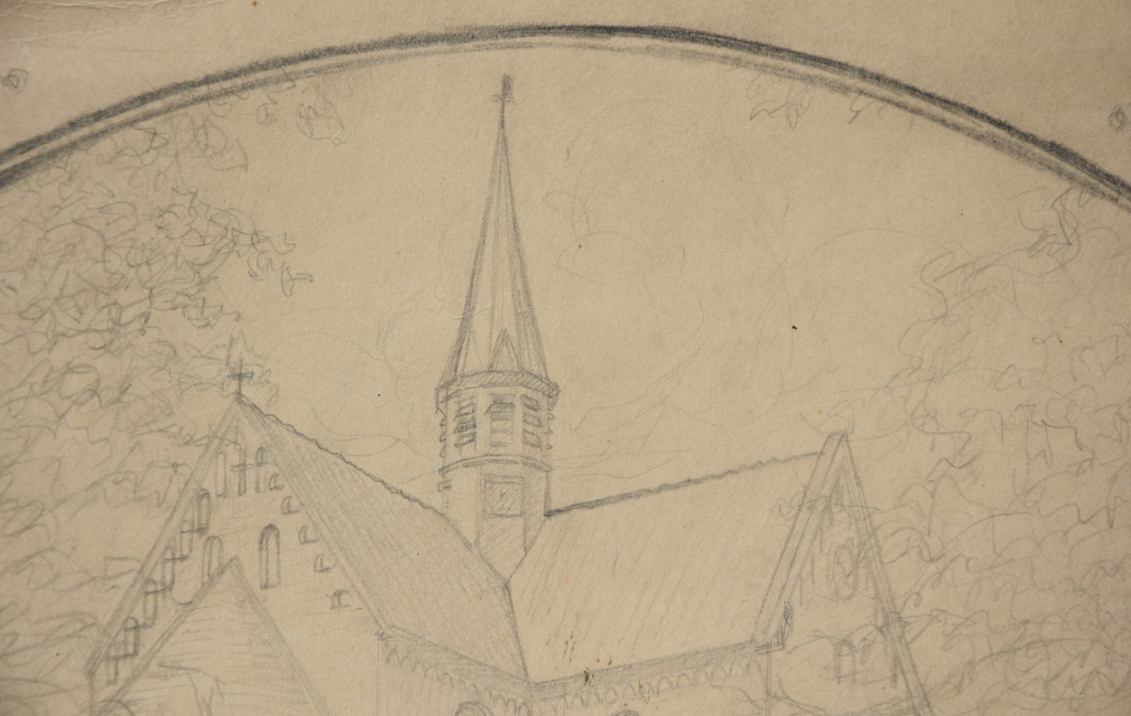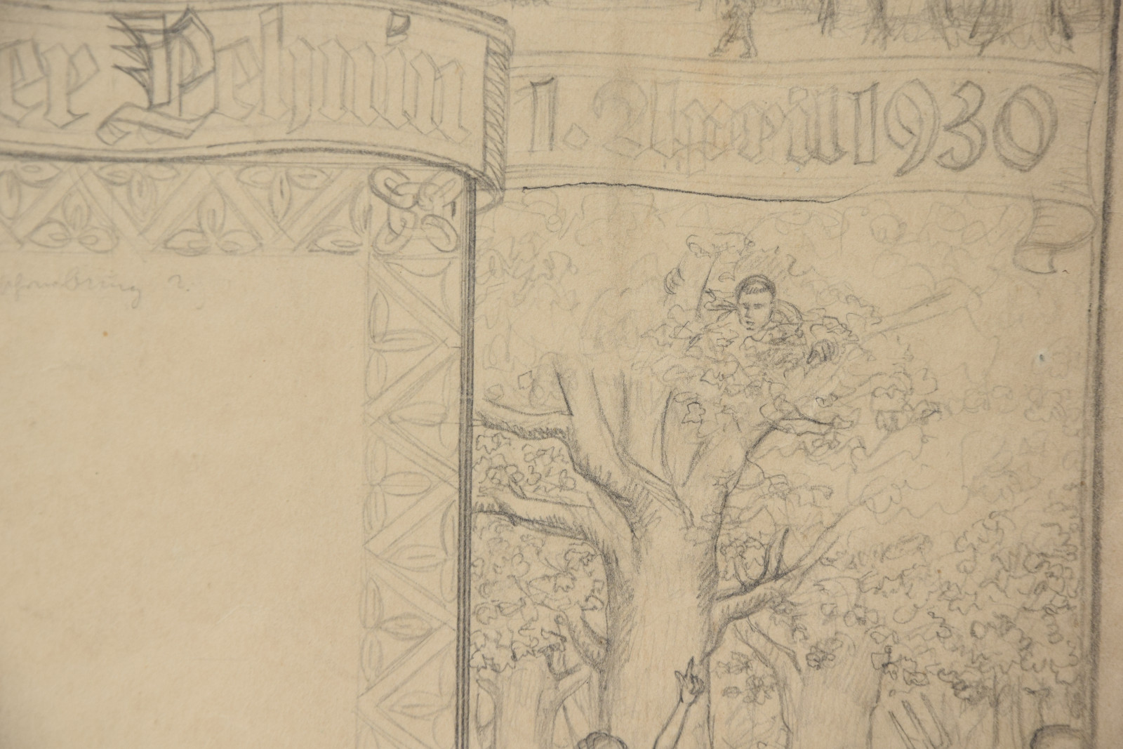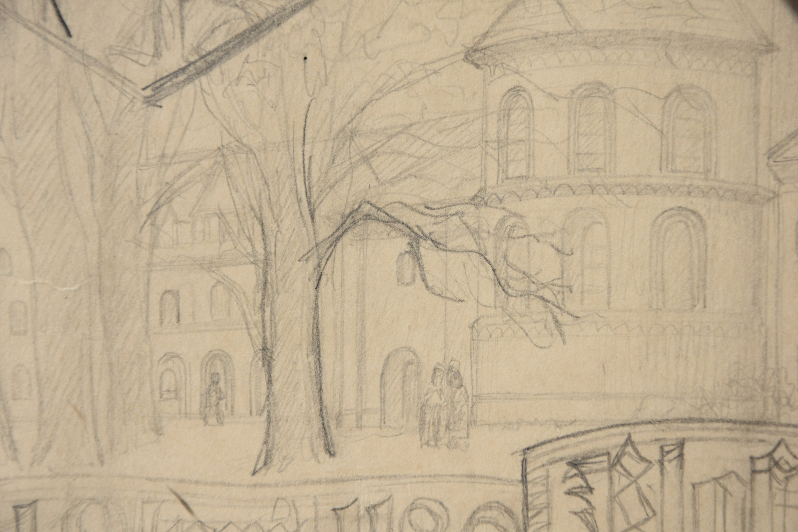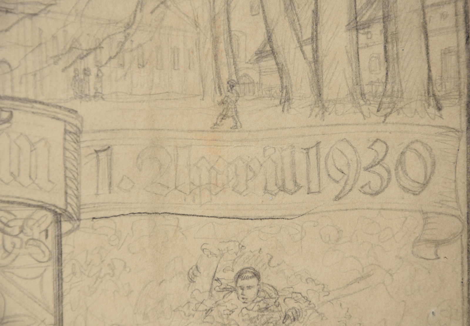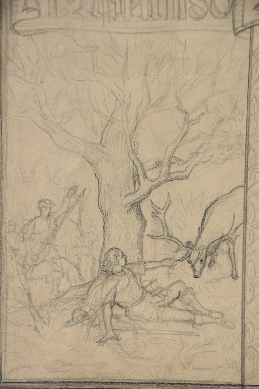 Die vorliegende Zeichnung wird Kraska im Vorfeld der 750-Jahrfeier zum Bestehen des, südwestlich von Potsdam gelegenen, Klosters Lehnin geschaffen haben. In der Bildmitte zeigt sich das Kloster, links oben und unten der Klosterstifter Otto I., sowie rechts oben und unten der erste Klosterabt Sibold/Sybold. Womöglich war die Zeichnung als Entwurf für eine Illustration angelegt.