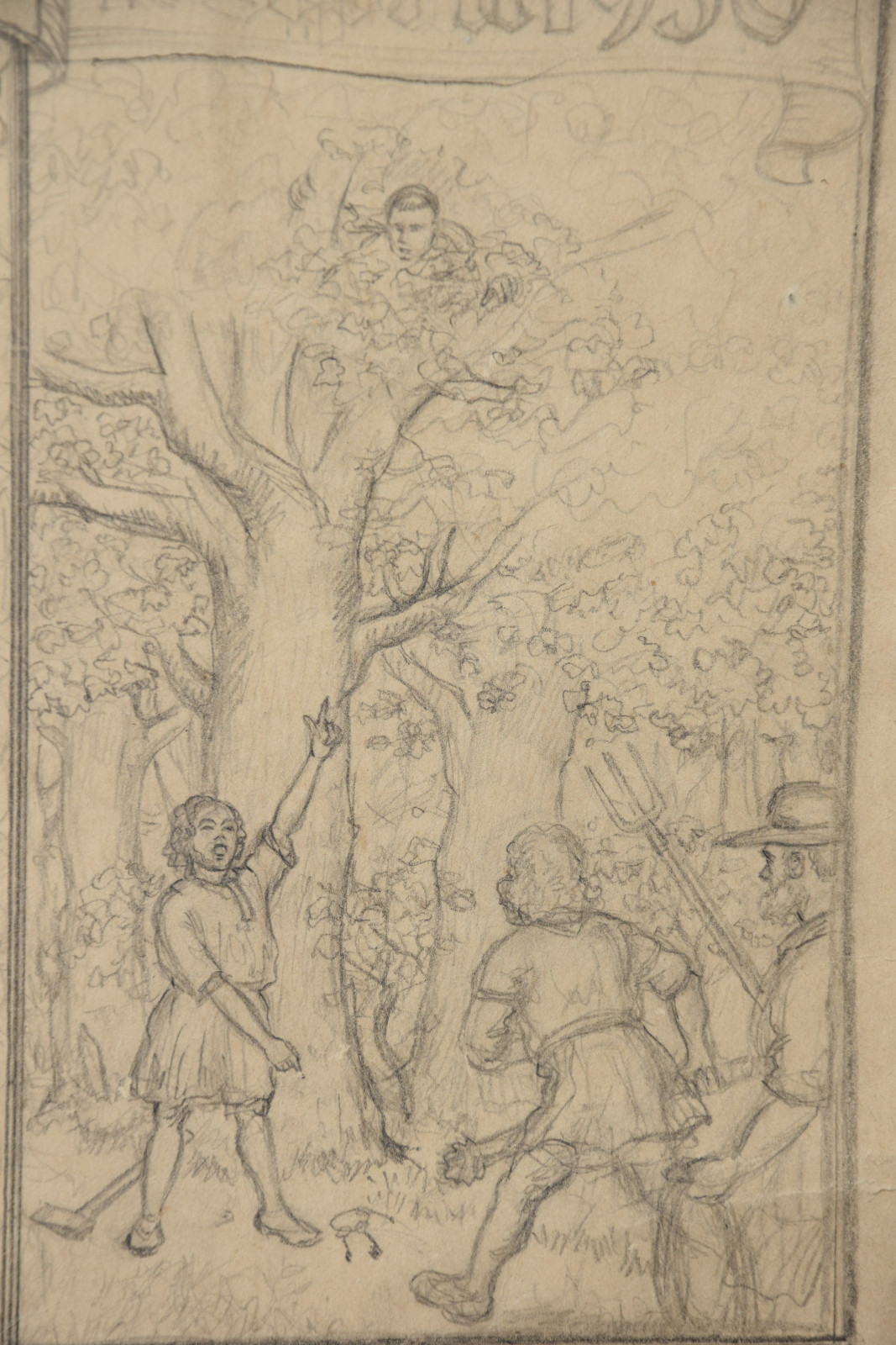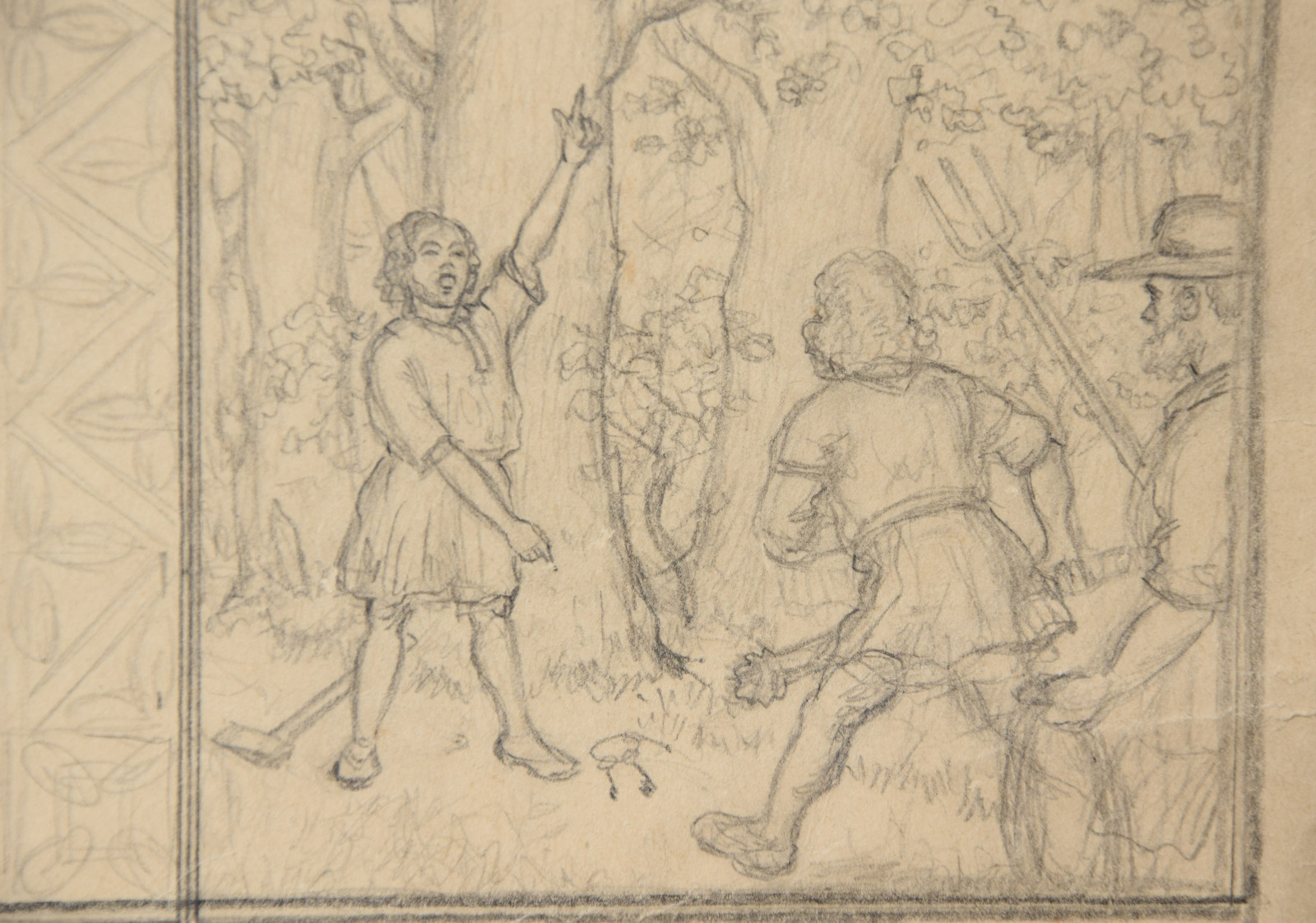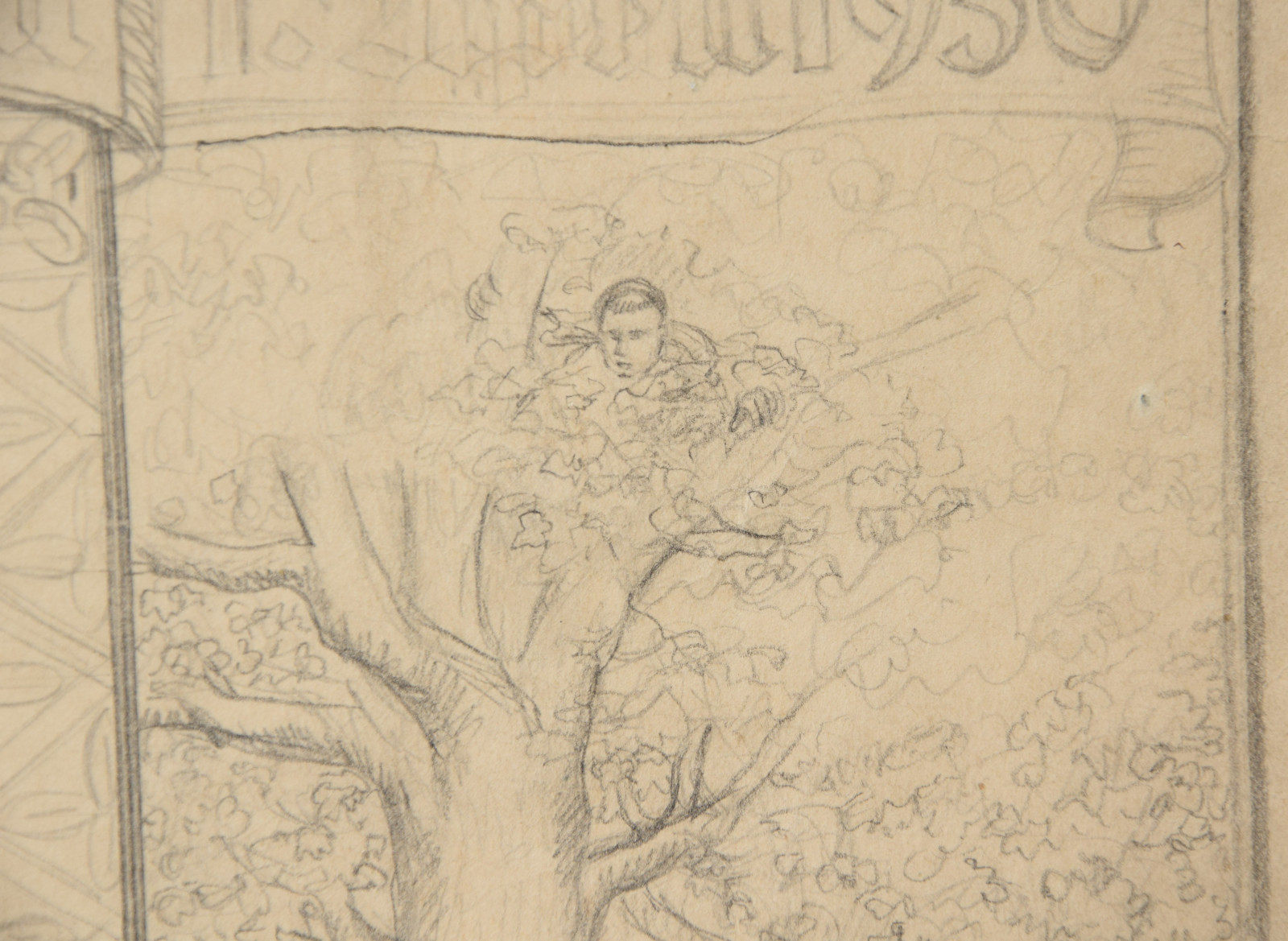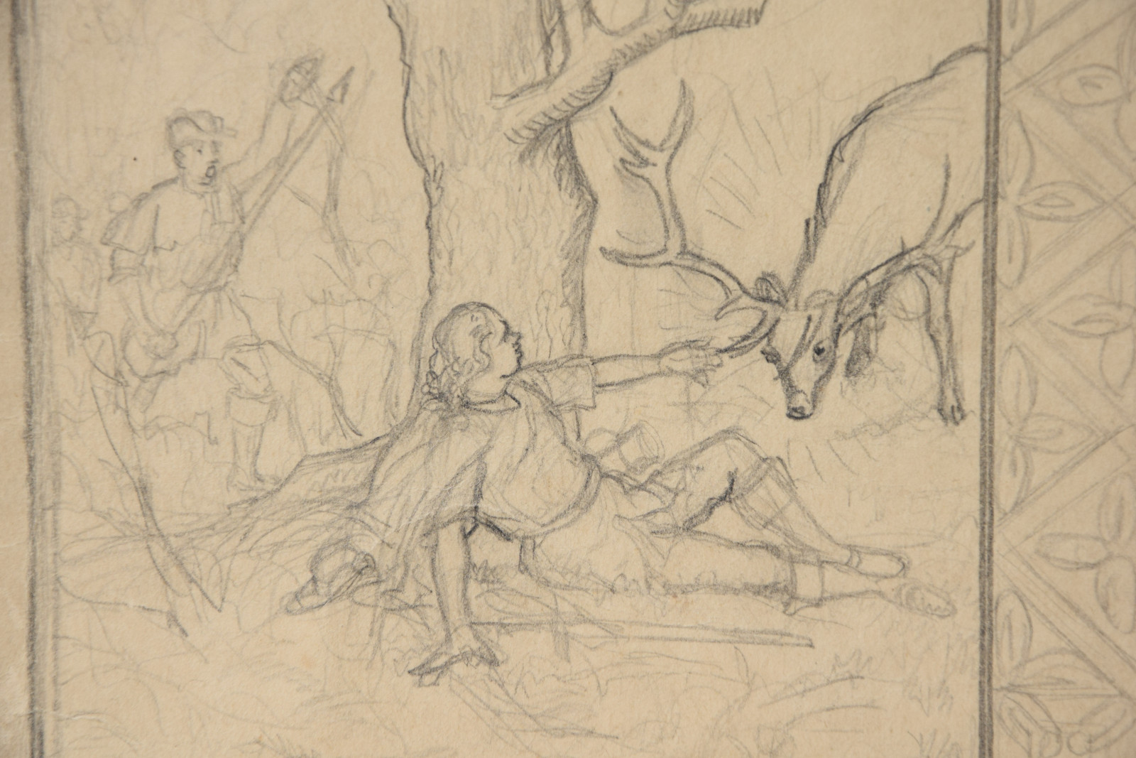Die vorliegende Zeichnung wird Kraska im Vorfeld der 750-Jahrfeier zum Bestehen des, südwestlich von Potsdam gelegenen, Klosters Lehnin geschaffen haben. In der Bildmitte zeigt sich das Kloster, links oben und unten der Klosterstifter Otto I., sowie rechts oben und unten der erste Klosterabt Sibold/Sybold. Womöglich war die Zeichnung als Entwurf für eine Illustration angelegt.