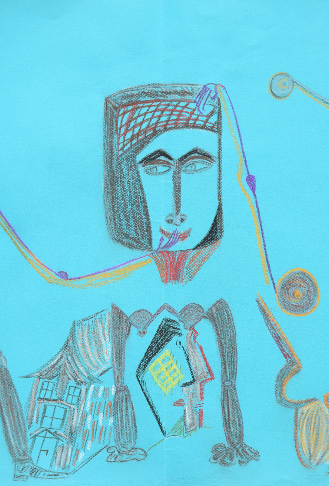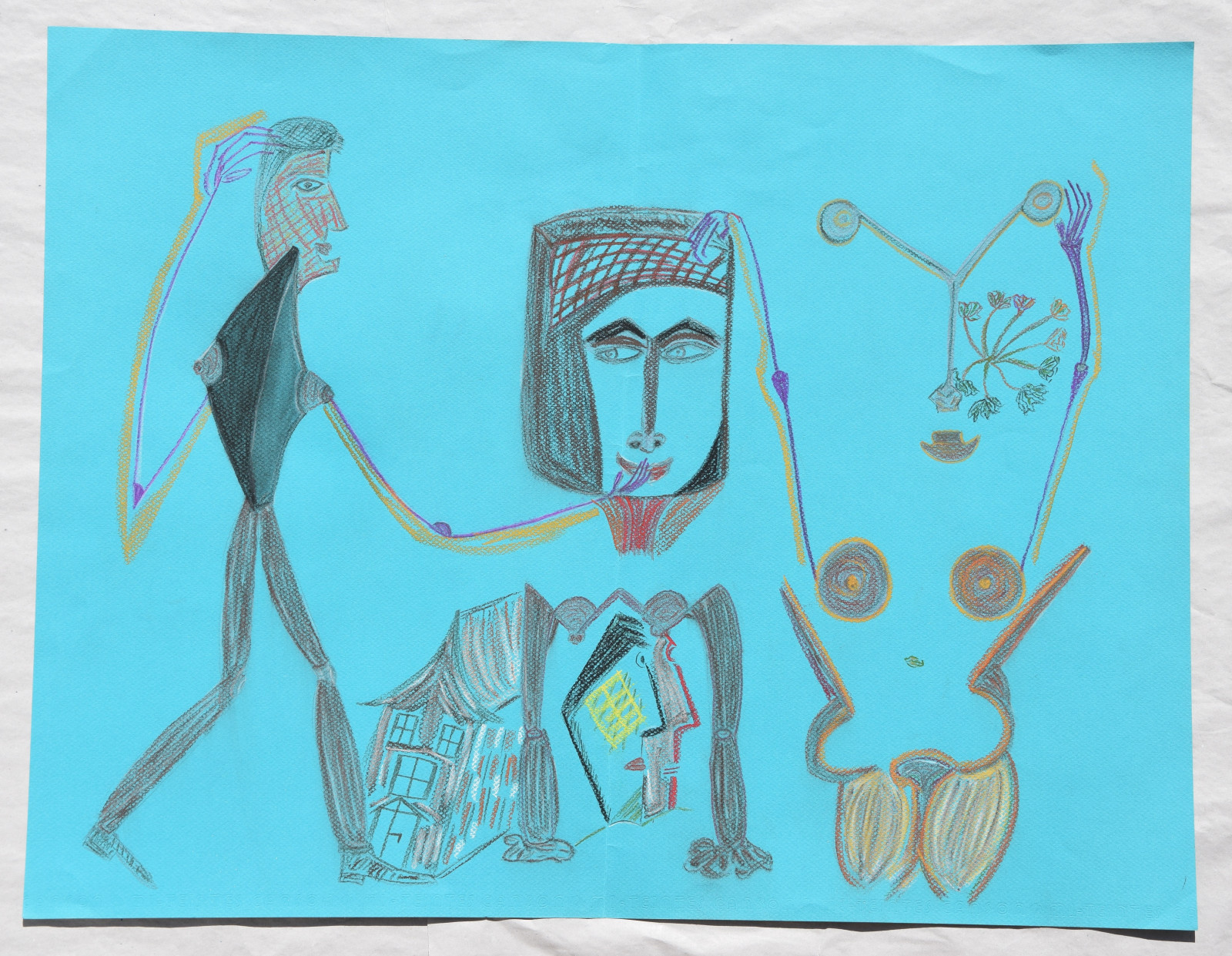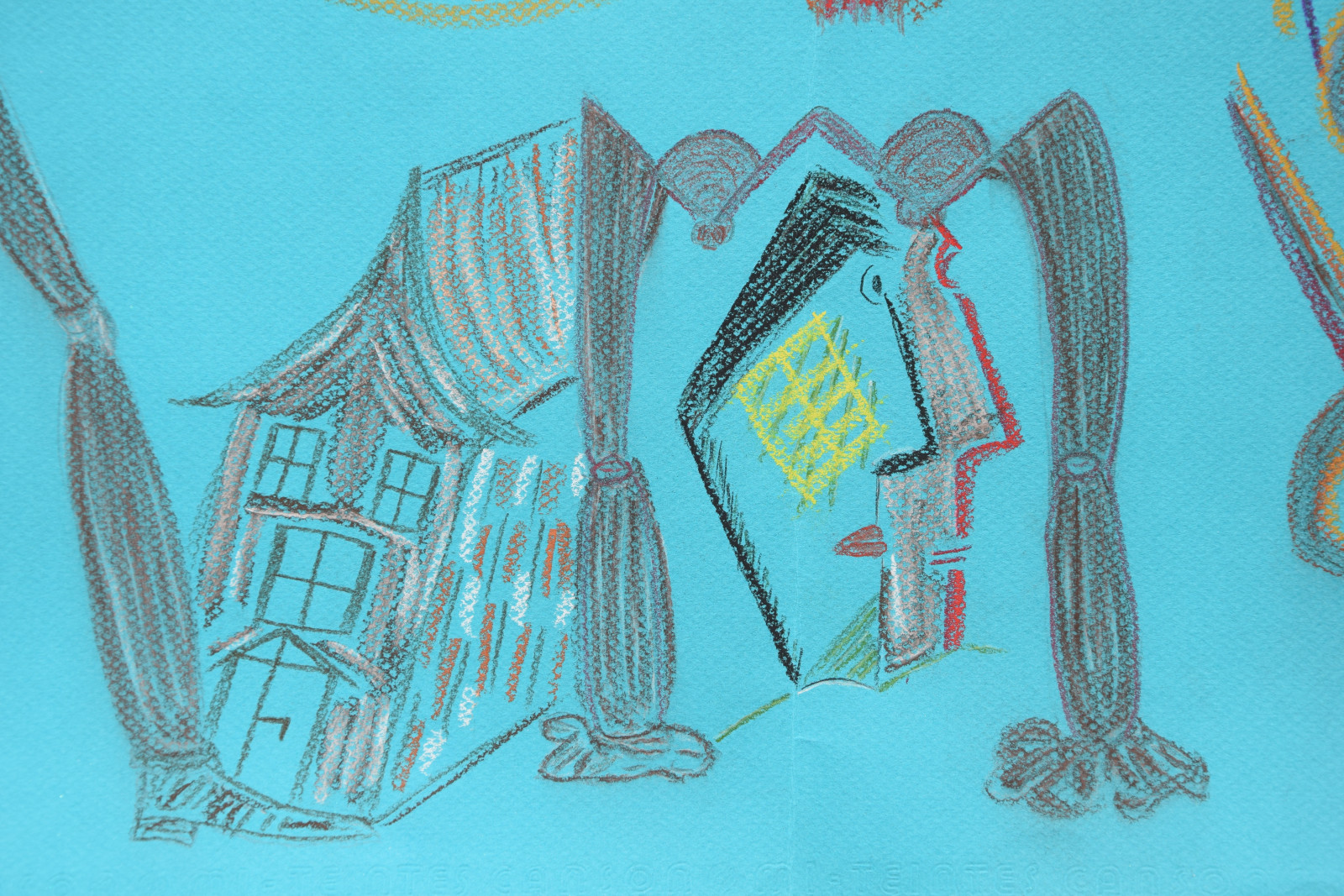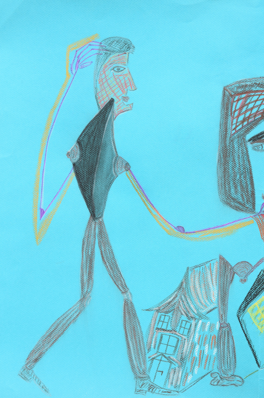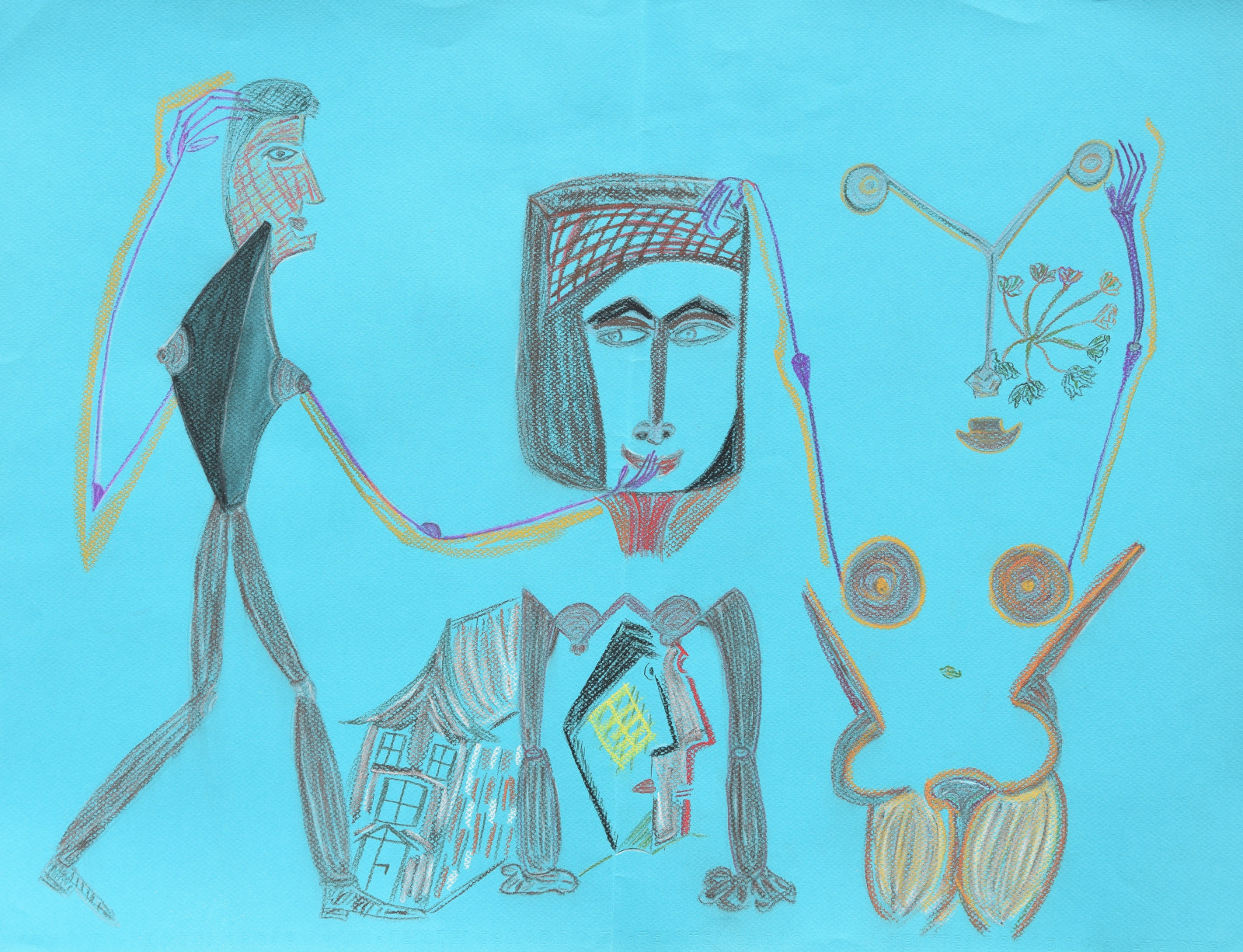 ohne Titel [figürliche Darstellung mit einem Mann, weiblichem Kopf und auf dem Kopf stehendem weiblichen Torso, am unteren Rand ein Haus mit weiteren Köpfen]
