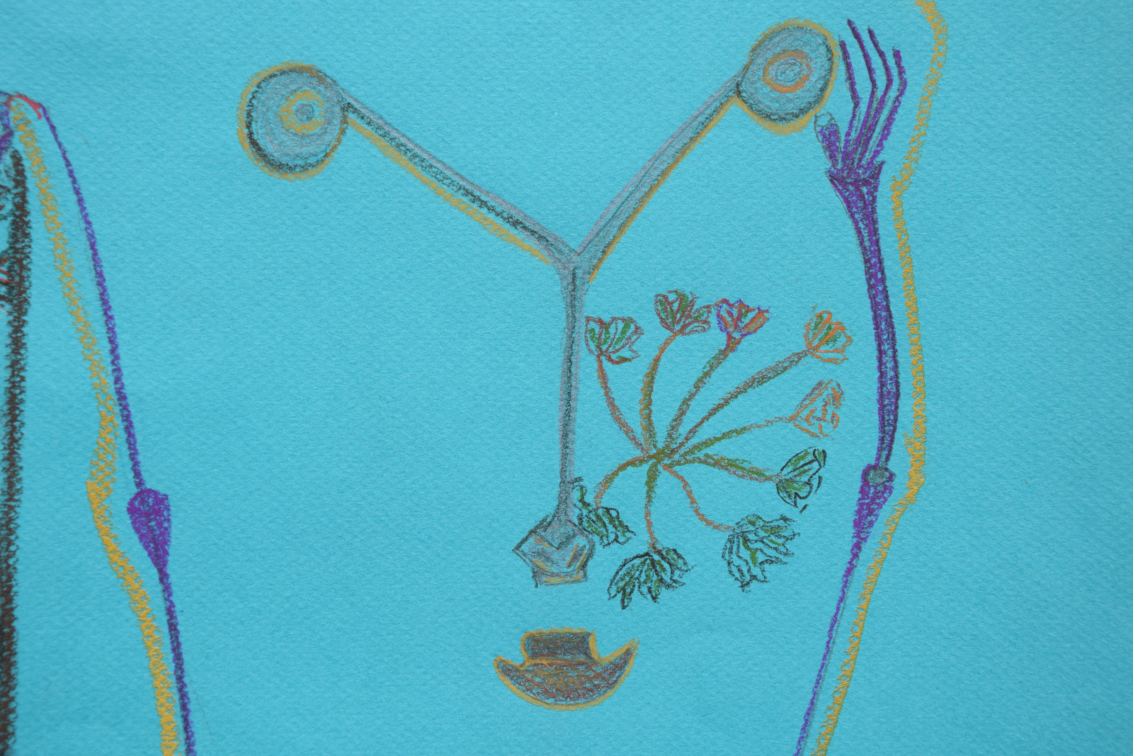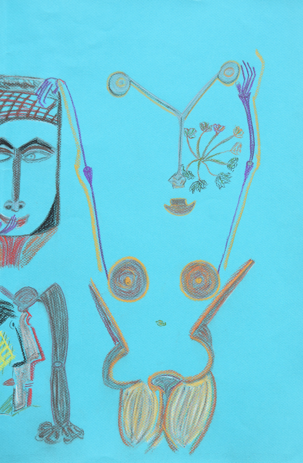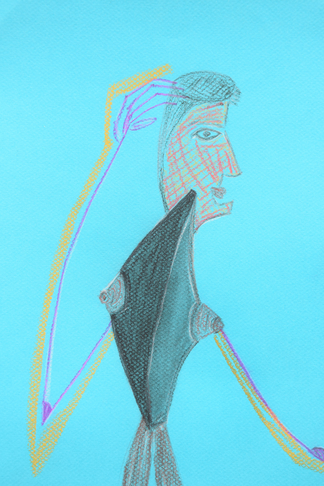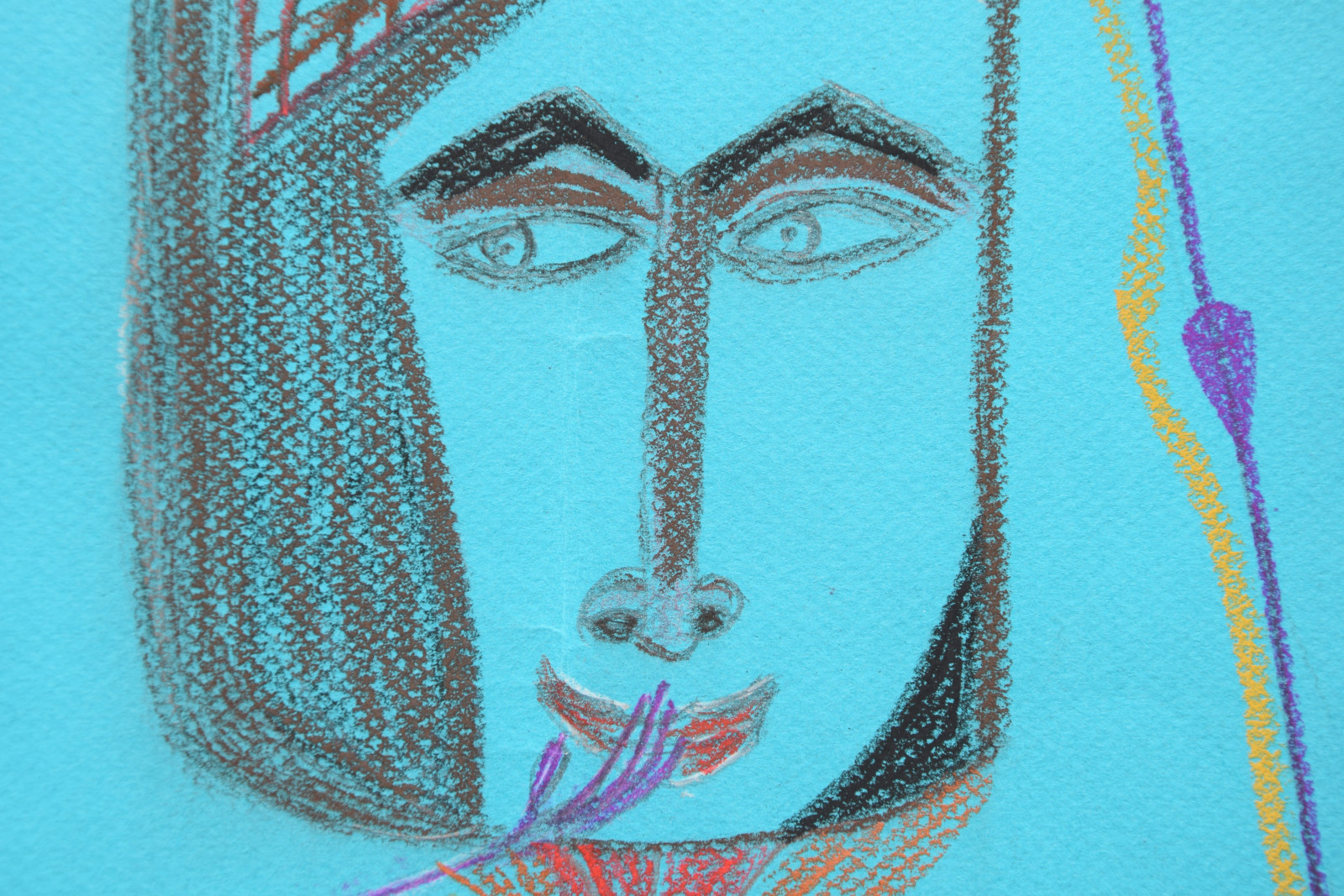 Farbkreiden, Buntstifte auf bläuichem Zeichenkarton („Canson Mi-Teintes“)