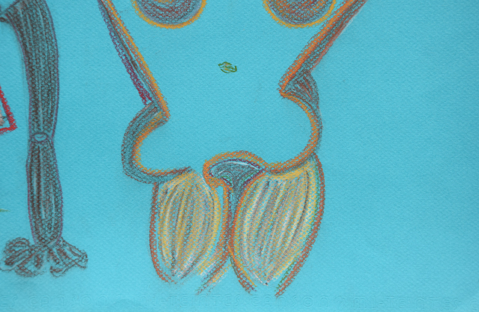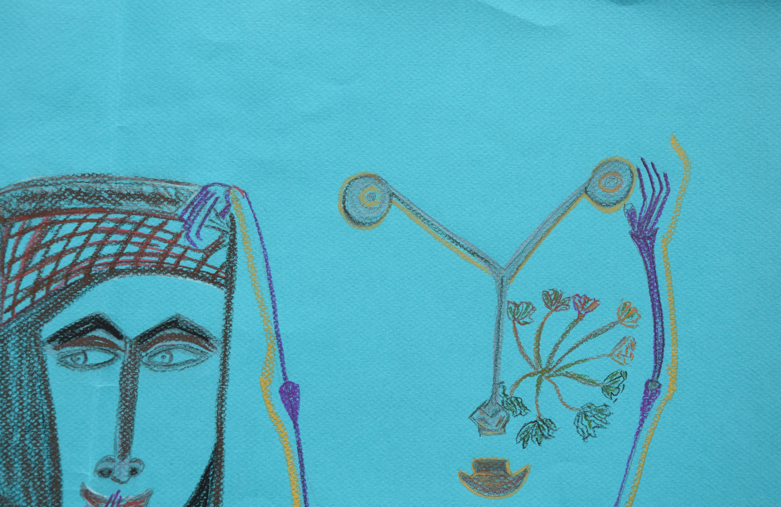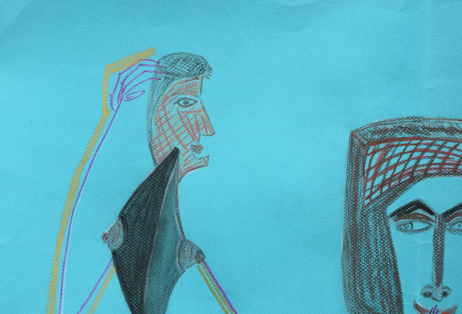 Farbkreiden, Buntstifte auf bläuichem Zeichenkarton („Canson Mi-Teintes“)