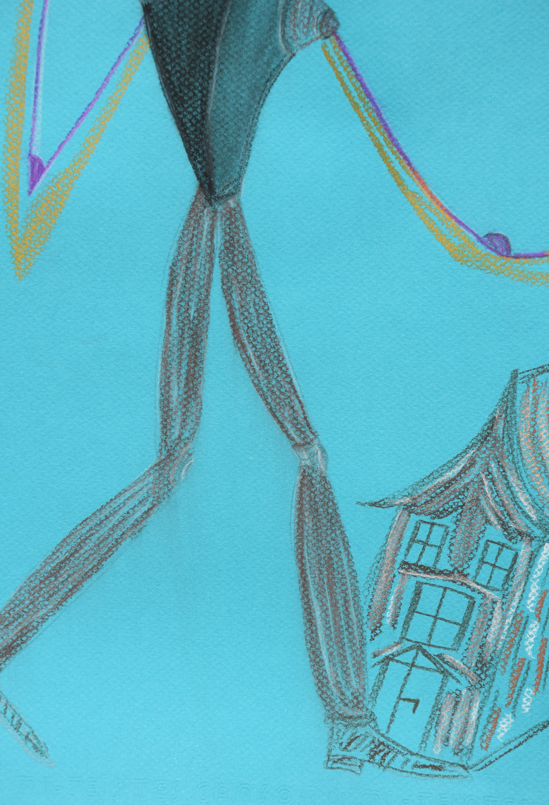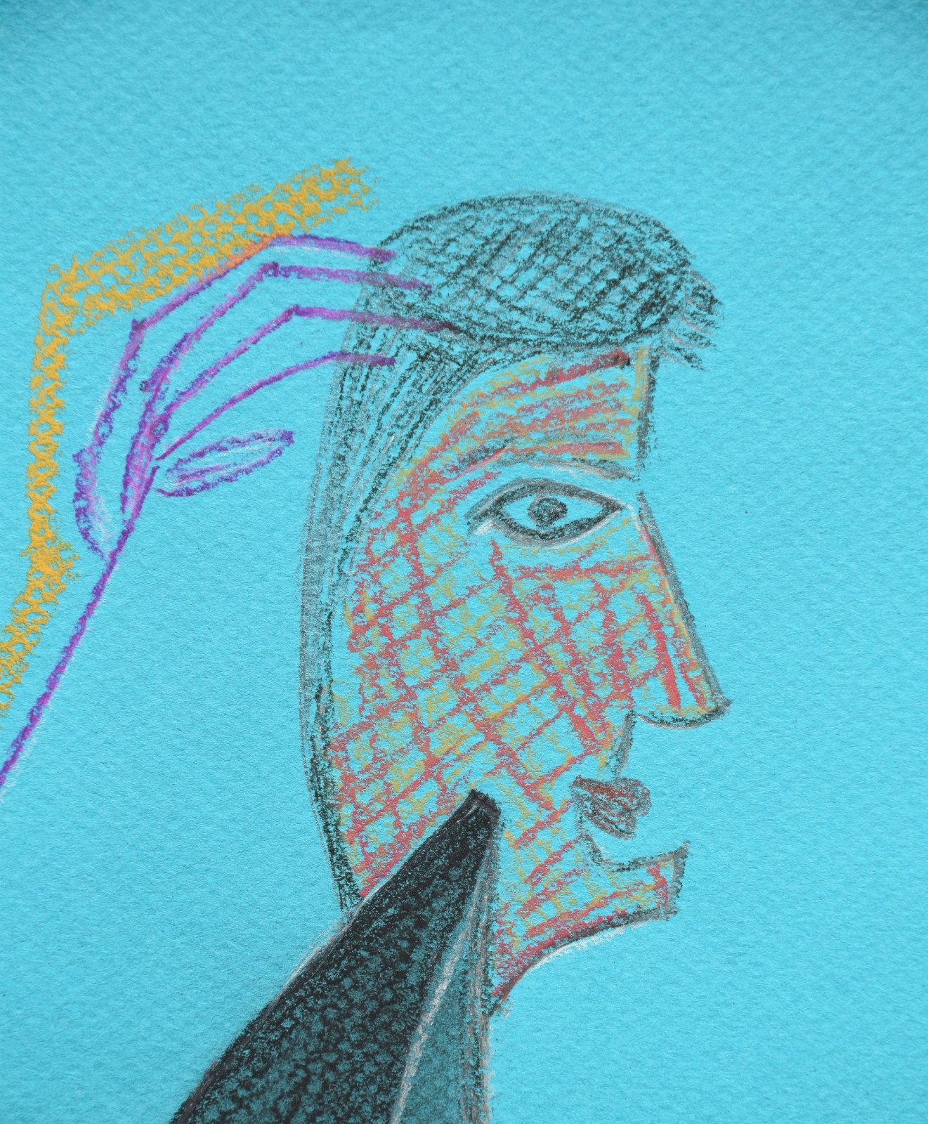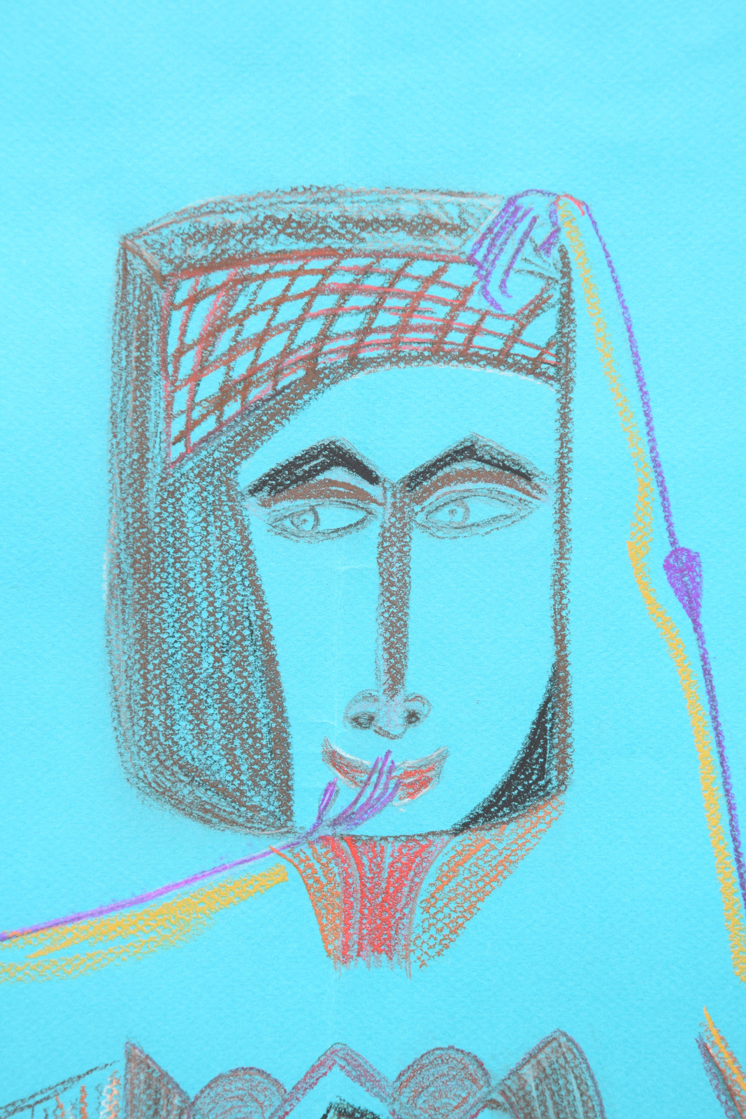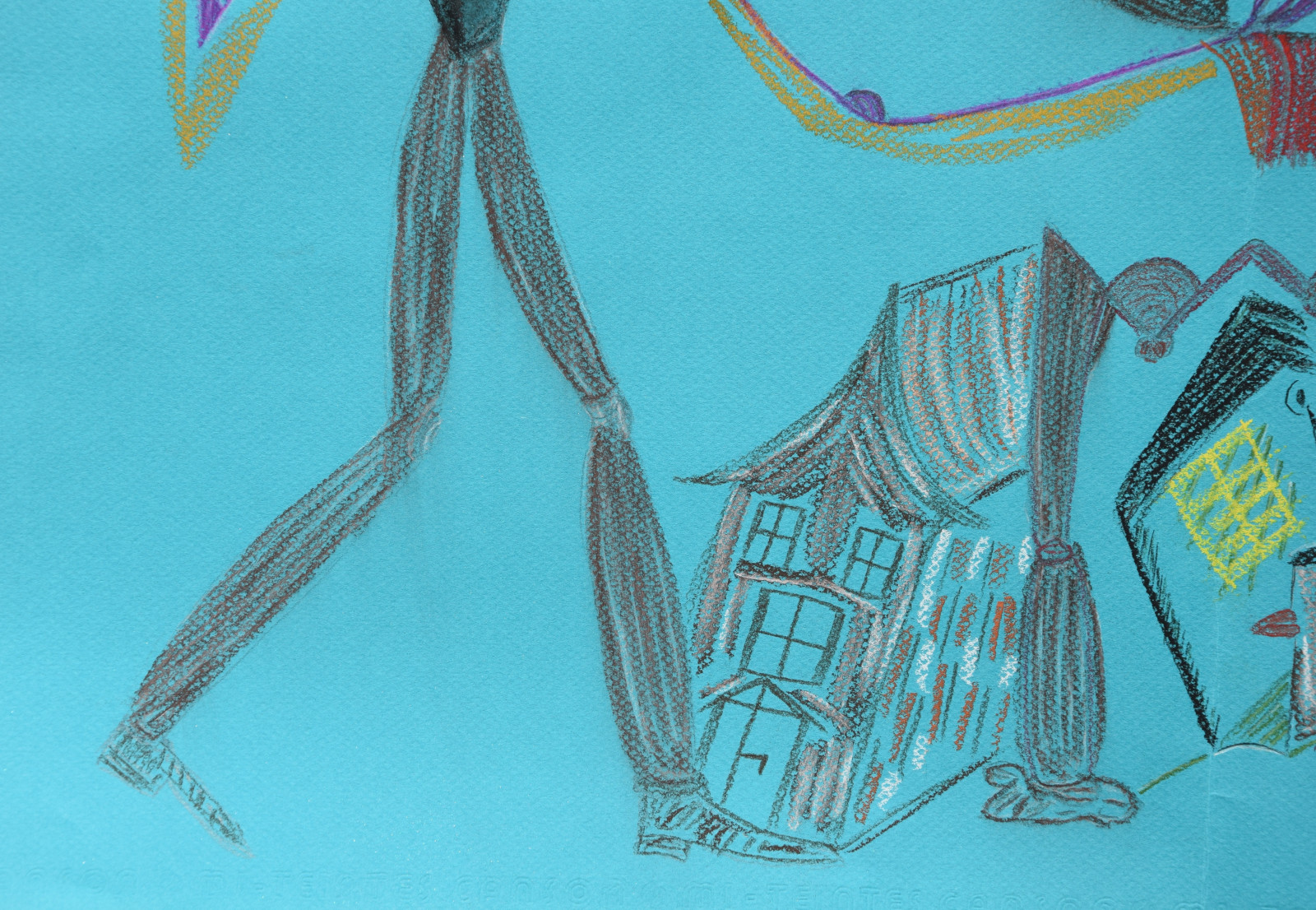 Farbkreiden, Buntstifte auf bläuichem Zeichenkarton („Canson Mi-Teintes“)