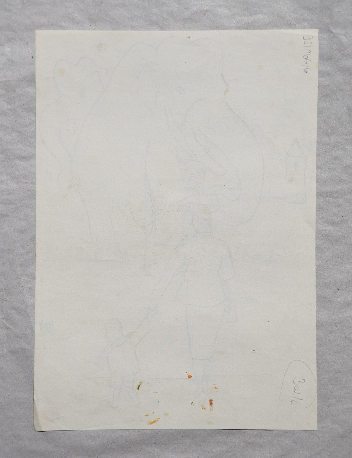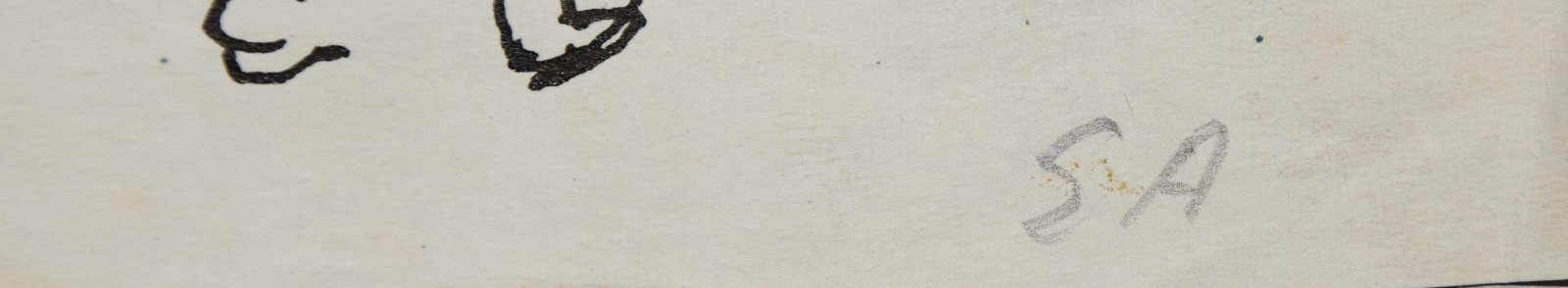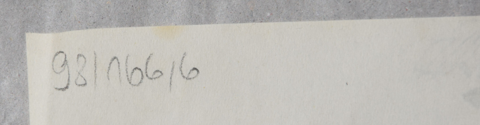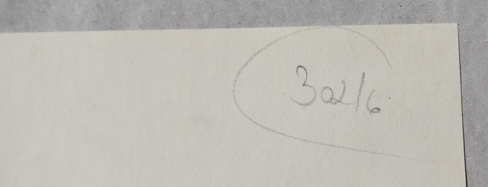 leichte Druckstellen im Blatt; Ecken leicht bestoßen; schwach (stock-)fleckig; am oberen Rand mittig kleines Einstichlöchlein; verso in den rechten beiden Ecken in Blei bez. / nummer., sowie verso fleckig