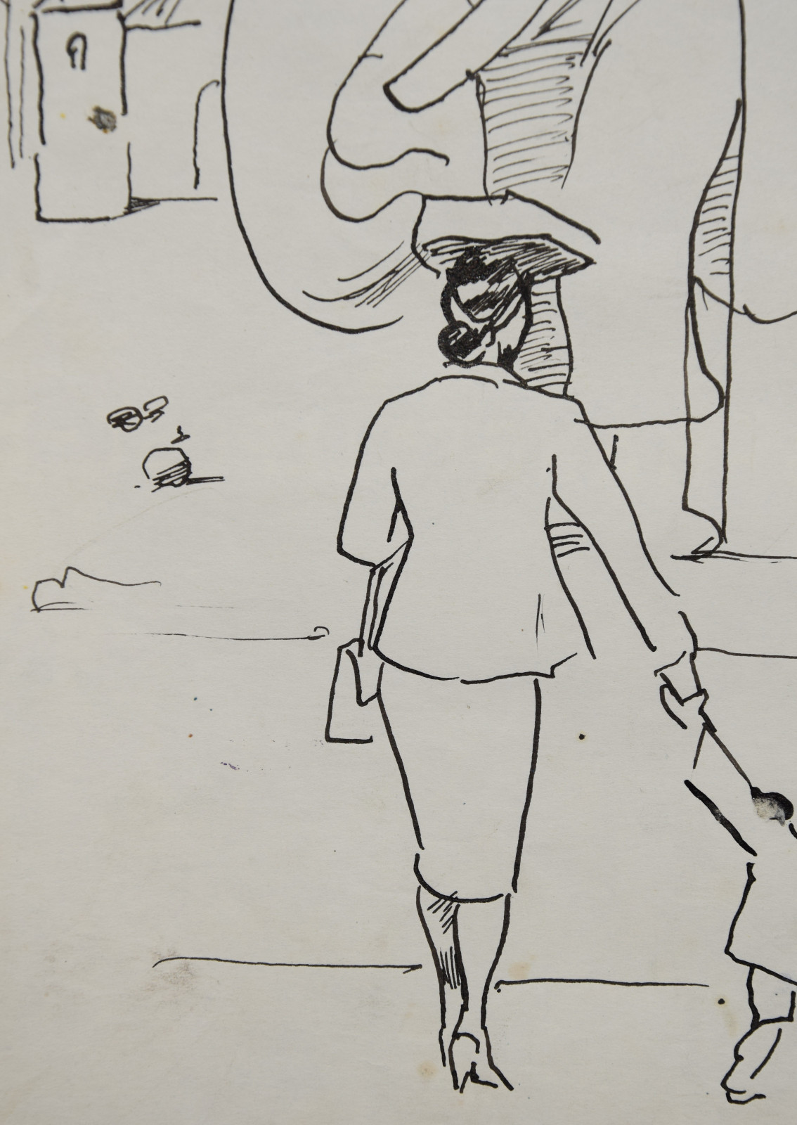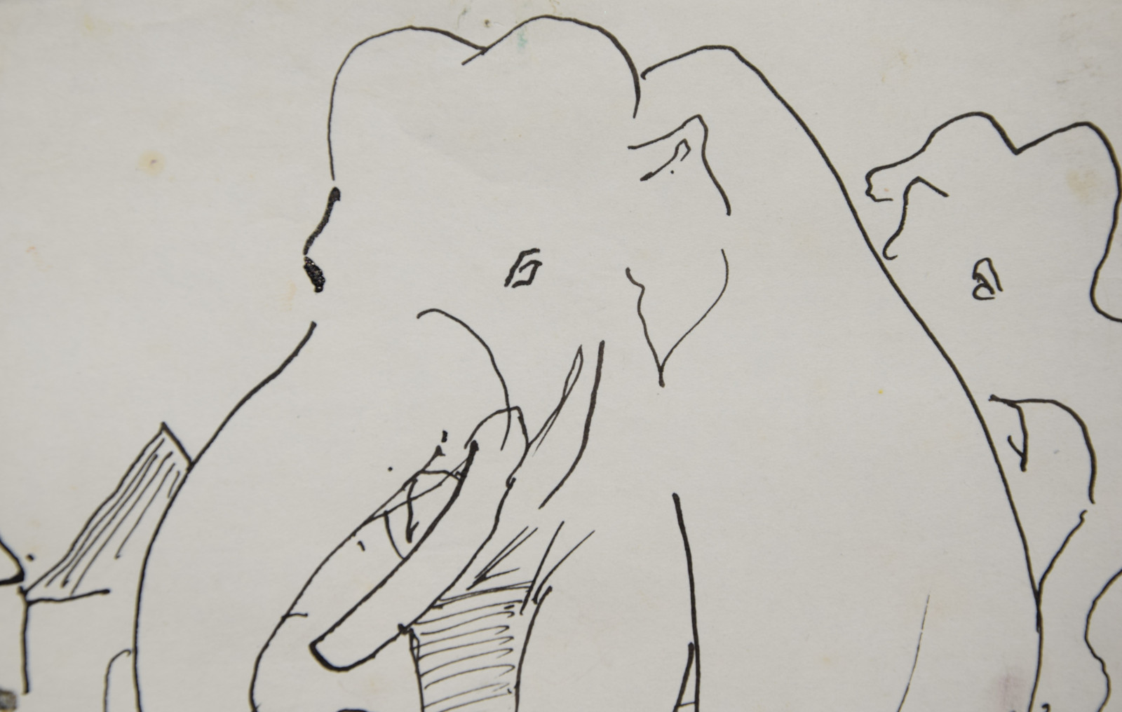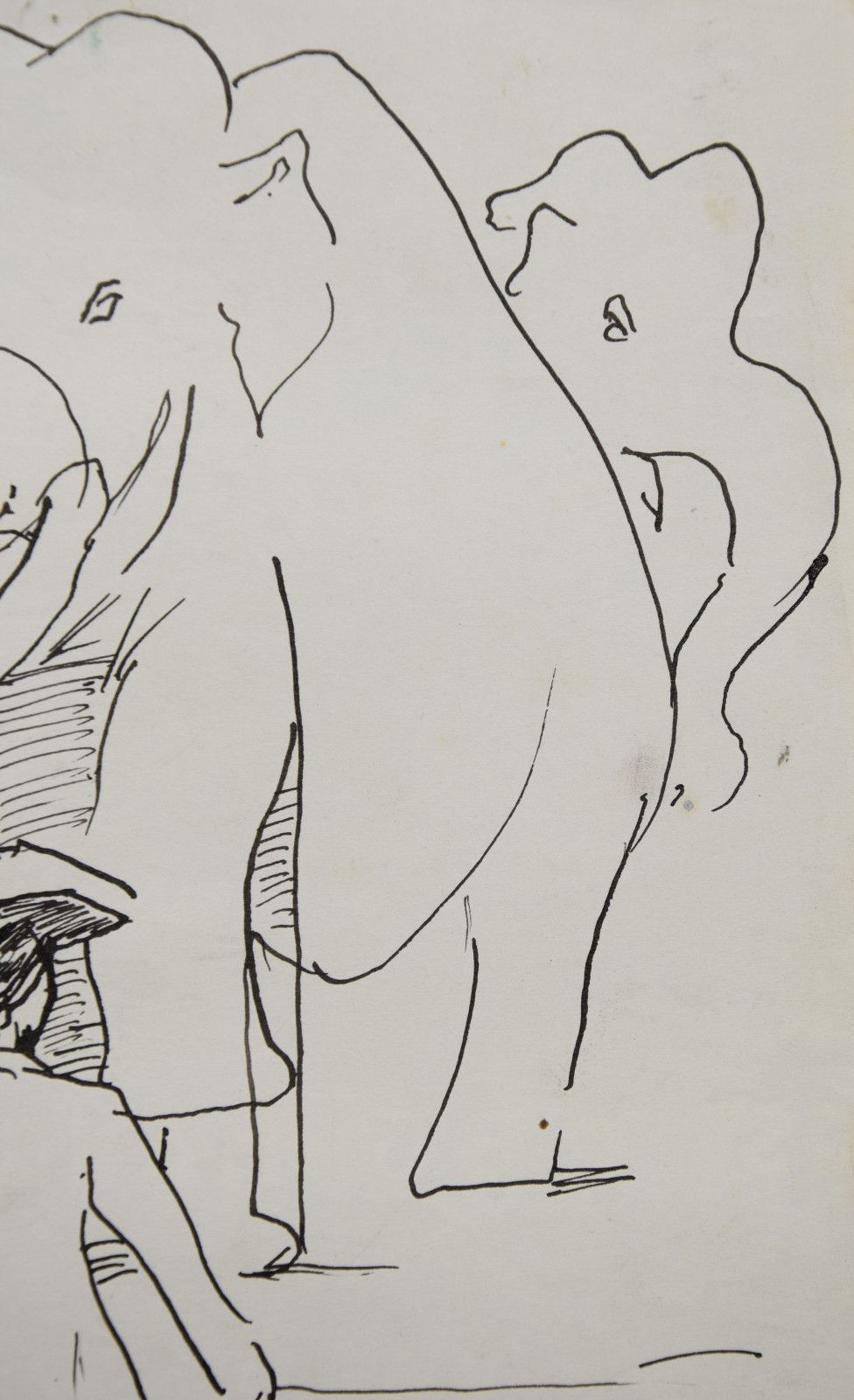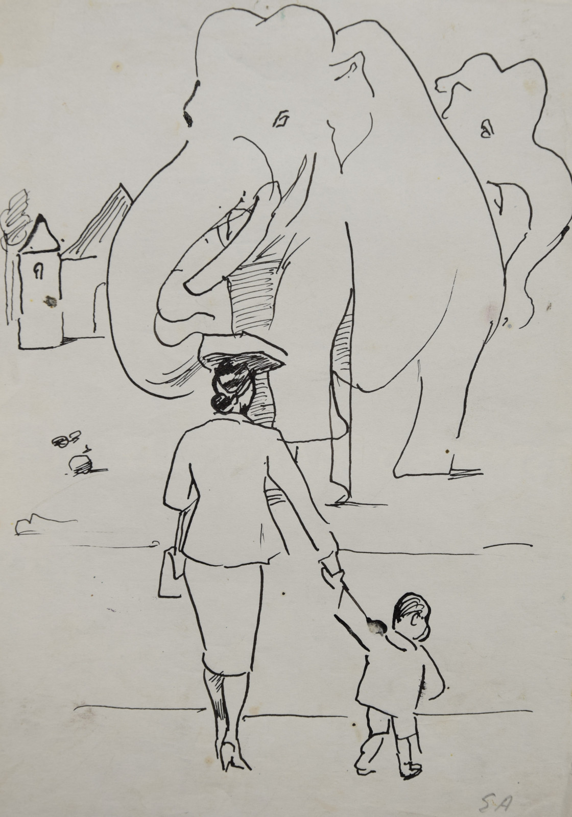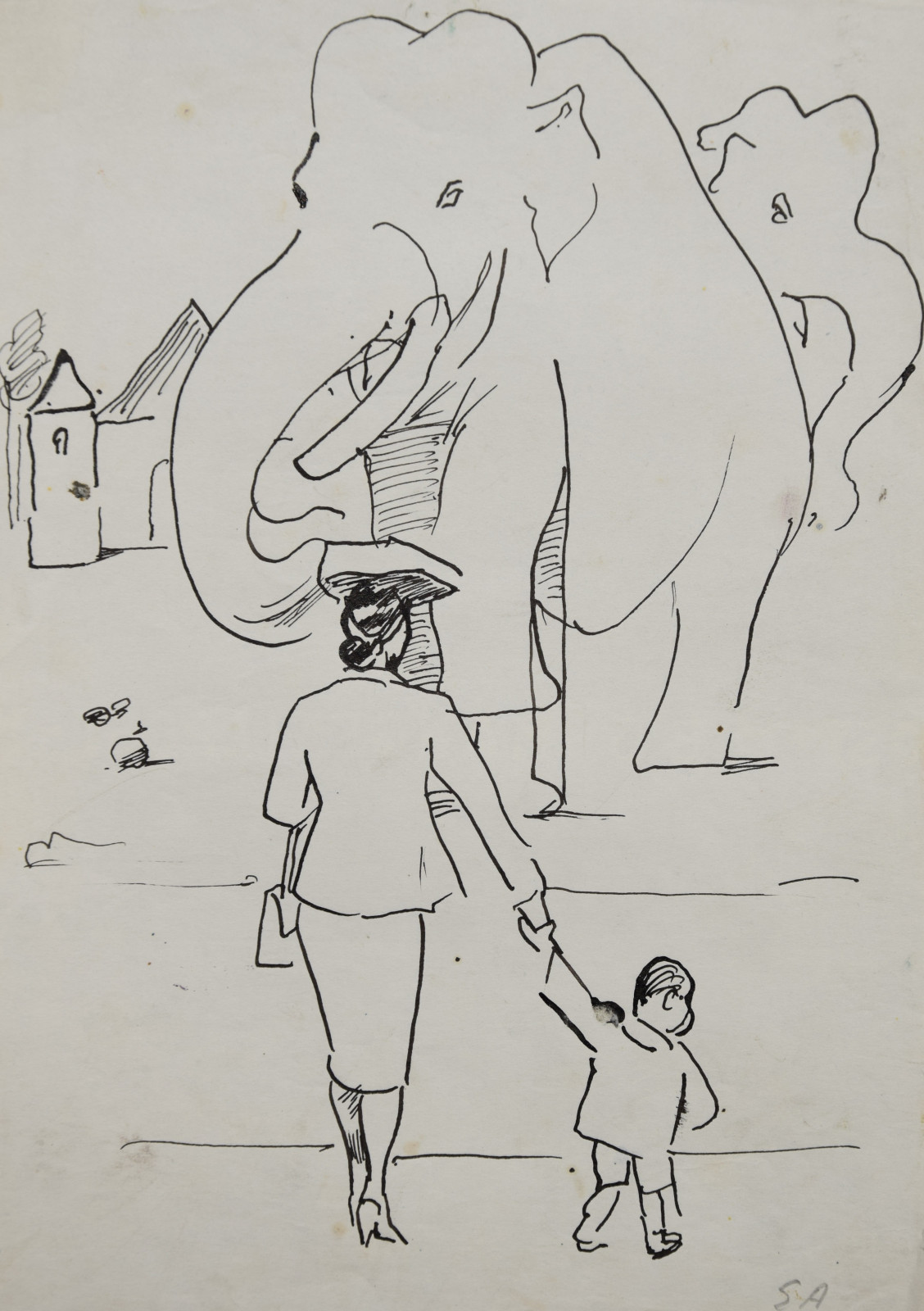 ohne Titel [zwei Elefanten in einem Tierpark mit zwei Besuchern (Mutter und Kind) im Vordergrund]